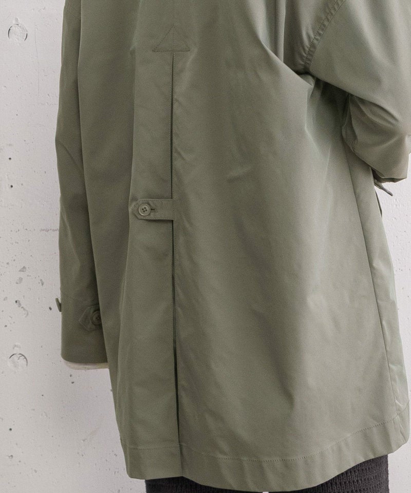 コットンナイロンの軽いツイル素材で仕立てたステンカラーコート。微光沢のある素材感が、カジュアルなコーディネートをさりげなくアップデートしてくれます。ヒップが隠れるミドル丈で、きれいなAラインシルエットに仕上げました。台衿部分と袖口裏には配色をあしらい、ちらりと見えたときのアクセントに。袖口は広めの作りで、ベルトでシルエットの調整も可能です。