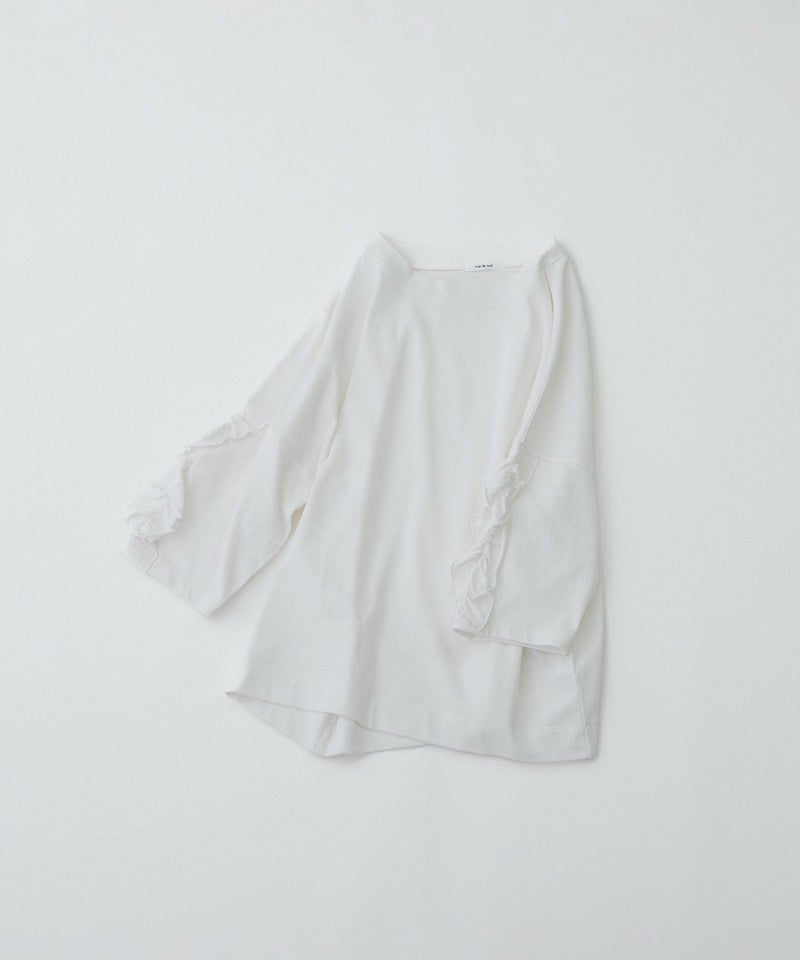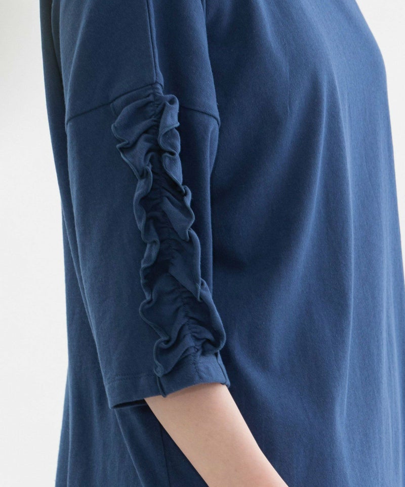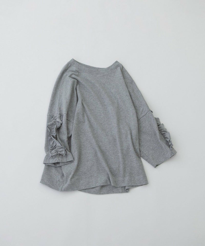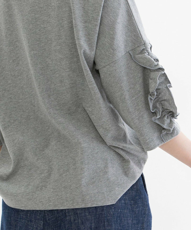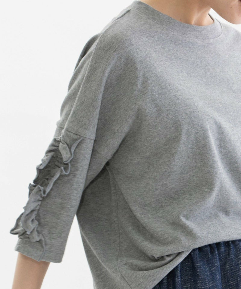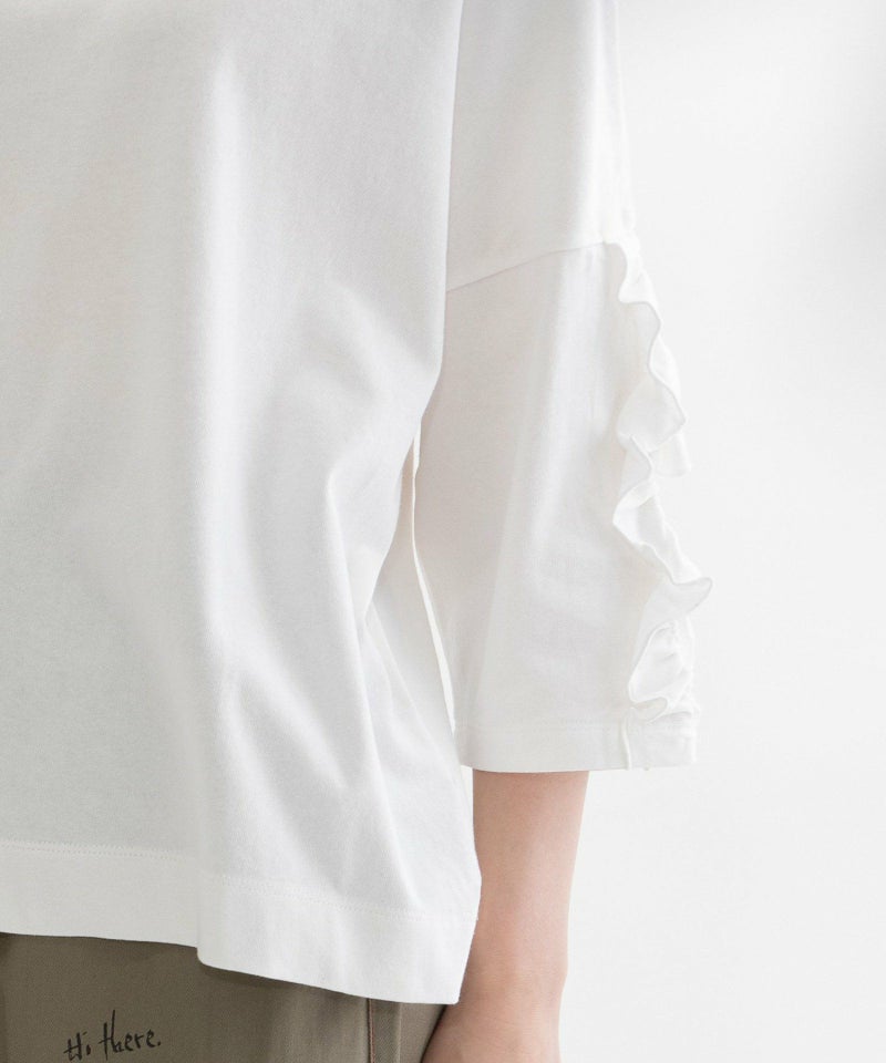 袖にフリルをあしらったデザインが目を惹くTシャツ。素材はUSAコットンを使用した天竺生地を採用。空紡糸ならではのドライな肌触りと、ほんのりゴワっとした質感が特徴です。厚みがあり、透け感も少ないため1枚でも安心して着用でき、メンズライクな生地感と甘すぎないフリルデザインが絶妙なバランスの1枚です。肘が隠れる6分袖で、ロングシーズン活躍してくれます。