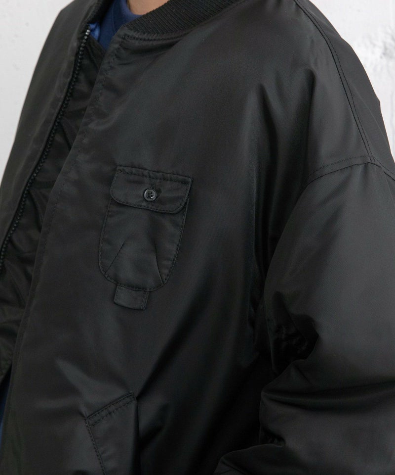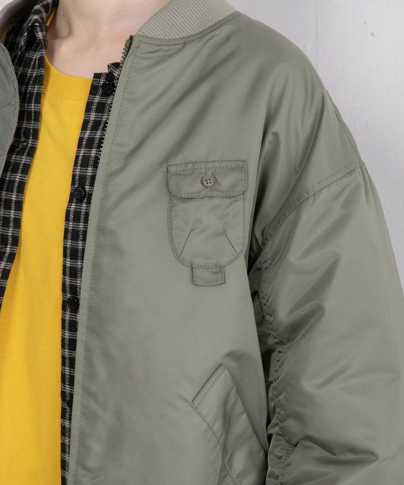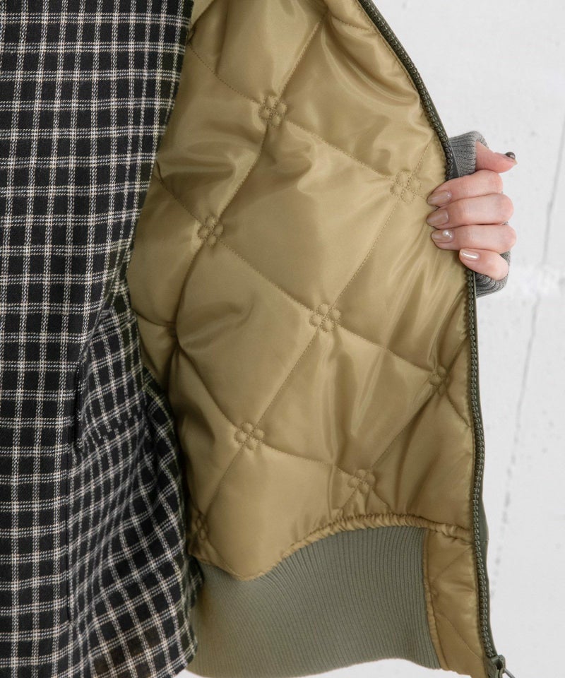 ヴィンテージのフライトジャケットを参考にしたオーバーサイズのMA-1ブルゾン。高密度に織られたツイル素材を使用しています。控え目な光沢感があり、深みのある色合いです。思いっきりカジュアルにスタイリングをするのが今の気分。少し高めにした衿や袖口のリブ切り替えが程よいフィット感。防寒性もあります。少し斜めにつけたアイコニックな立体ポケットは、下側にループをつけているので、キーチャームなどをつけられます。ポイントの配色裏地はダイヤ柄に丸いお花をプラスしたオリジナルのキルティング柄です。