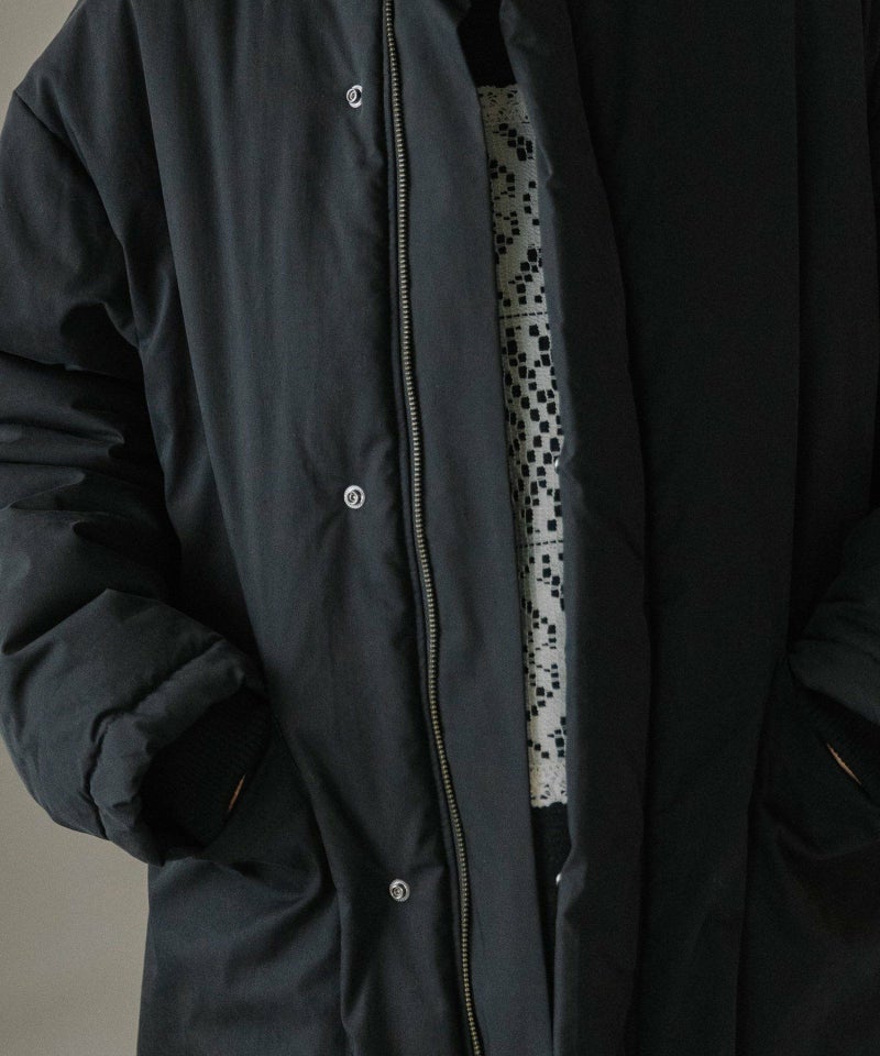 首元を包むハイネックの衿元が暖かな印象のパデット(中綿)コート。衿の裏側にフリース生地を使用しているので肌あたりも優しいです。肩を少し落としたドロップショルダーとすとんと落ちる裾までのシルエットがキレイ。身巾をゆったり取っているので、ニットなども着込みやすいです。袖口をリブにしているので防寒性もあります。コットン見えするので春先の寒い時期にも使いやすいです。