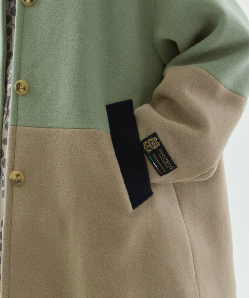 軽く暖かいインポート生地でのステンカラーコート。バイカラーで切り替えたデザインで、しっかりとした二重織でも軽さが特徴的な生地を使用しています。バランスの取りやすいミドル丈コートです。