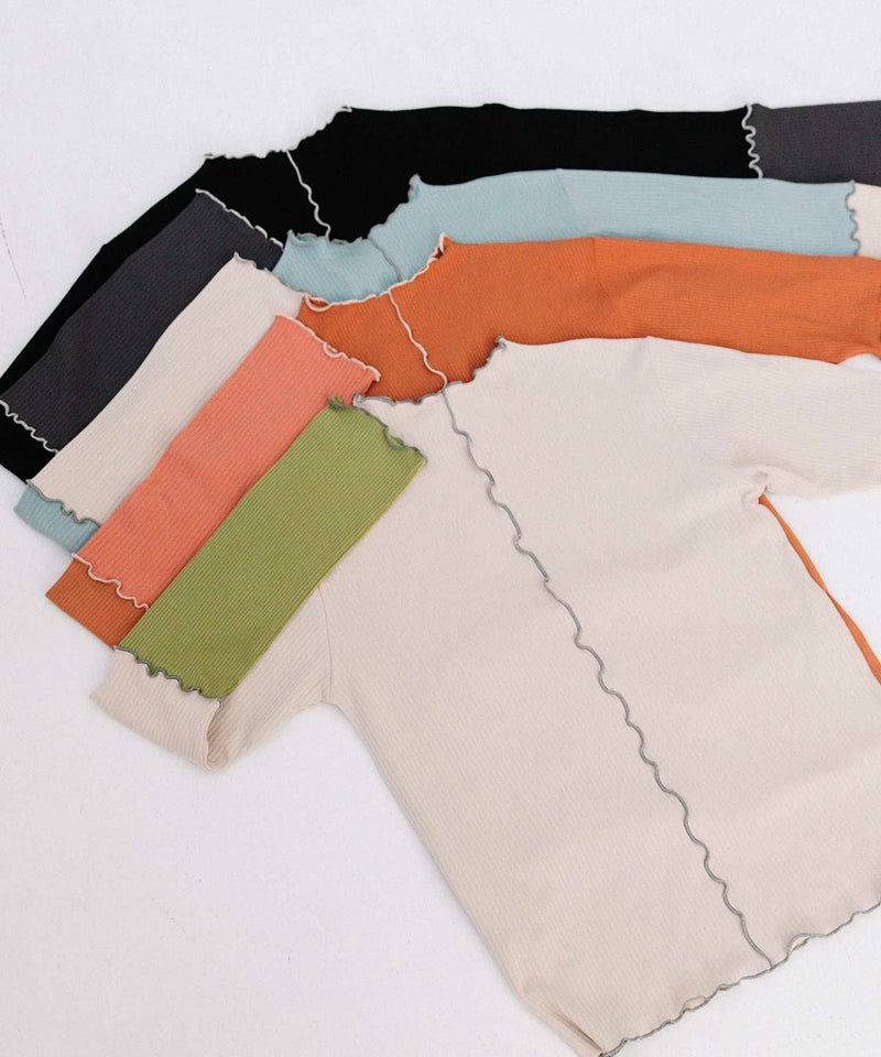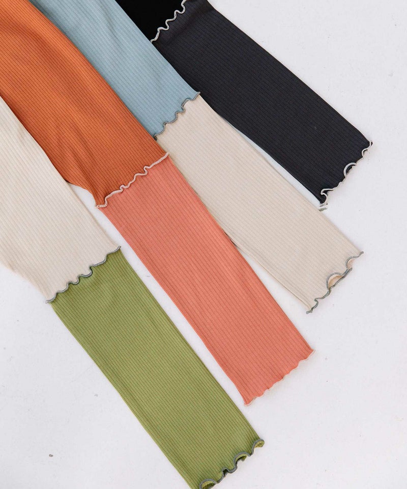 ・やや手が隠れる長めの袖丈で、配色の袖がアームウォーマー見えするようなデザインになっています。