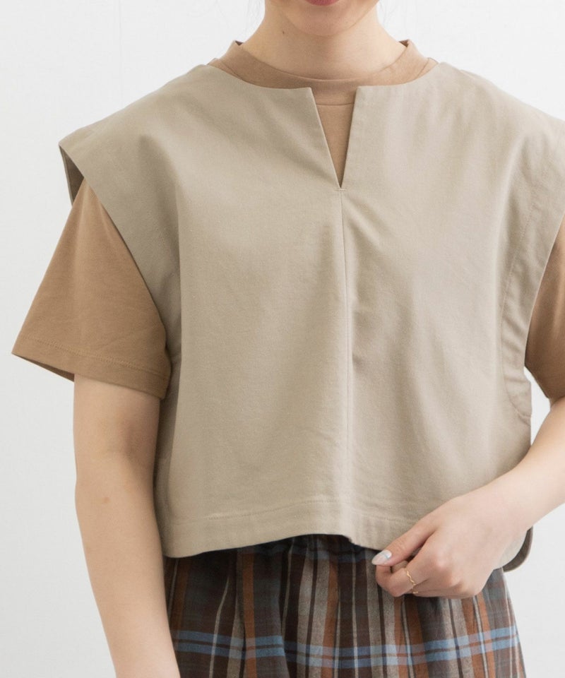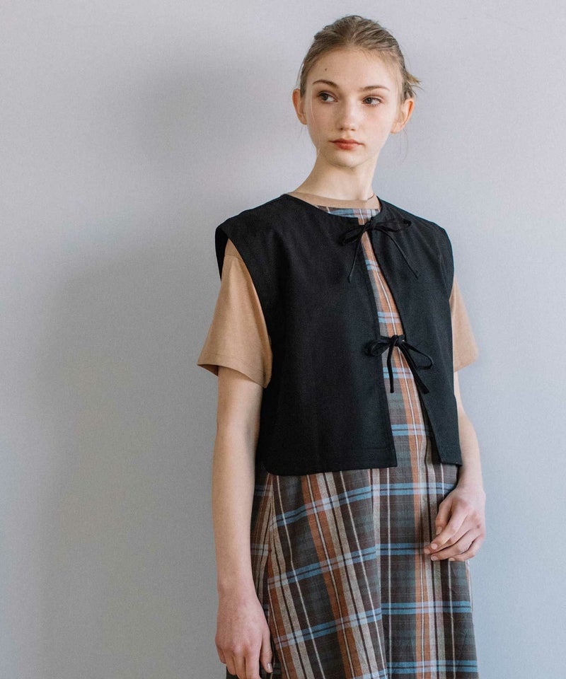 ・キーネックとリボン開きの両面で着用できる布帛のベスト。