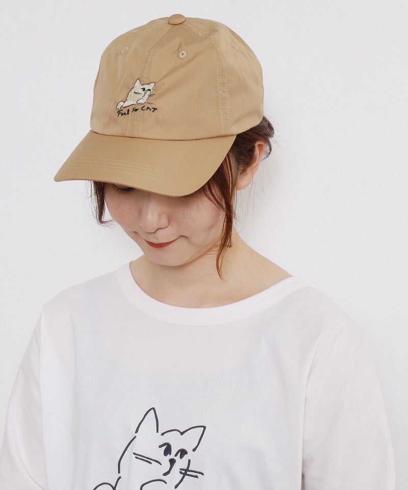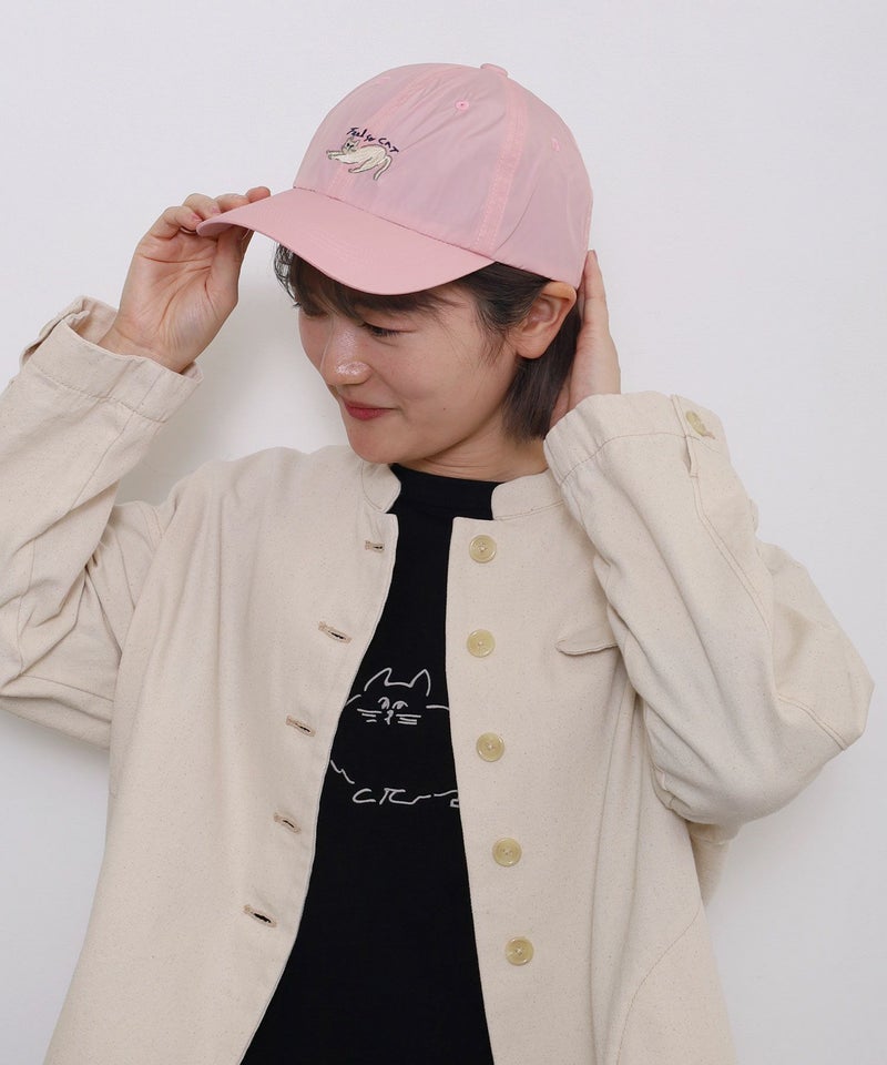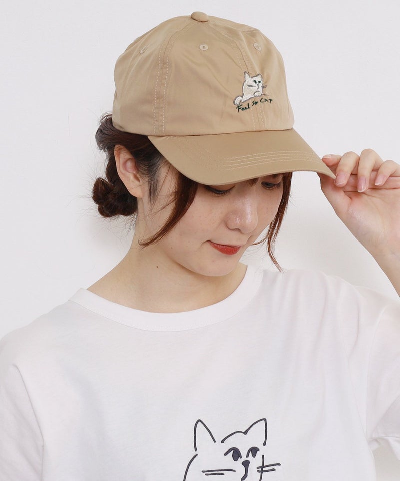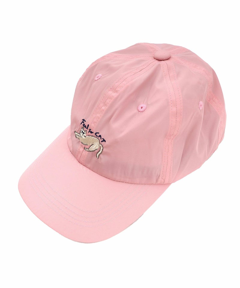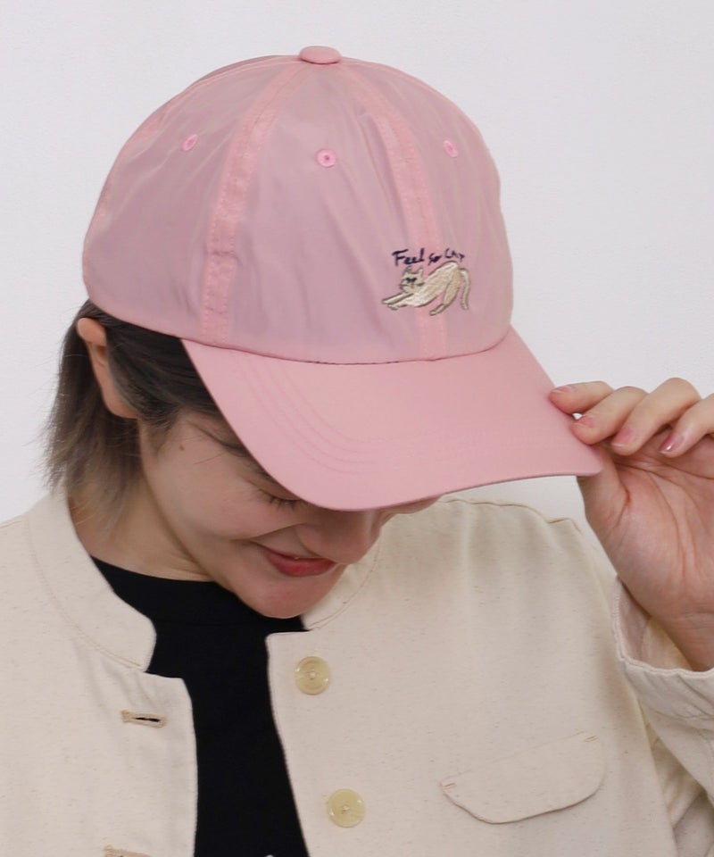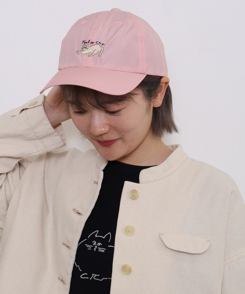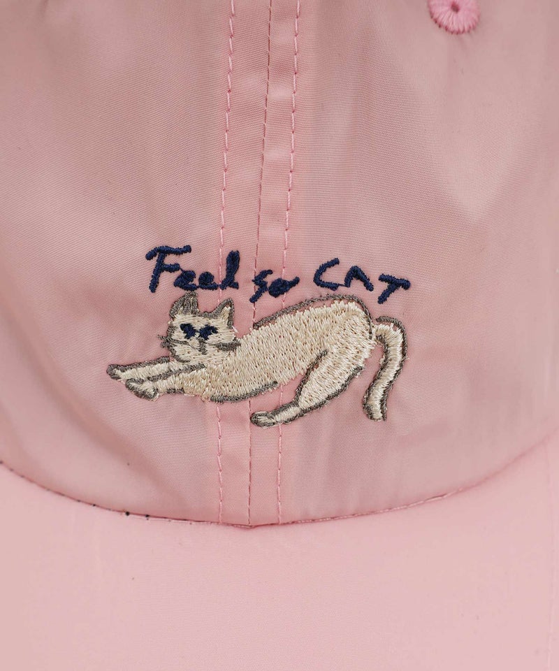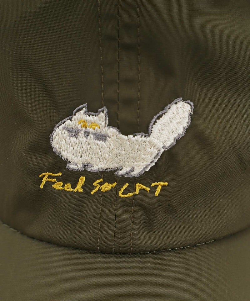 3種類のねこの手描きイラストを刺繍した FEEL SO CATシリーズ! ・2月22日ねこの日に向けたスペシャルアイテム!キャッチフレーズはFEEL SO CAT-ねこな気分- ・撥水ポリエステル生地を使用した軽い素材感のキャップに色ごとに違うねこのイラストを刺繍しました。配色のロゴもアクセント。ピンクはのびるねこ、ベージュはのぞきねこ、カーキはモケモケのねこ。