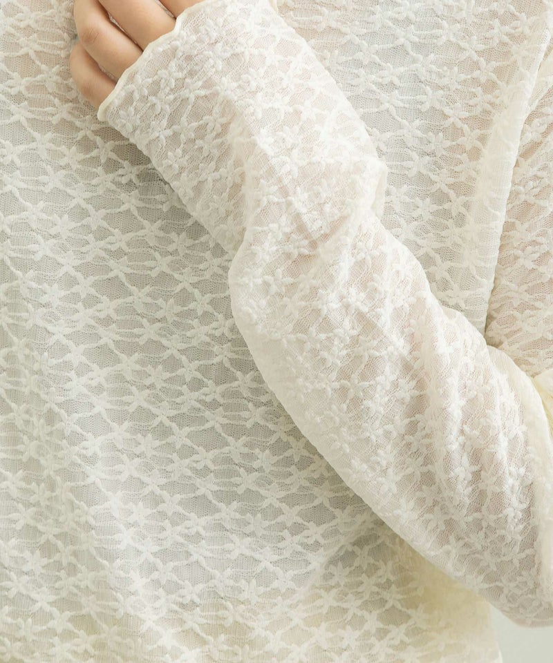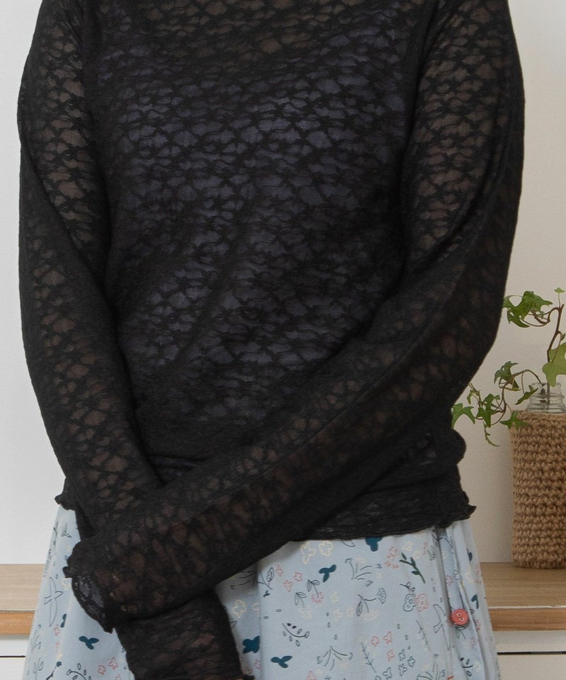 ・人気の小花柄が可愛らしい花柄ストレッチシアーレース素材のタートルトップス。袖口と衿元はトレンド感のあるメロウ始末になっています。