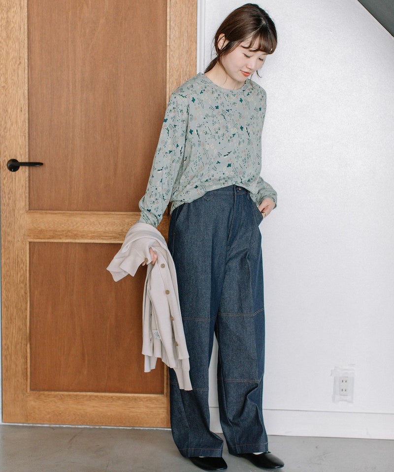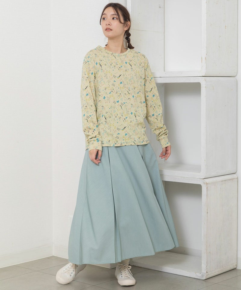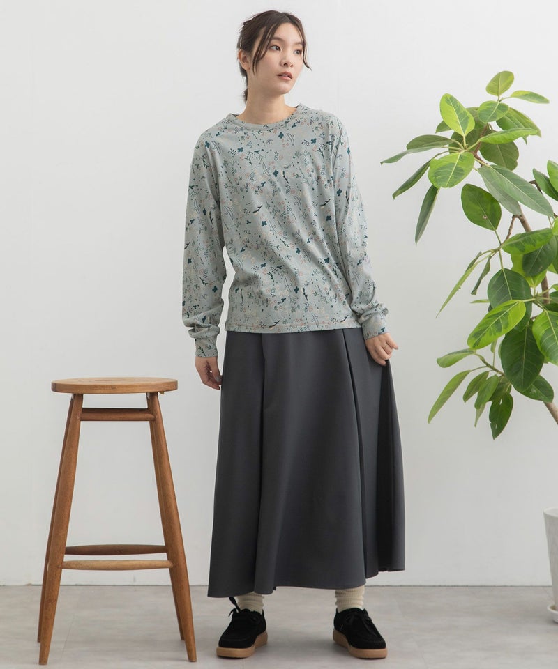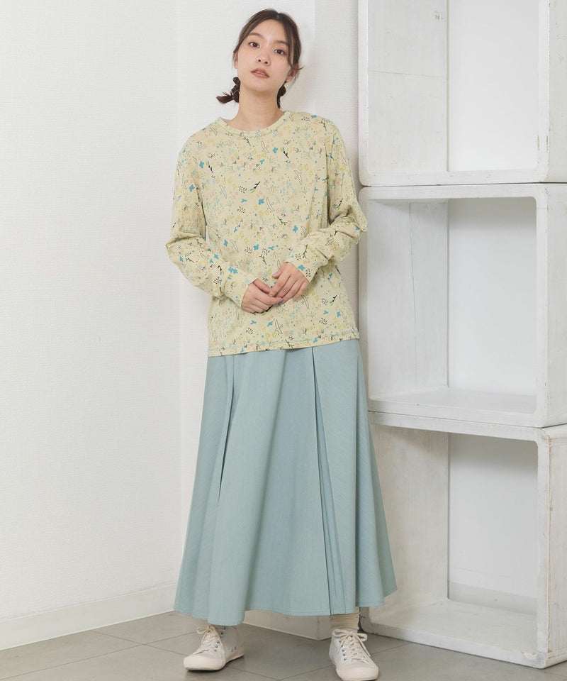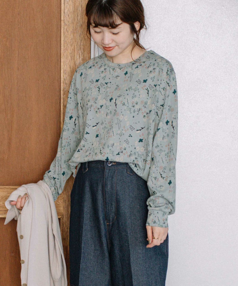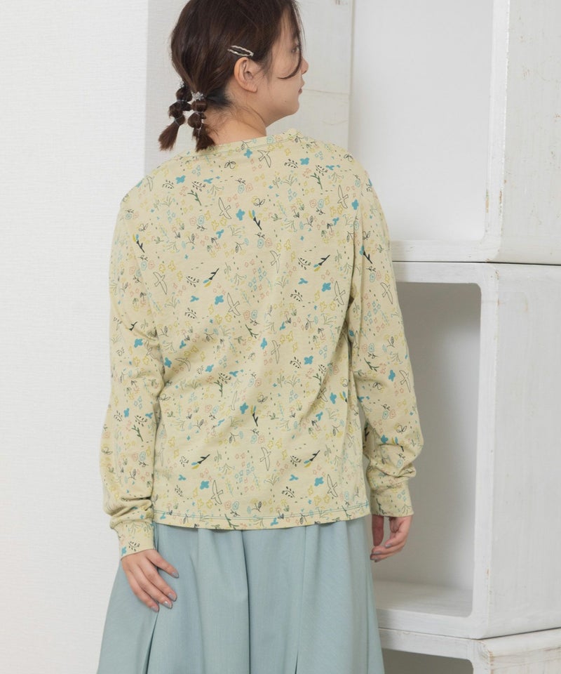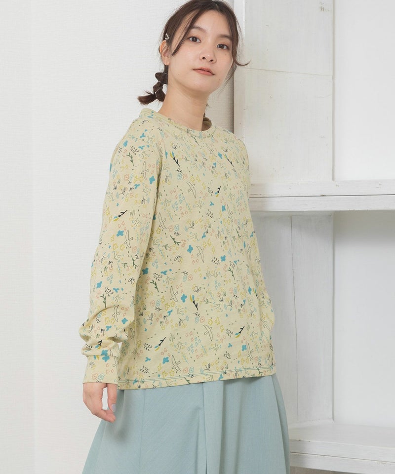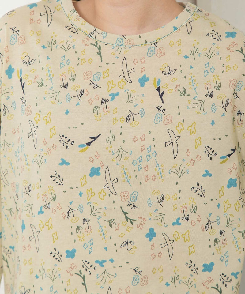 ・手描きタッチのとりや花を散りばめたPOU DOU DOU オリジナルの総柄プリント生地を使用した長袖のプルオーバー。配色のステッチ使いがポイント。