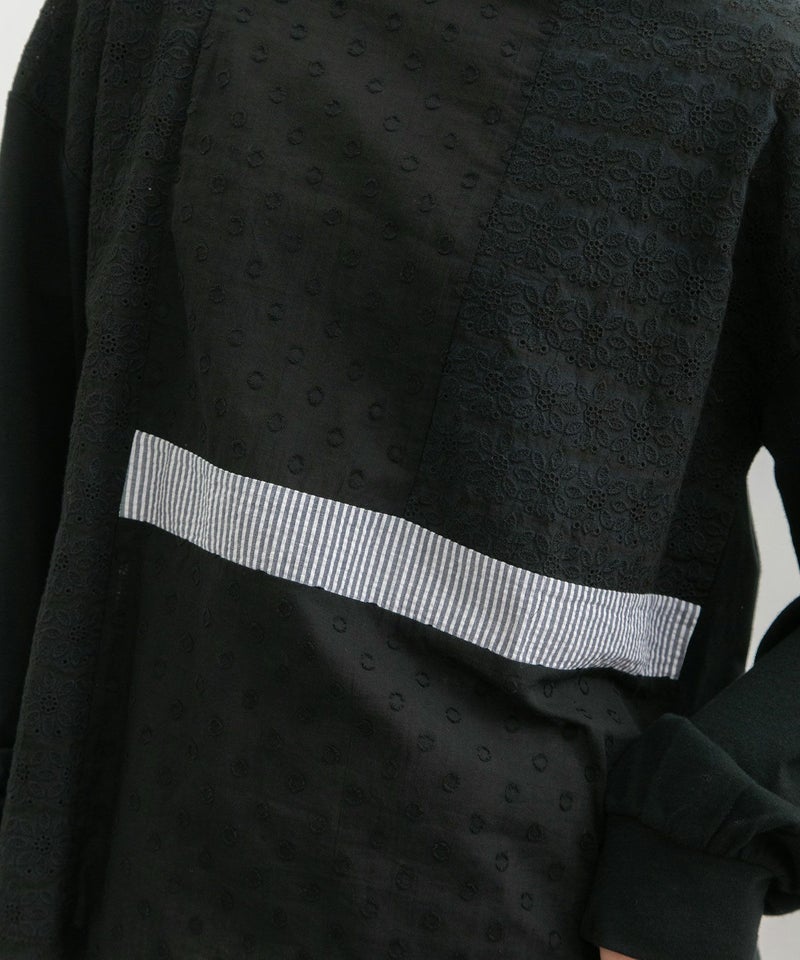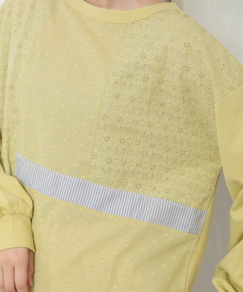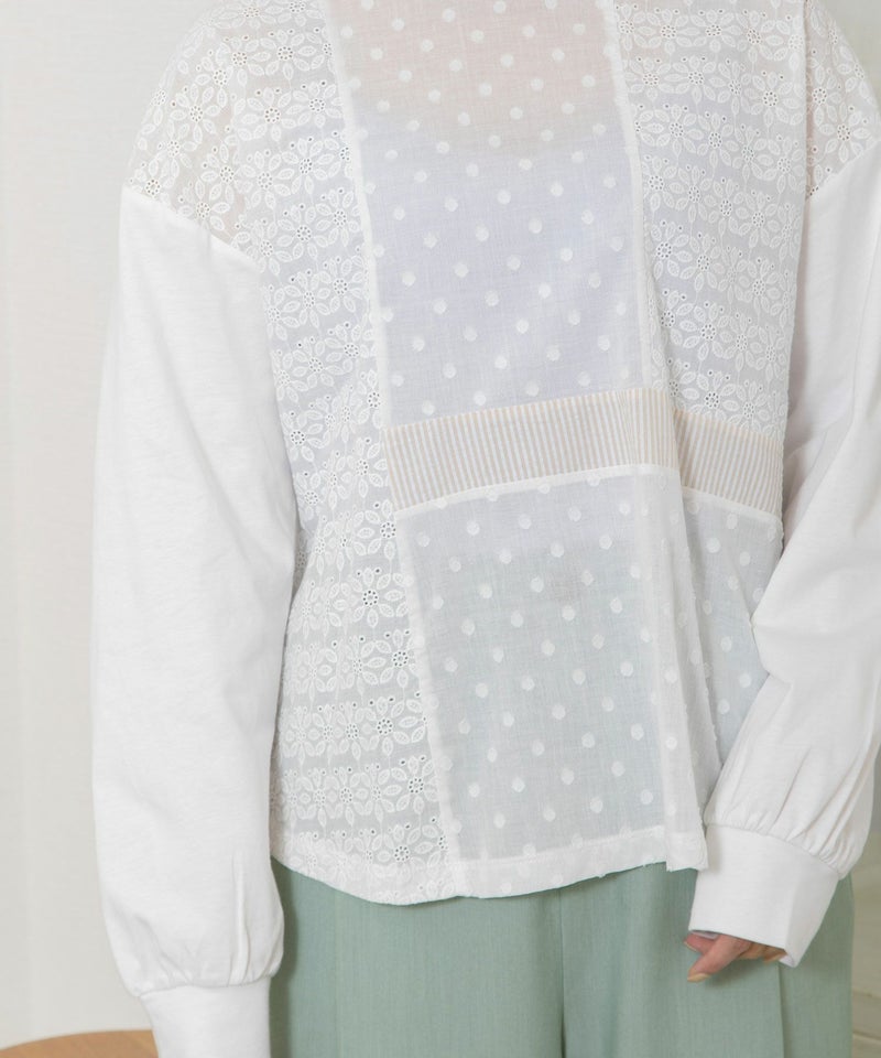 ・ドット柄のカットドビーやお花のエンブロイダリー生地、ストライプの異素材をパッチワークしたフロントがポイントのトップス。