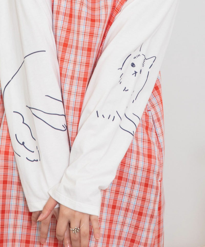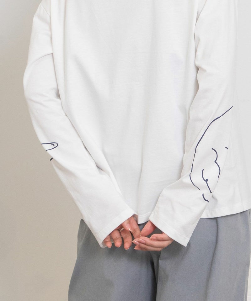 ・両袖をくっつけるとリラックスしたネコのイラストが現れる遊び心のあるプリントロンT。