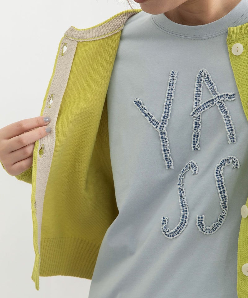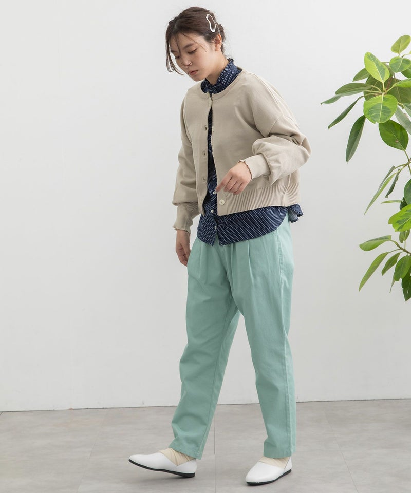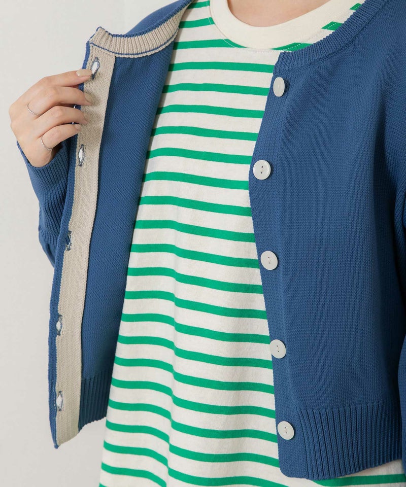 ・とても軽いポリエステル素材の糸で編み立てたカーディガン。ぷっくりとした袖と短めの丈感がシンプルながら新鮮な雰囲気です。
