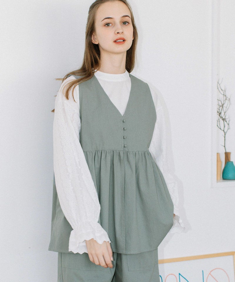 ・首元のVネックがすっきりした印象に、切り替え下は開いてラフな雰囲気で着られます。