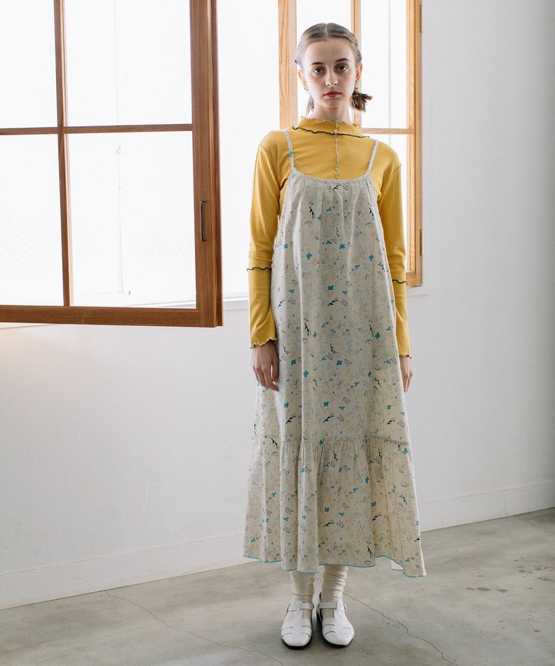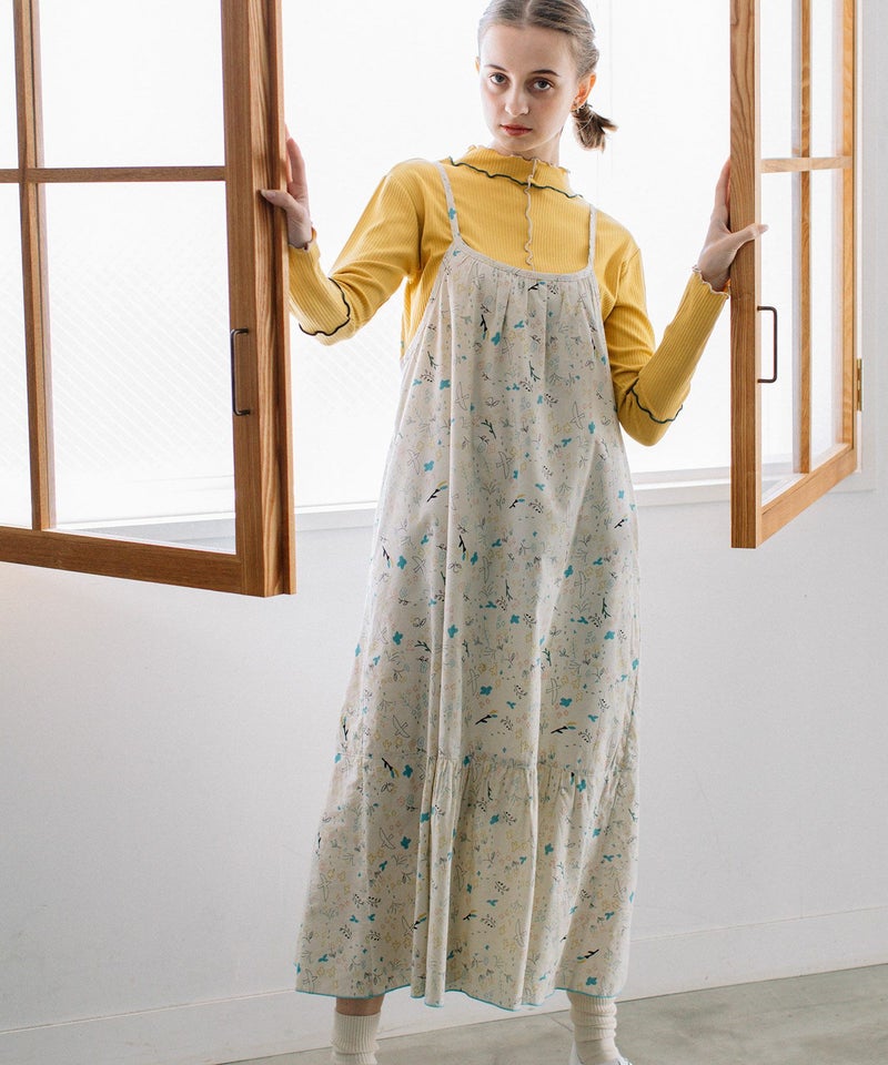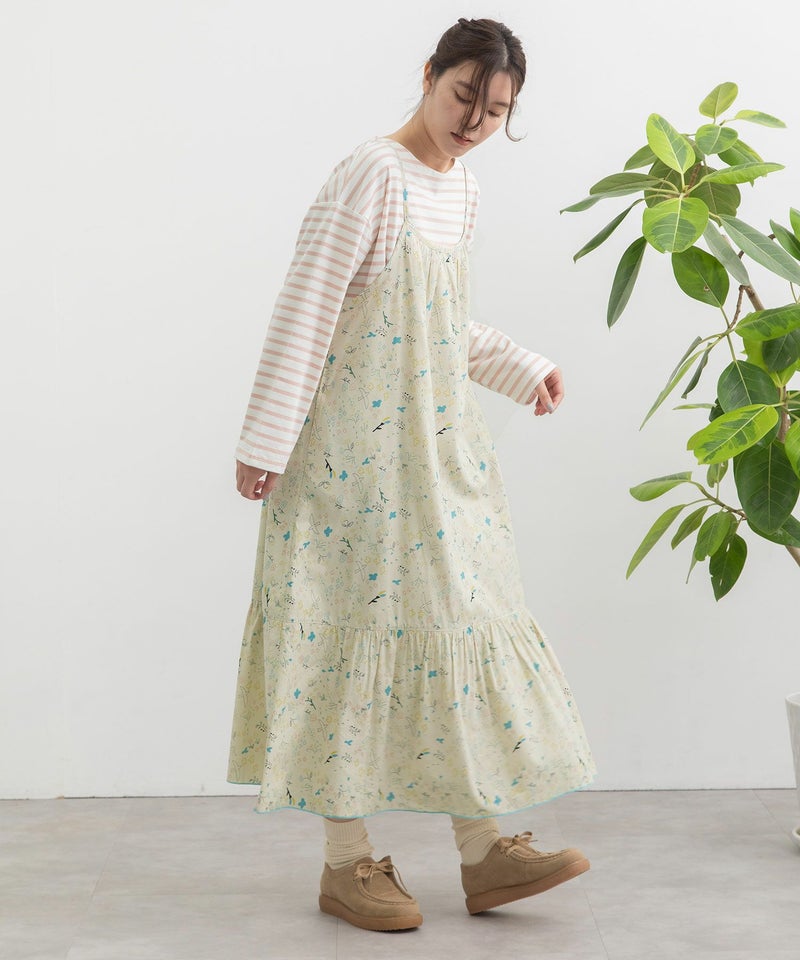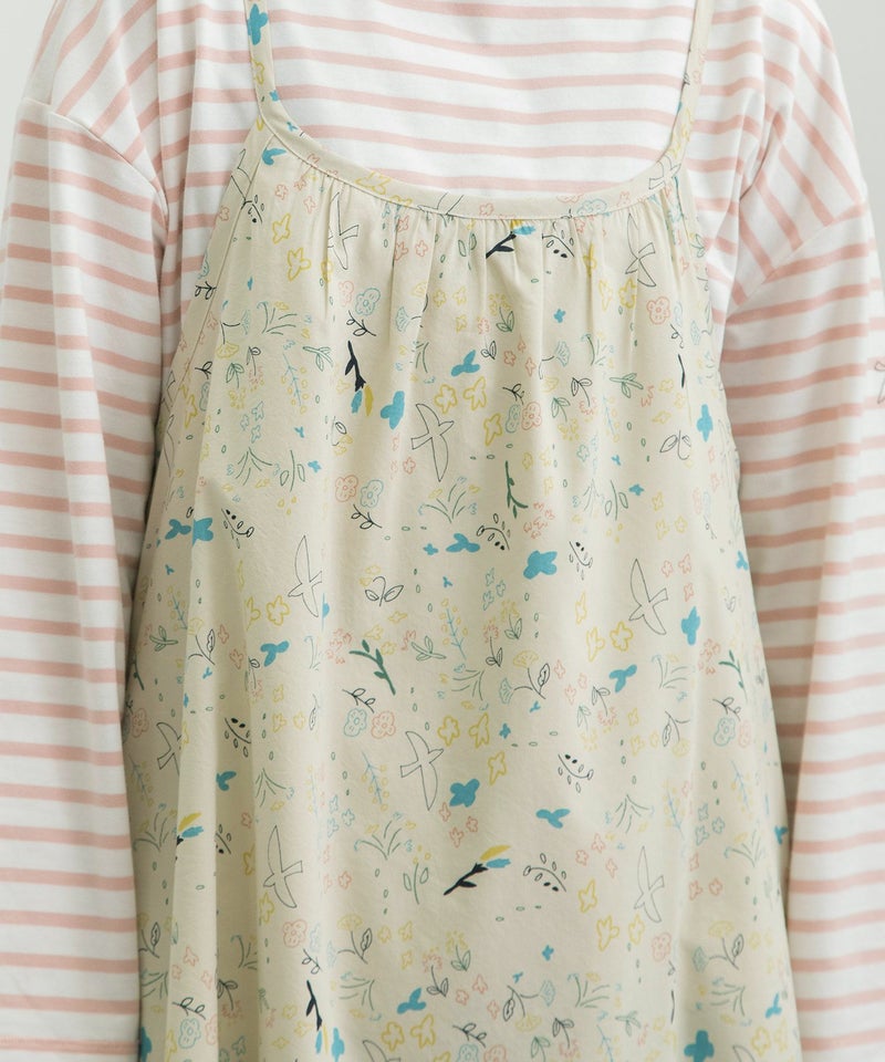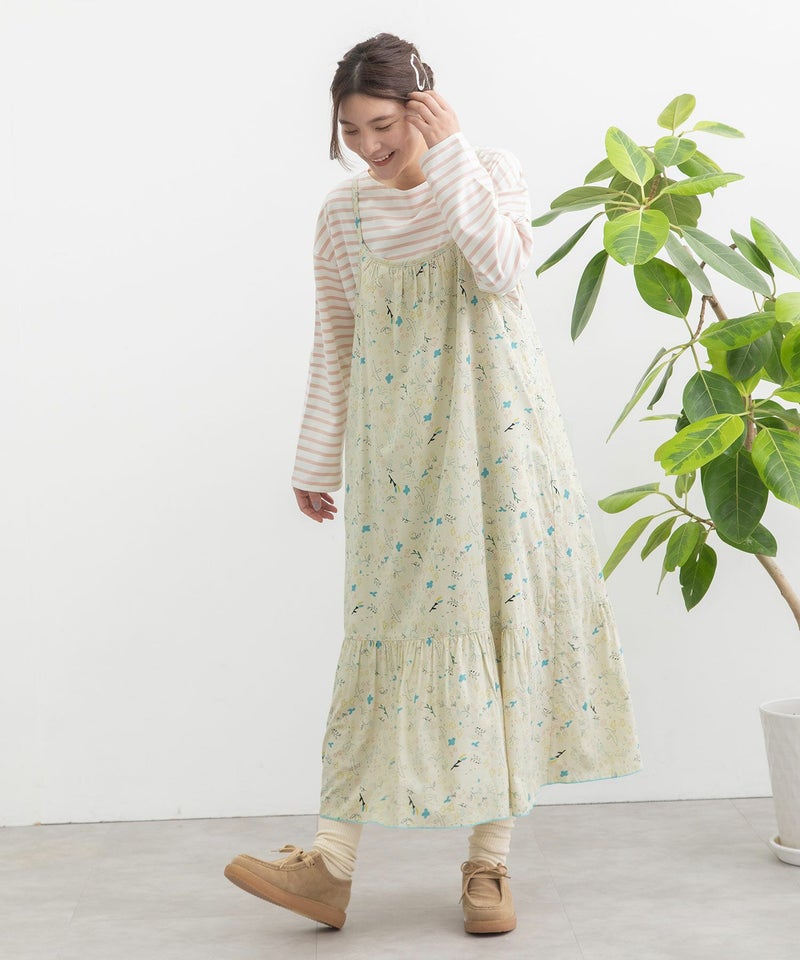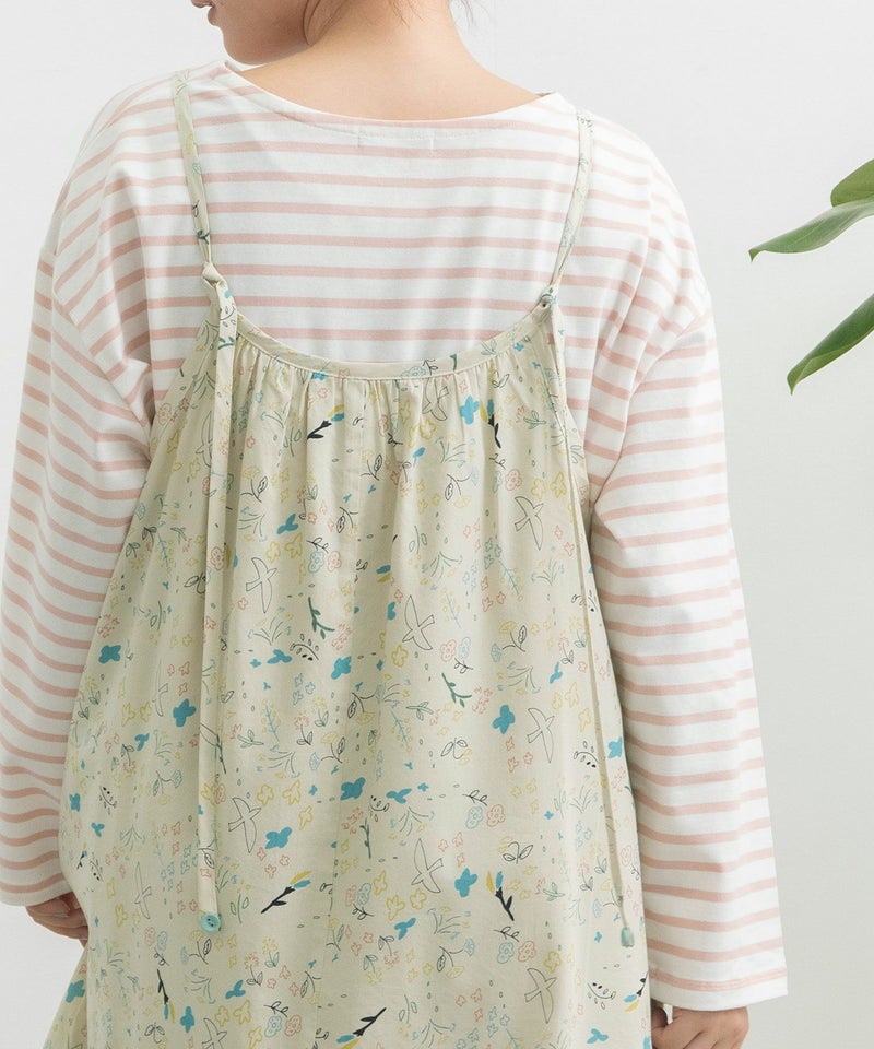 ・手描きタッチのとりや花を散りばめた総柄プリントのキャミソールワンピース。多色使いの線画が新鮮です。