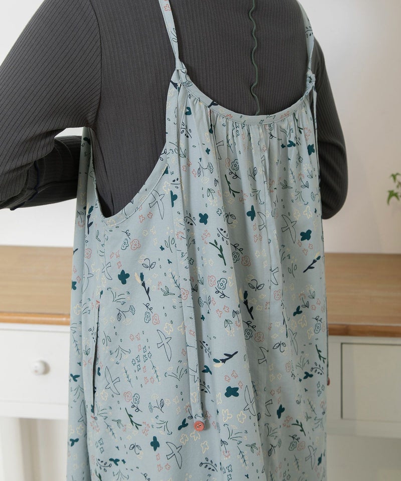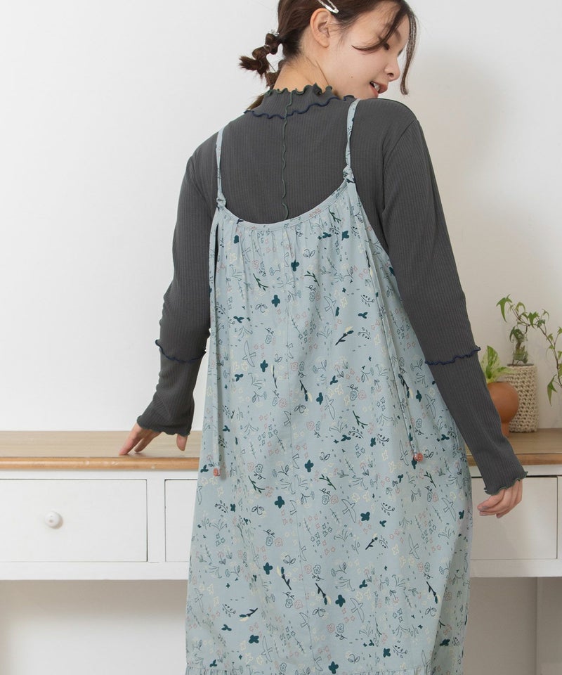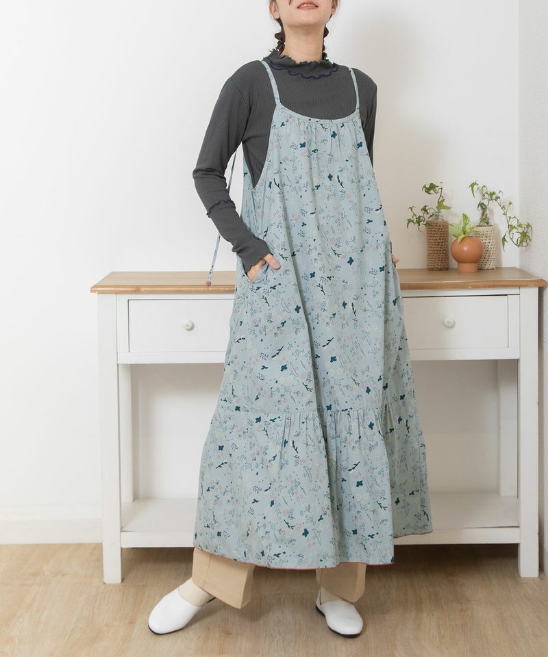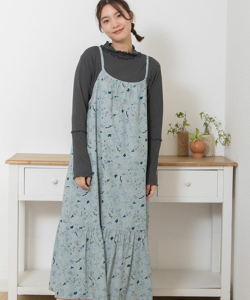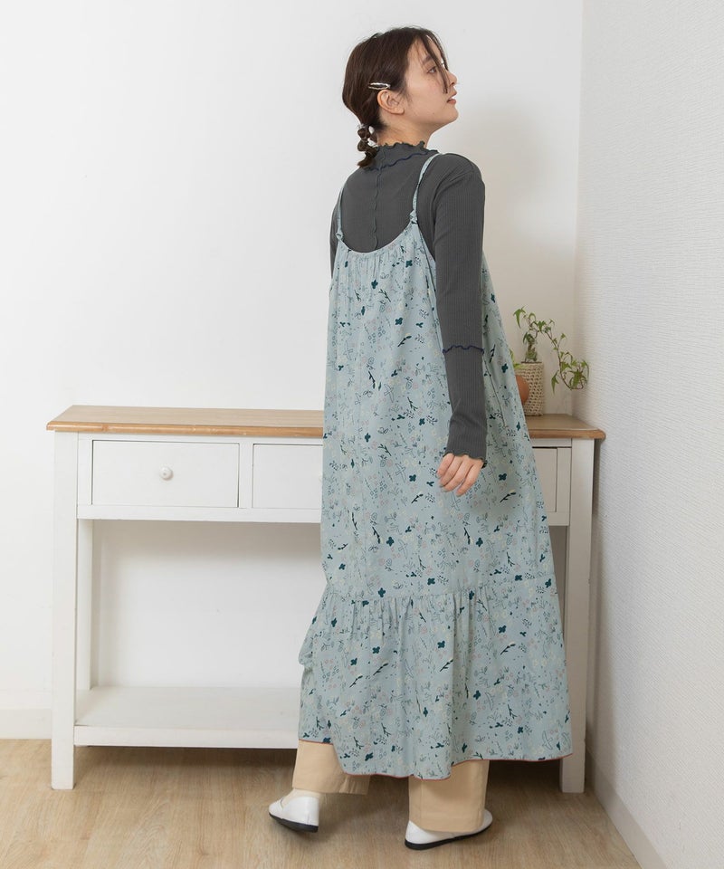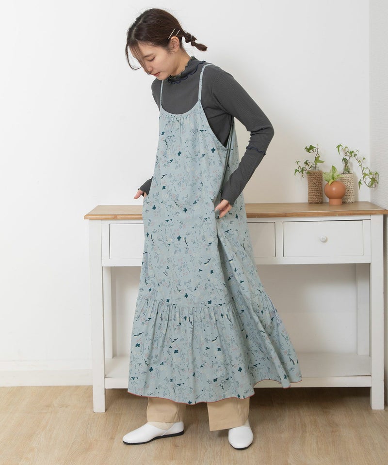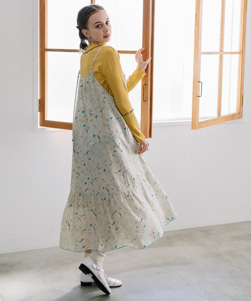 ・手描きタッチのとりや花を散りばめた総柄プリントのキャミソールワンピース。多色使いの線画が新鮮です。