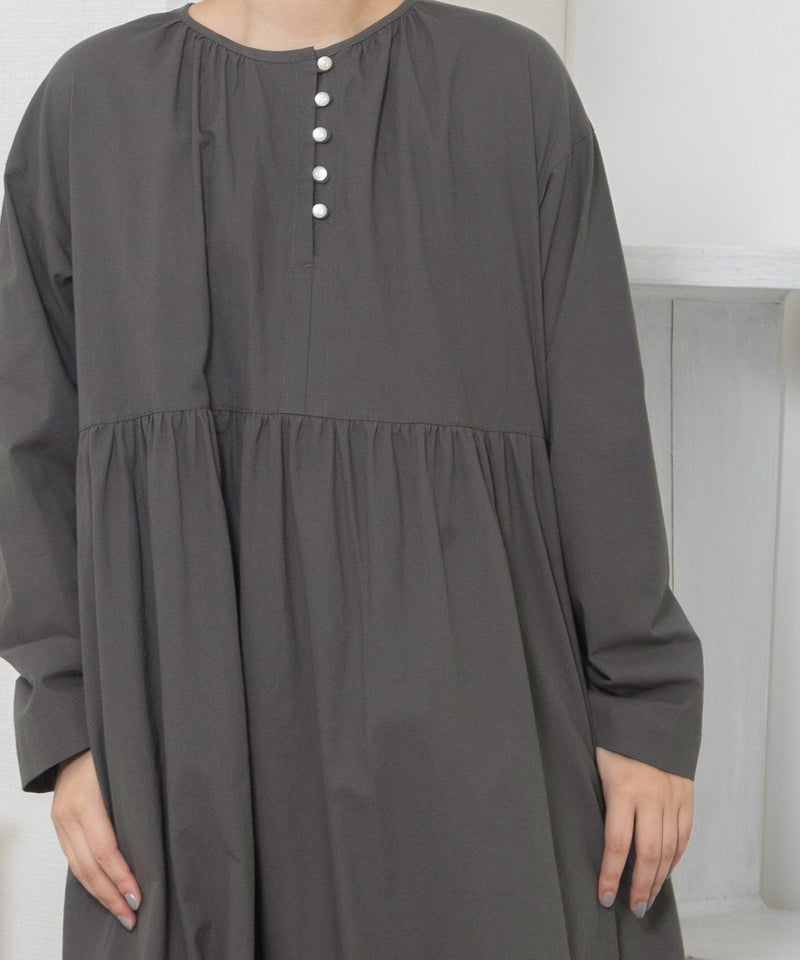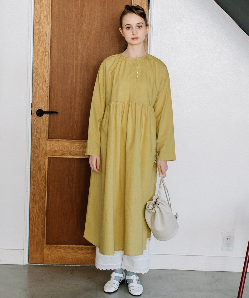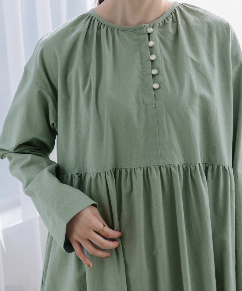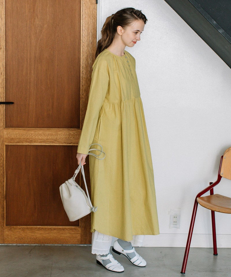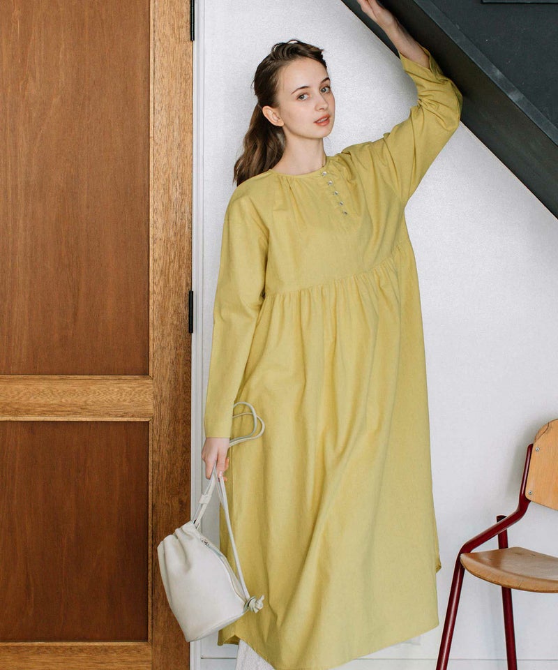 ・左に寄せたフロントの開きに並べたボタンがアクセントになったワンピース。ナチュラルな雰囲気のコットンキャンブリックで仕立てました。