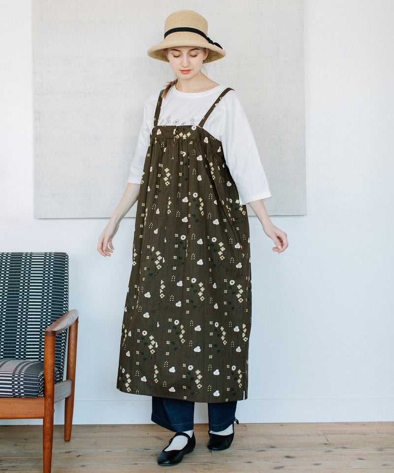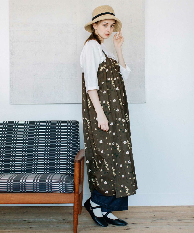 ・ストライプ状に並べた線画のボタニカルモチーフが、音符が並んだ楽譜のようにも見えるオリジナルプリント柄のキャミワンピース。