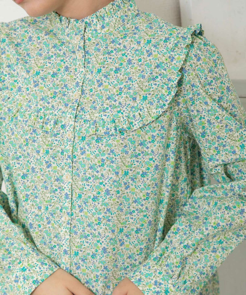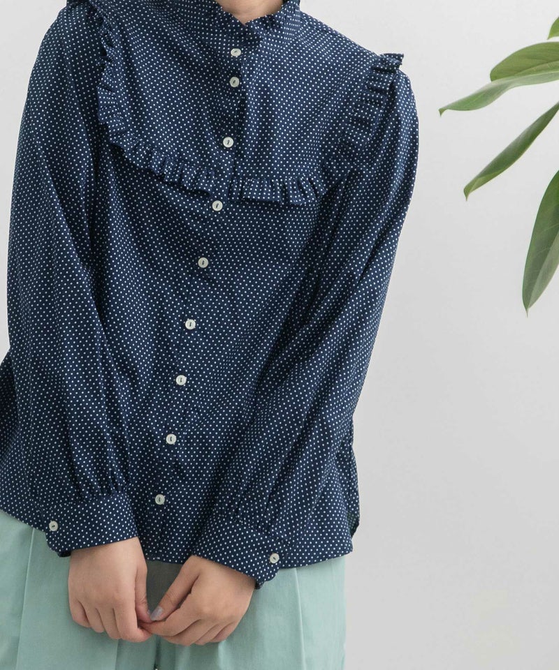 ・丸みのあるヨーク切り替えにフリルをあしらったブラウス。