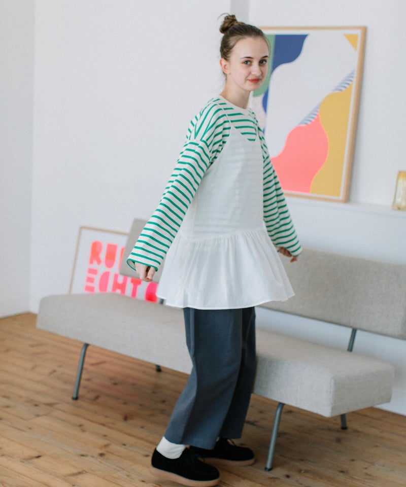 ・寒い時期にはインナーニットやロンT、暖かくなったらTシャツに合わせて、インナーを変えて旬のレイヤードコーデをお楽しみいただけます。