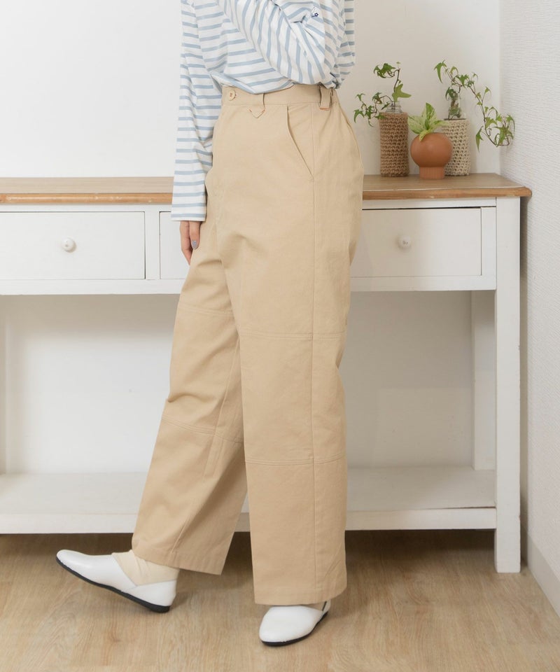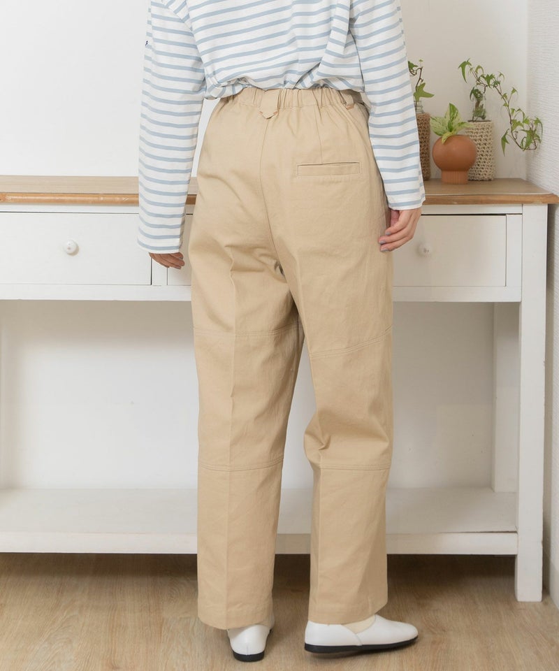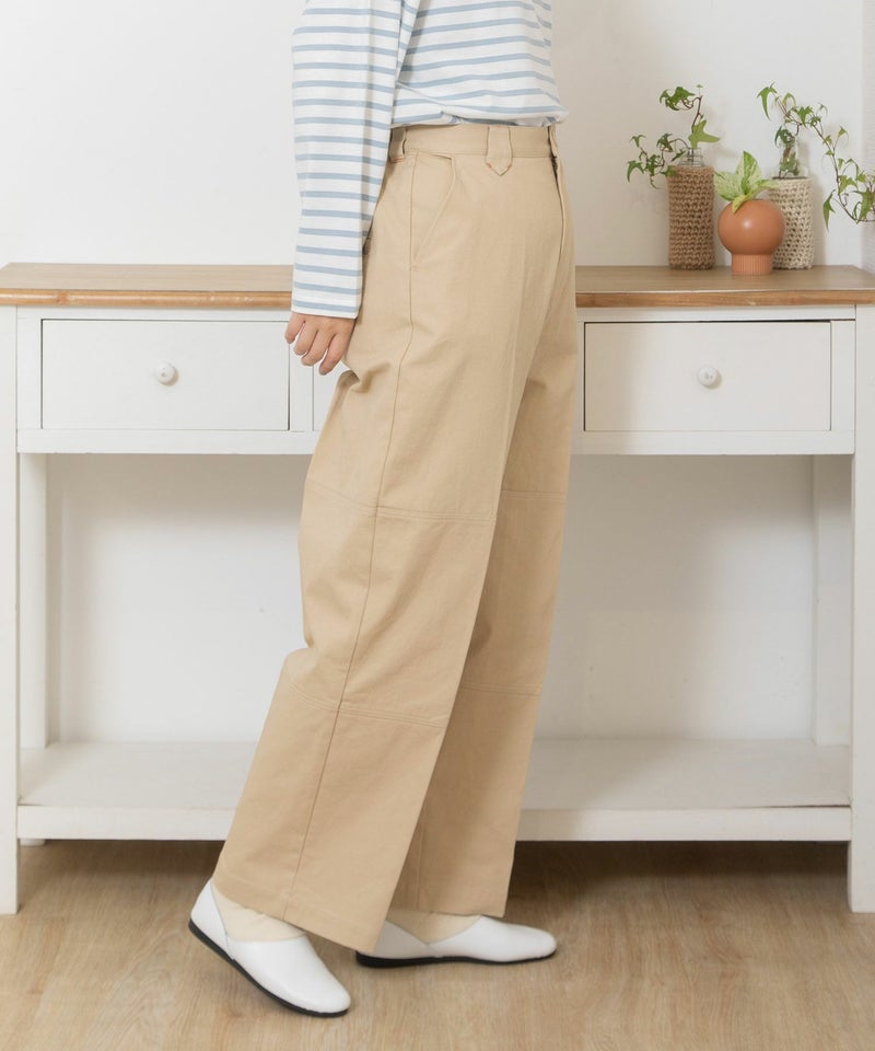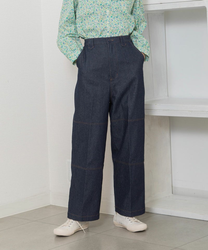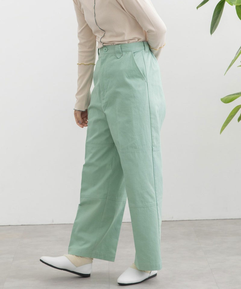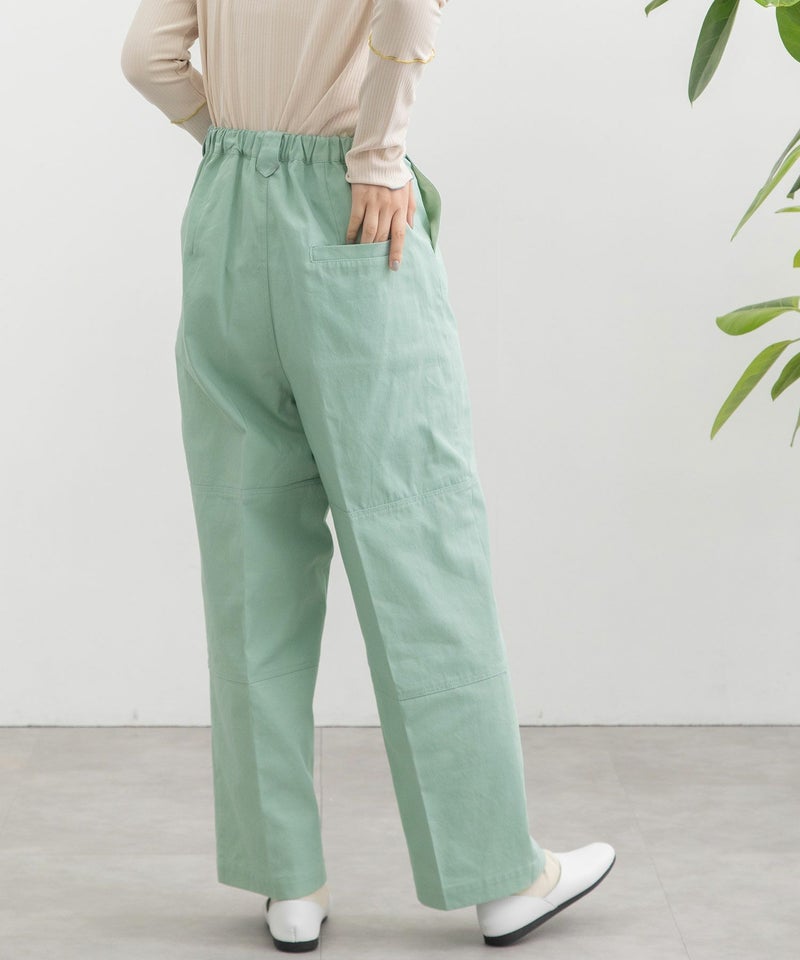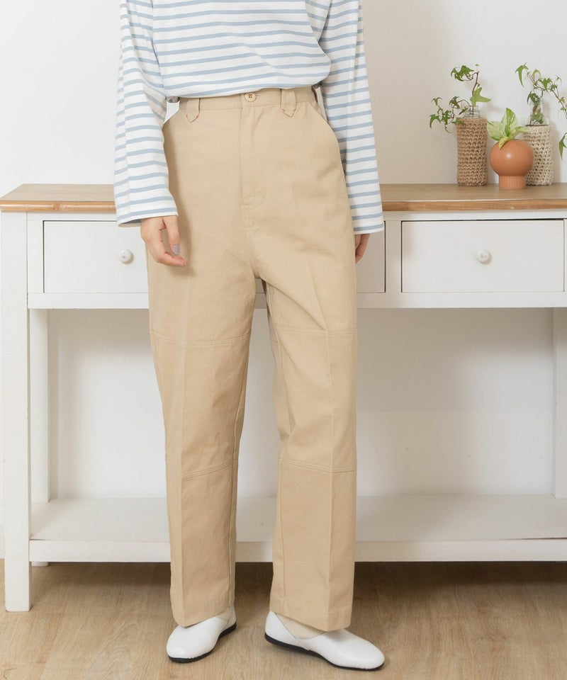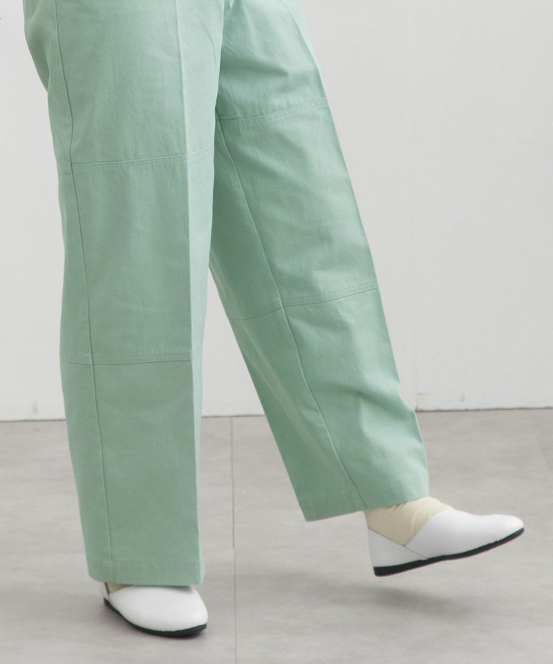 ・程よくゆとりのあるストレートシルエットに、膝の切り替えのワークディテールを効かせたデザイン。ウエストの変形ベルトループがさりげないポイントです。