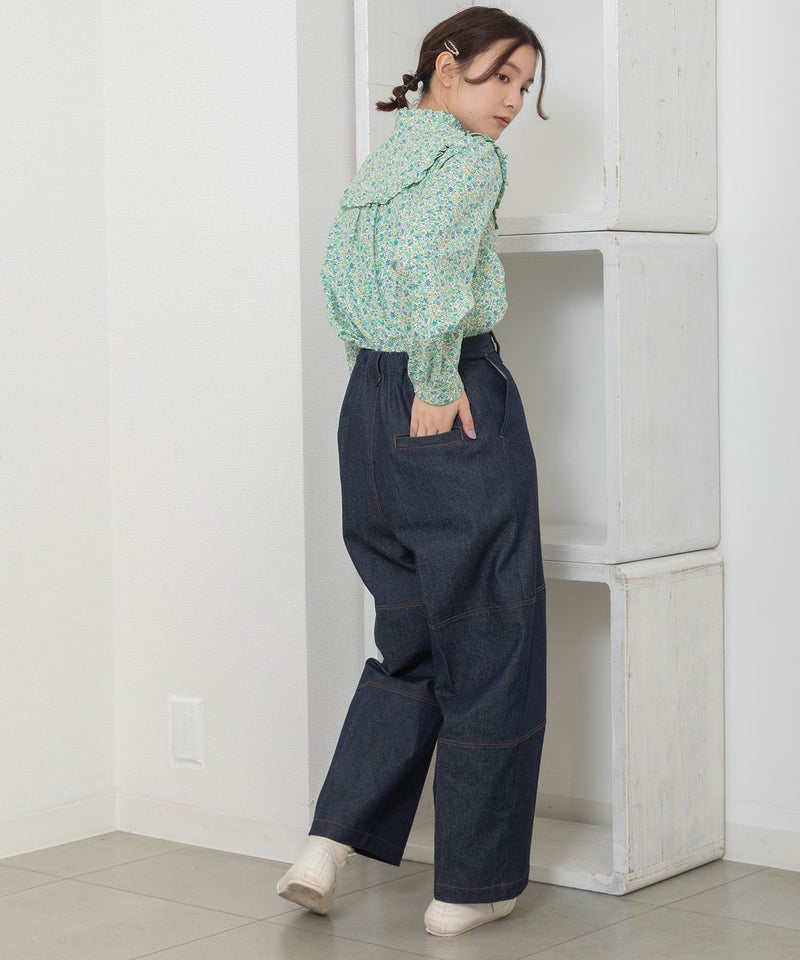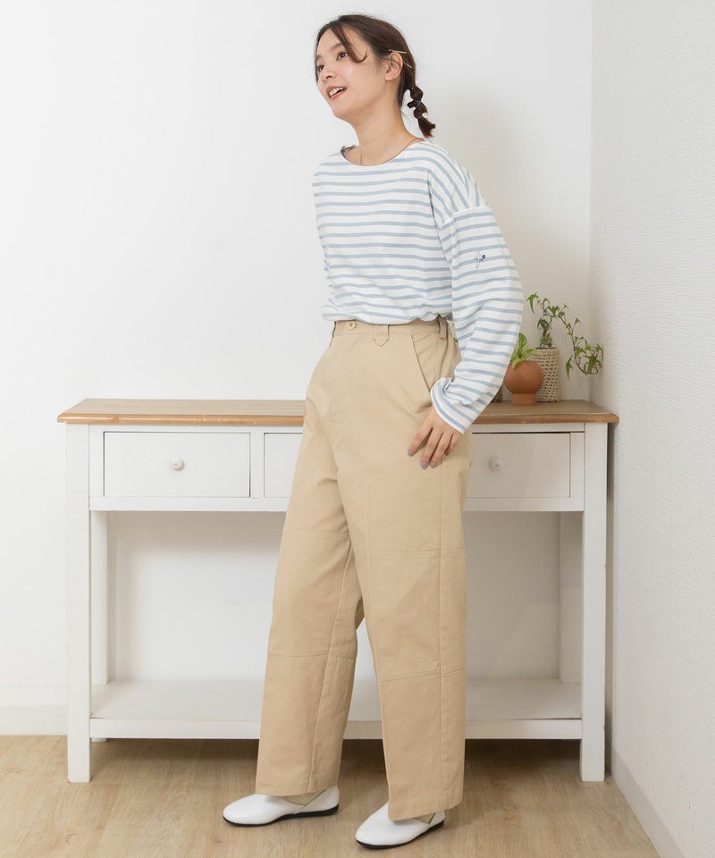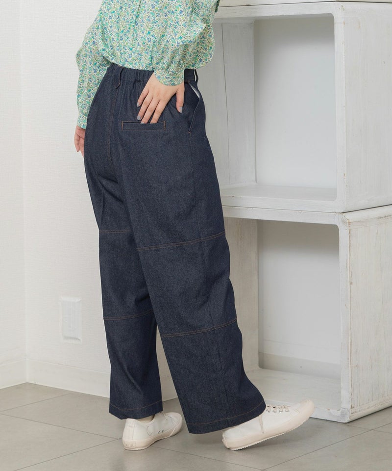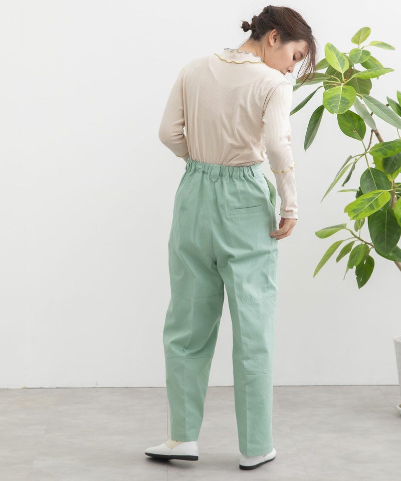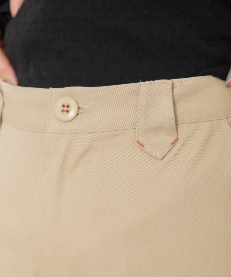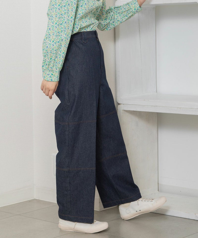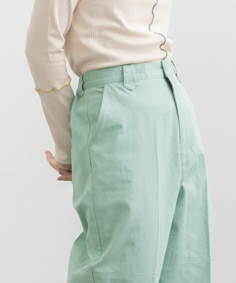 ・程よくゆとりのあるストレートシルエットに、膝の切り替えのワークディテールを効かせたデザイン。ウエストの変形ベルトループがさりげないポイントです。