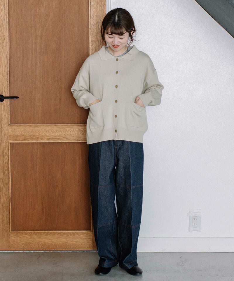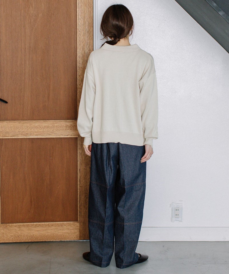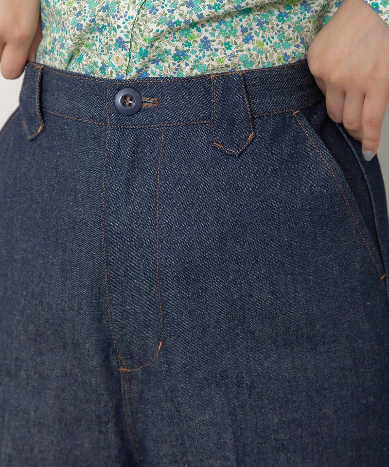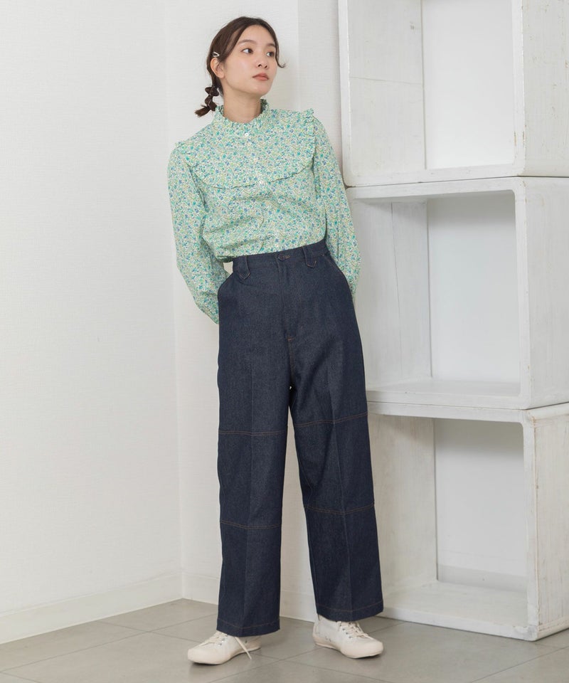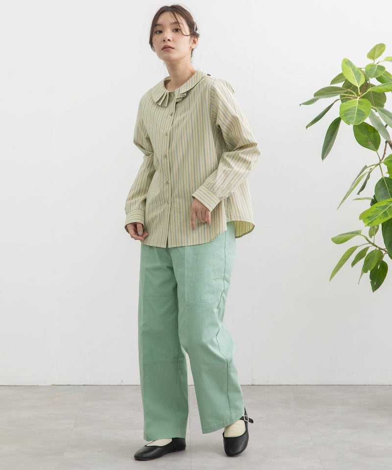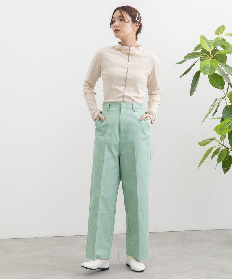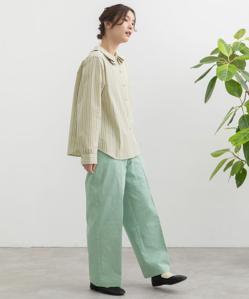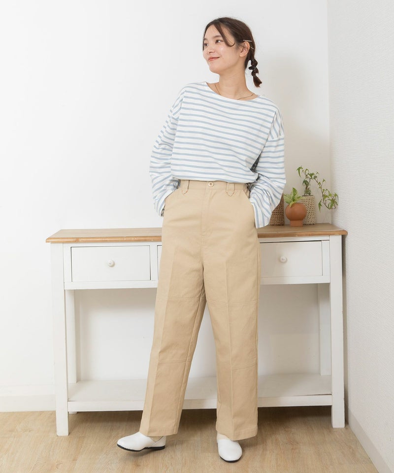 ・程よくゆとりのあるストレートシルエットに、膝の切り替えのワークディテールを効かせたデザイン。ウエストの変形ベルトループがさりげないポイントです。