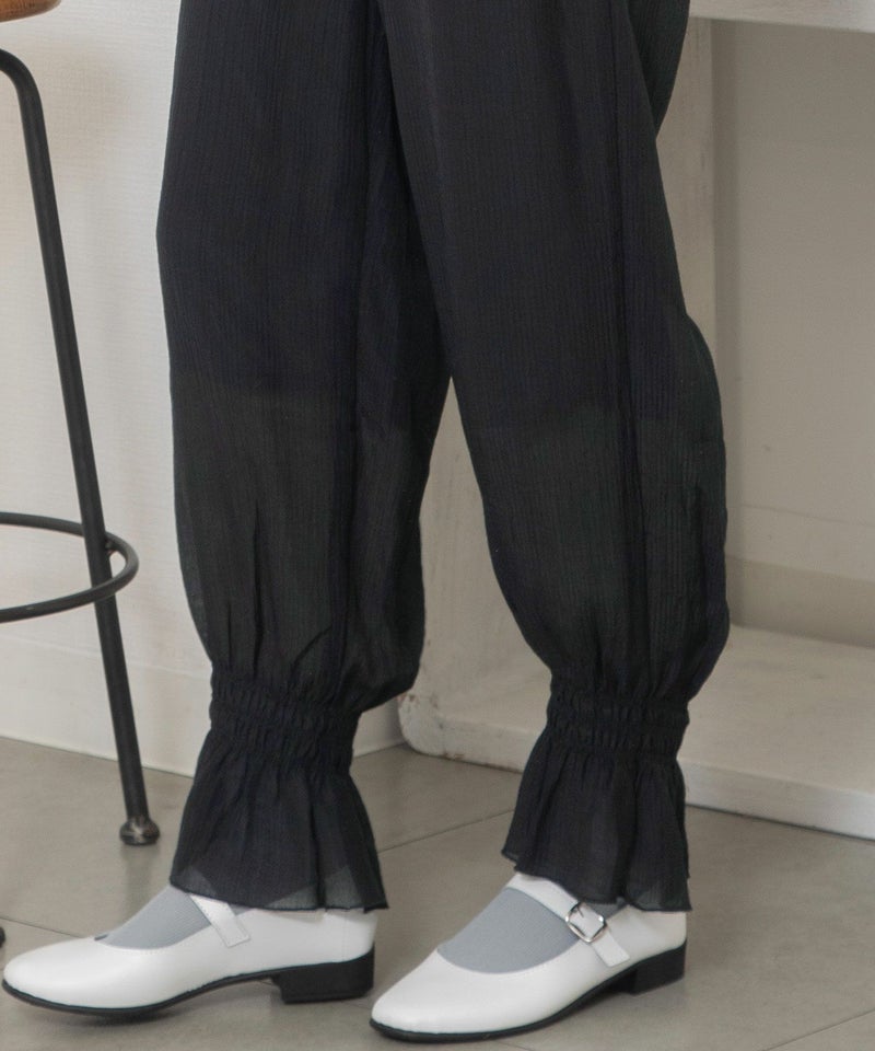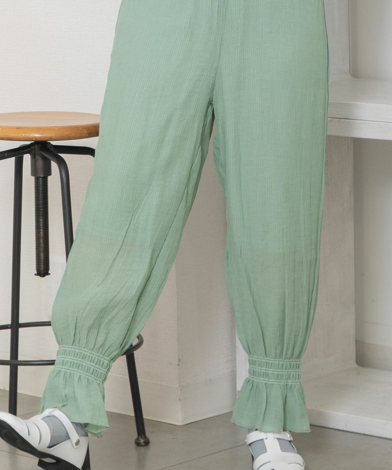 ・トレンドのシアー素材で仕立てた裾フリルパンツ。やわらかく、表面感のあるストライプジャガードの生地を使用しました。