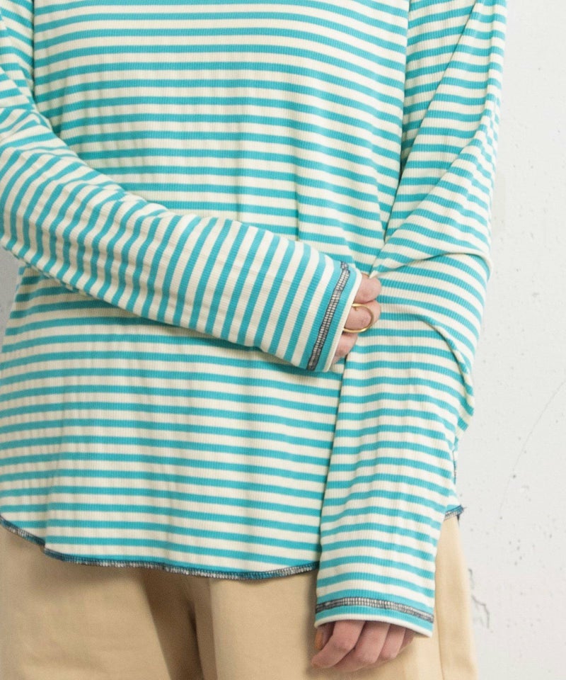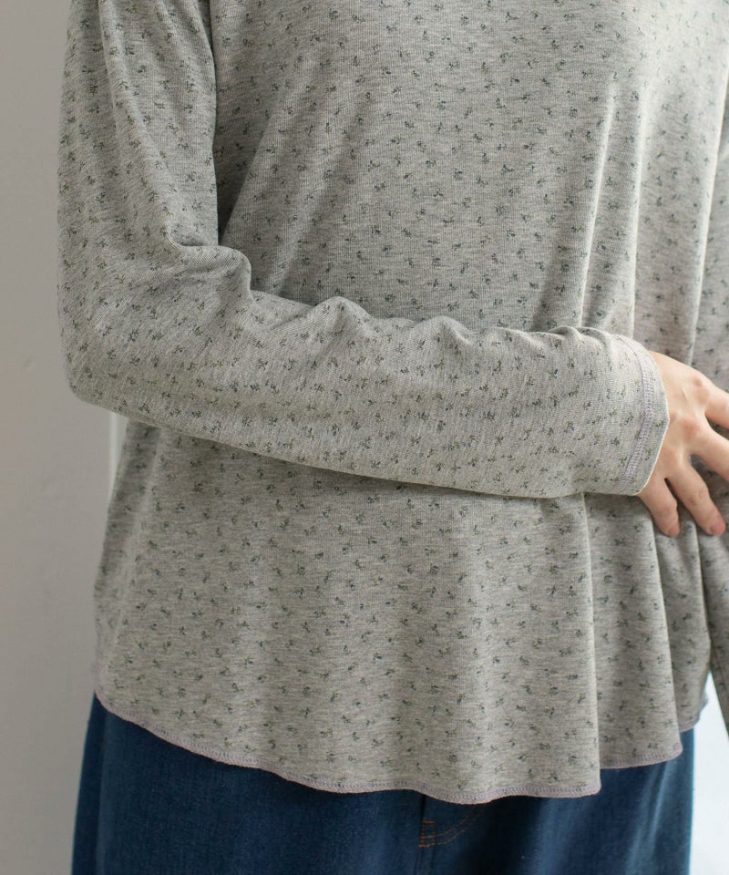 配色のロックステッチがさりげないアクセントのモックネックトップス。アイボリー・グレーは小花柄の天竺素材、ブラック・ライトブルーはボーダーのリブ素材です。どちらの素材も柔らかく、さらりとしなやかな着心地。身体のラインを拾いすぎない程よくゆとりのあるサイジングなので、1着としてはもちろん、シャツやワンピースのインナー使いにもおすすめです。