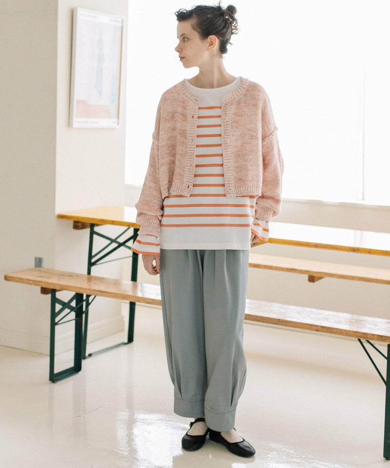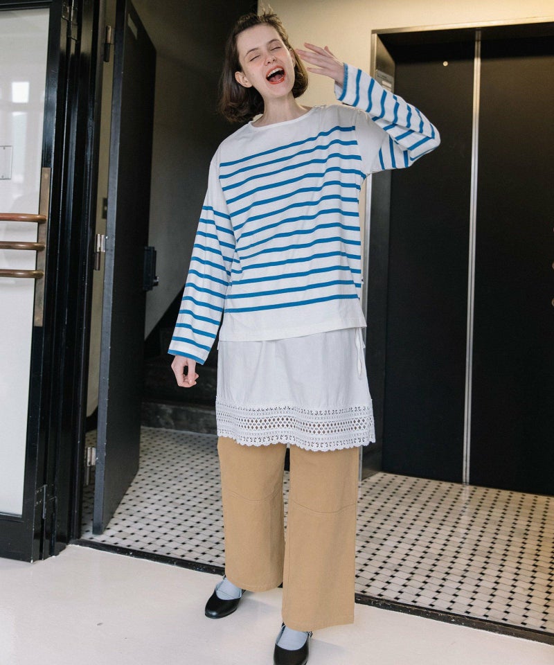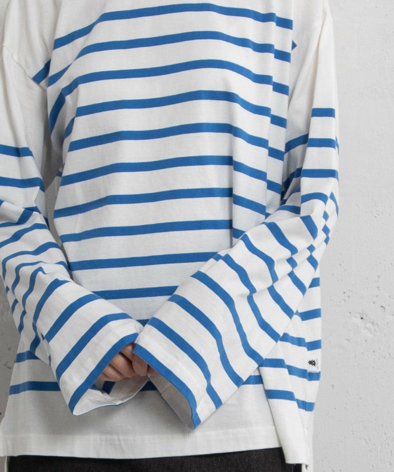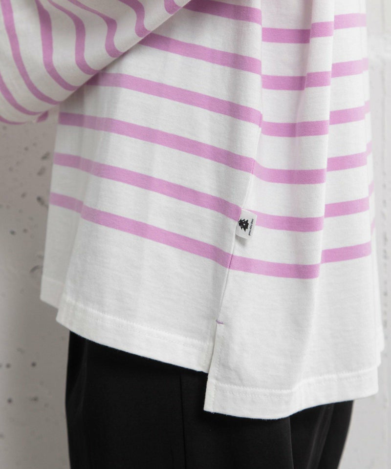 太めのルーズなお袖が可愛いパネルボーダーバスクシャツ。さりげなく前後差があるので、ヒップが目立ちにくいのもポイントです◎ベーシックなアイテムなのでシーズンレスに着ていただけます。ボーダーと同色のサイドスリットのステッチや、左脇にオリジナルのピスネームなど、シンプルの中にさりげないデザインポイントを入れています。