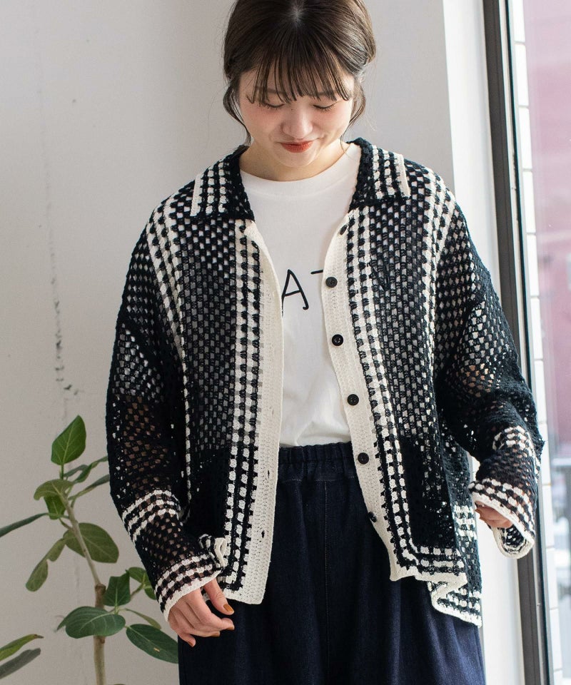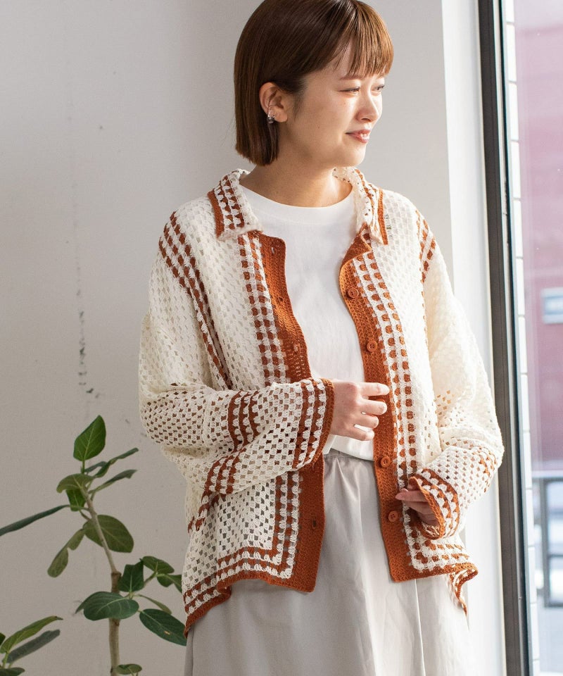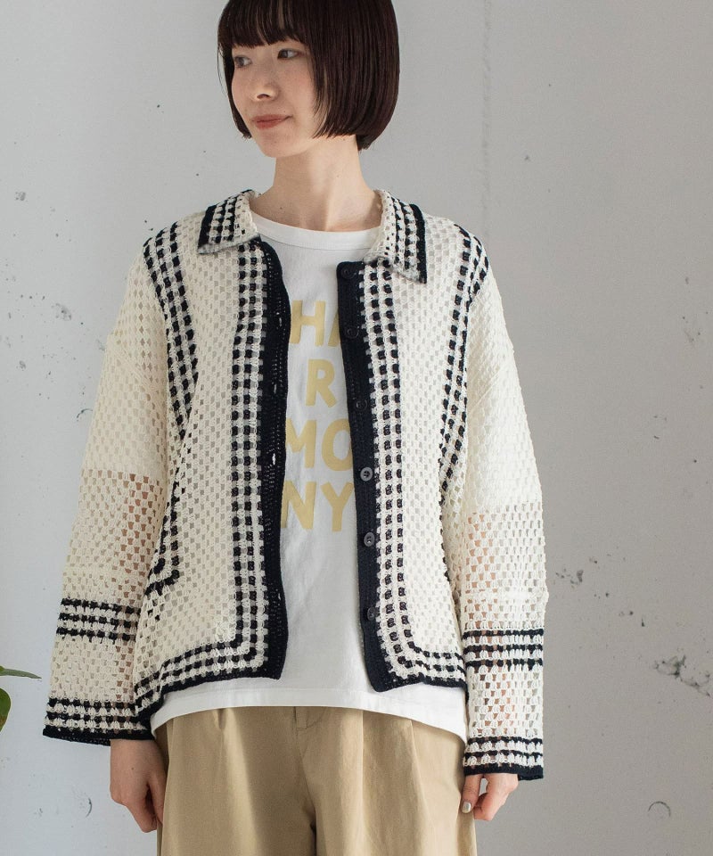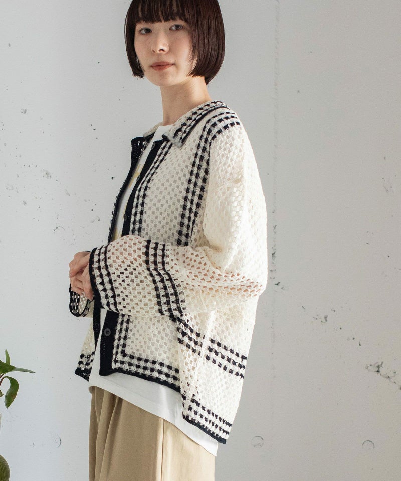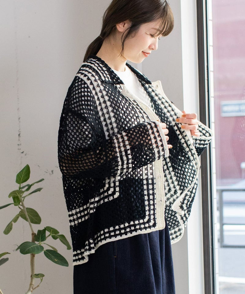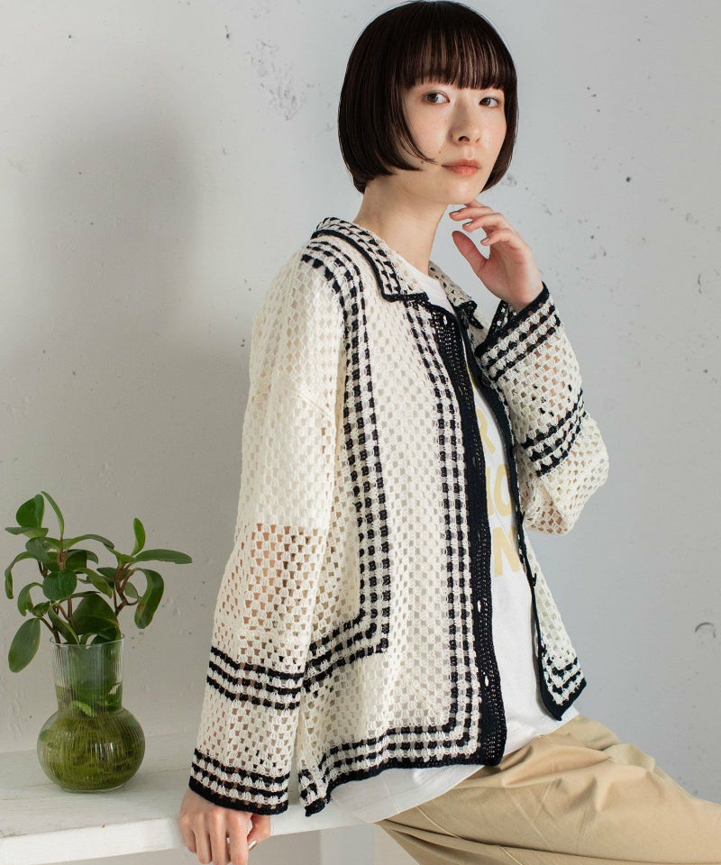 かぎ針編みのような編地のライン配色カーディガン。羽織るだけでこなれ感を演出します。ゆったりとしたシルエットなので、大きめのTシャツの上にもサッと羽織れます。強撚糸なのでお洗濯しても縮まないのも嬉しいポイント◎カリッとした綿素材なので春から秋までロングシーズン着用できます。