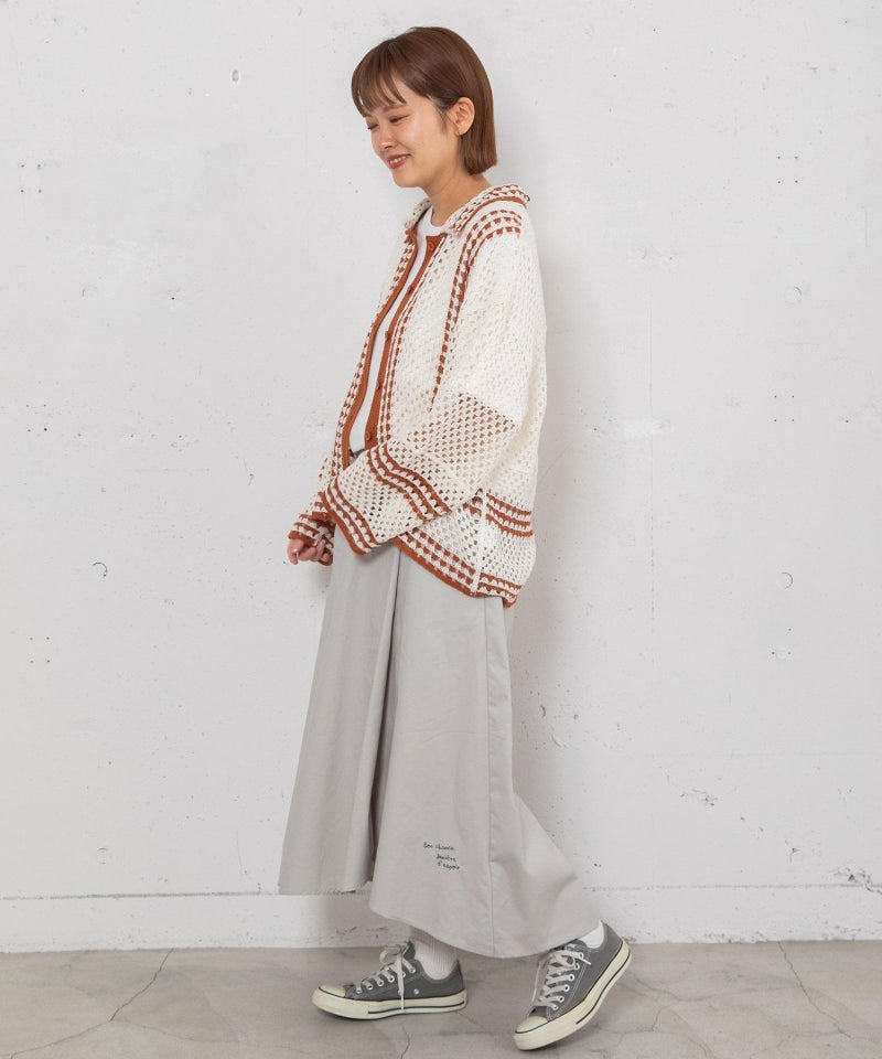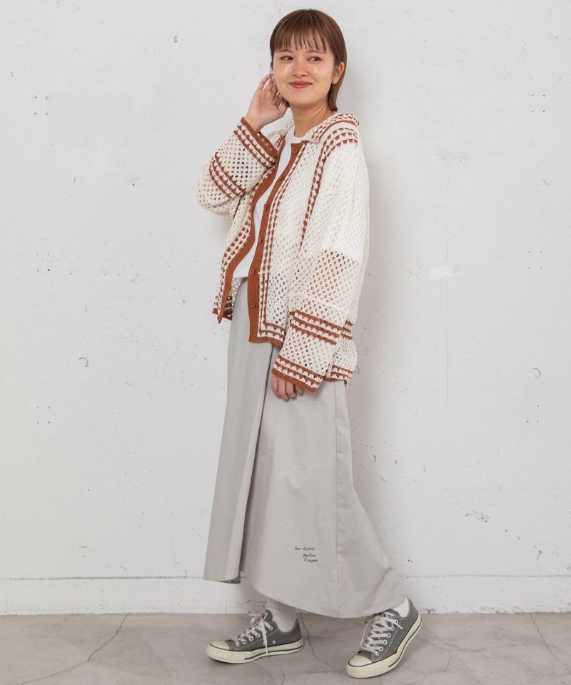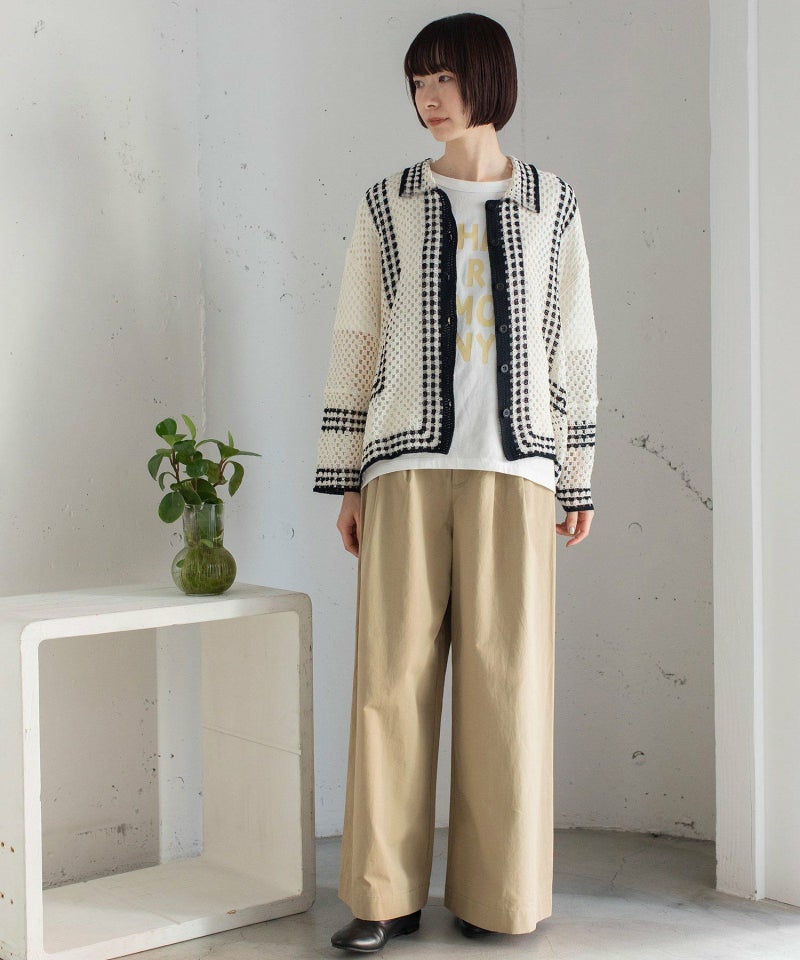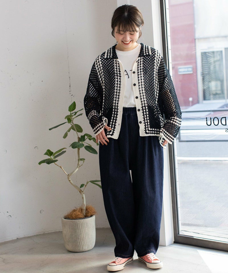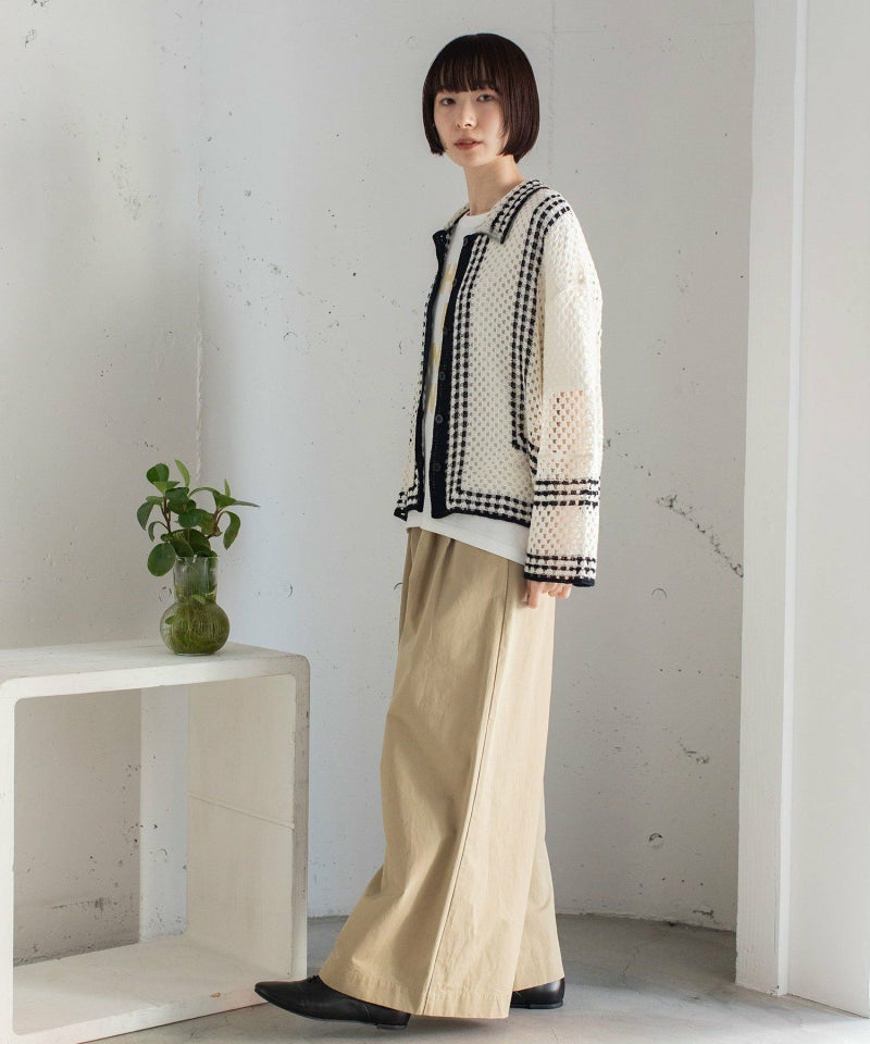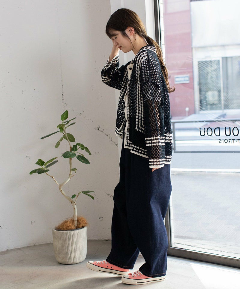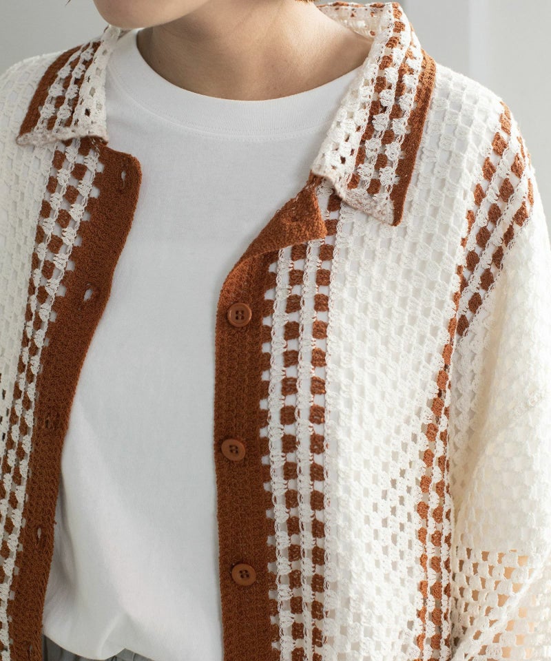 かぎ針編みのような編地のライン配色カーディガン。羽織るだけでこなれ感を演出します。ゆったりとしたシルエットなので、大きめのTシャツの上にもサッと羽織れます。強撚糸なのでお洗濯しても縮まないのも嬉しいポイント◎カリッとした綿素材なので春から秋までロングシーズン着用できます。