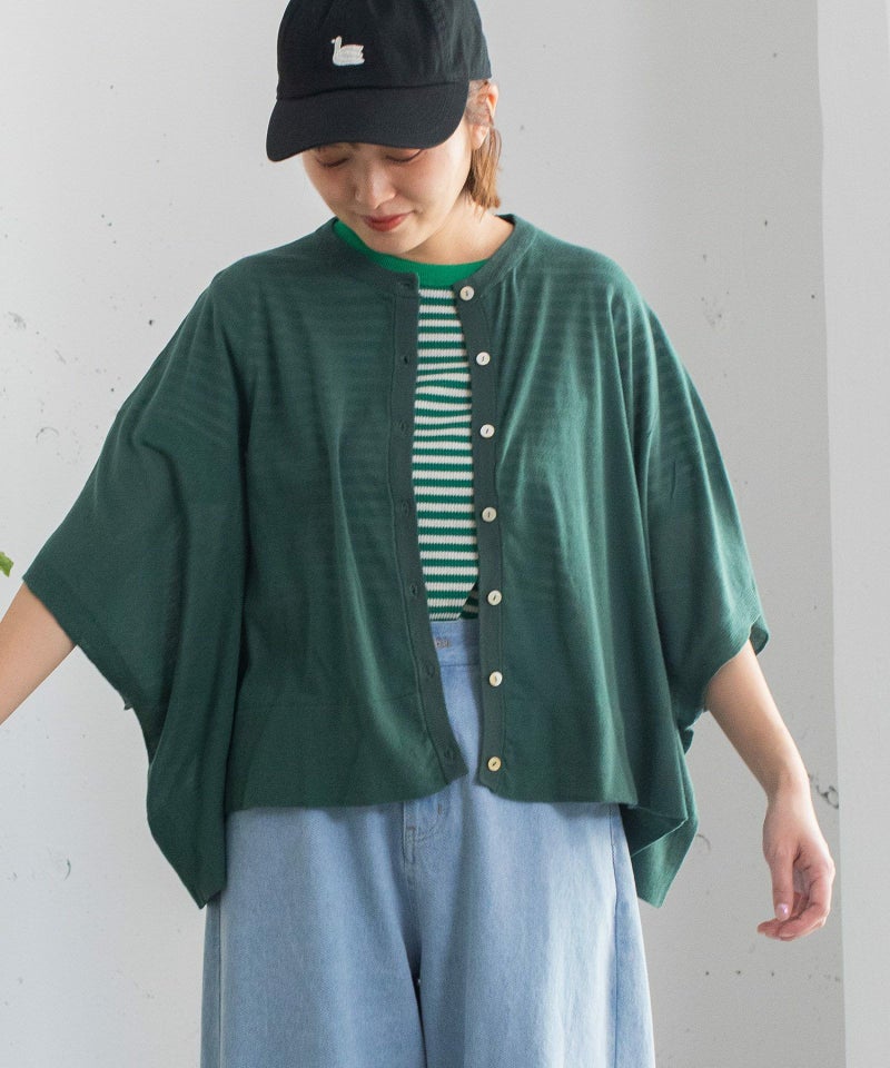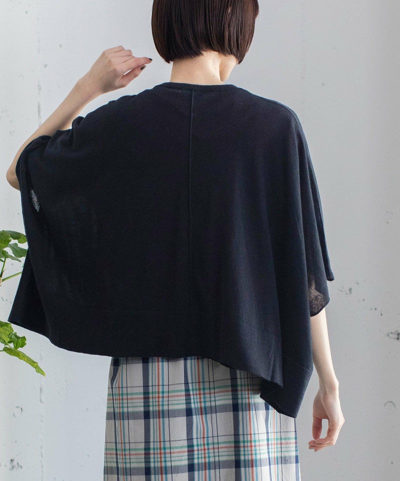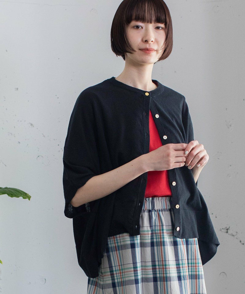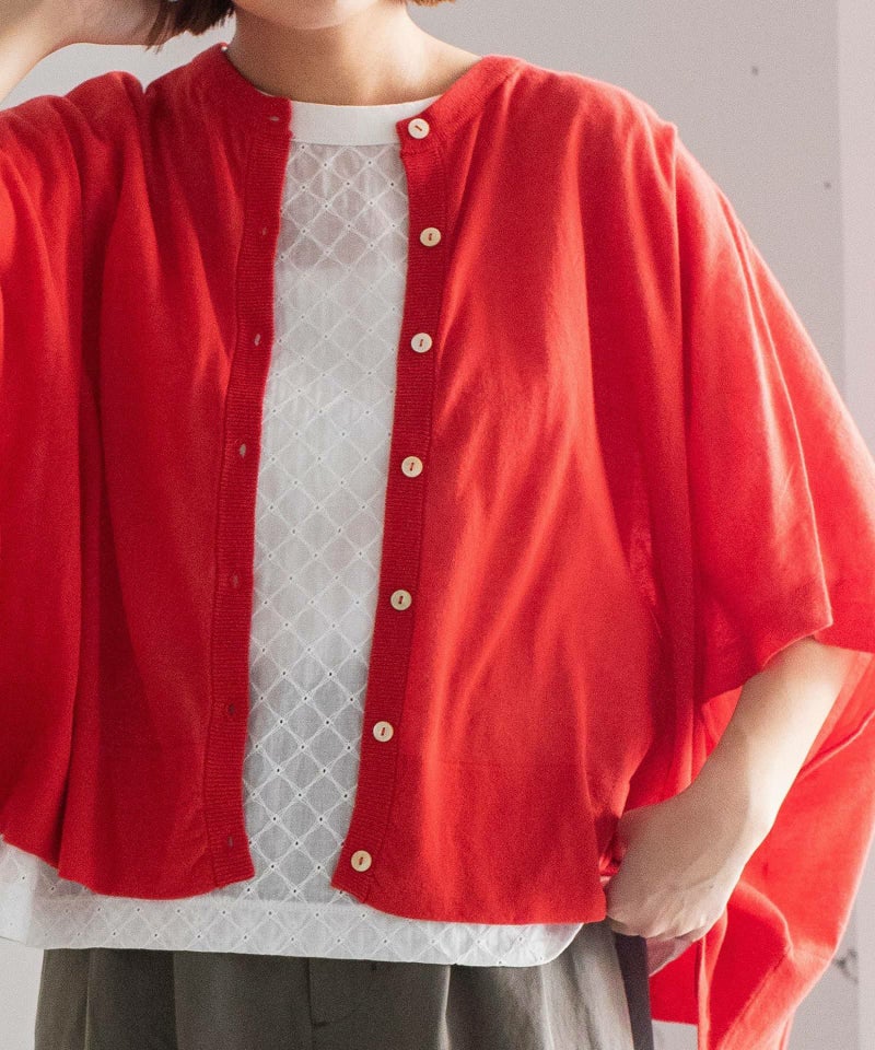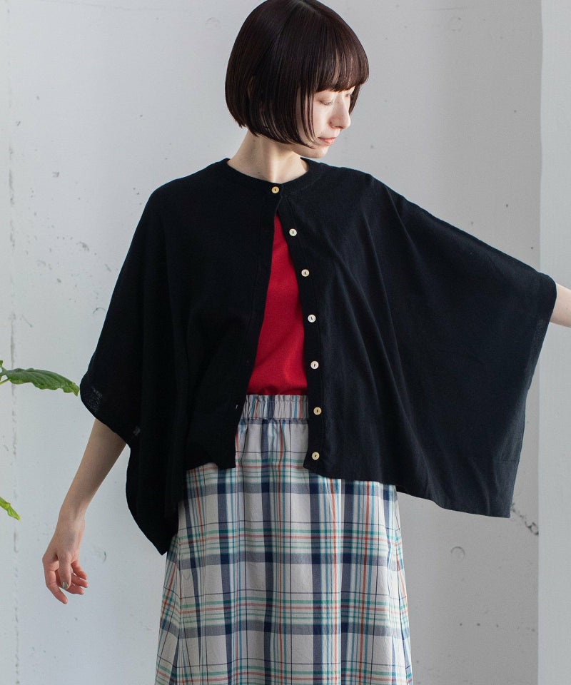 ケープのようなデザインカーディガン。抜け感のある短めの着丈に、たっぷりとしたリラックス感のあるシルエット。サイドの開きが気にならないよう袖下は綴じた仕様にしています。ボタンを留めてプルオーバーとしての着用もおすすめです。清涼感のある、軽くさらっとしたタッチのコットンで、シーズンの変わり目や冷房対策にもご活用いただけるアイテムです。
