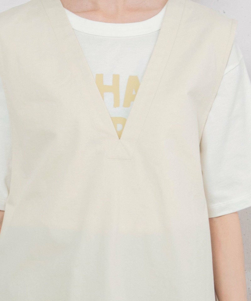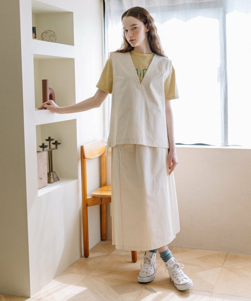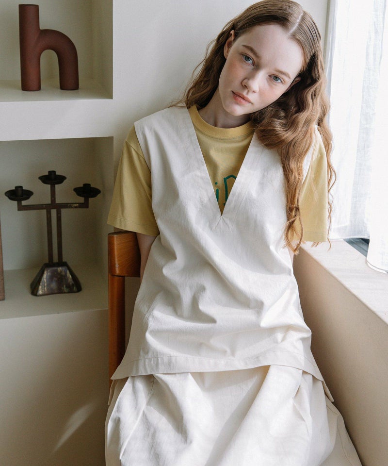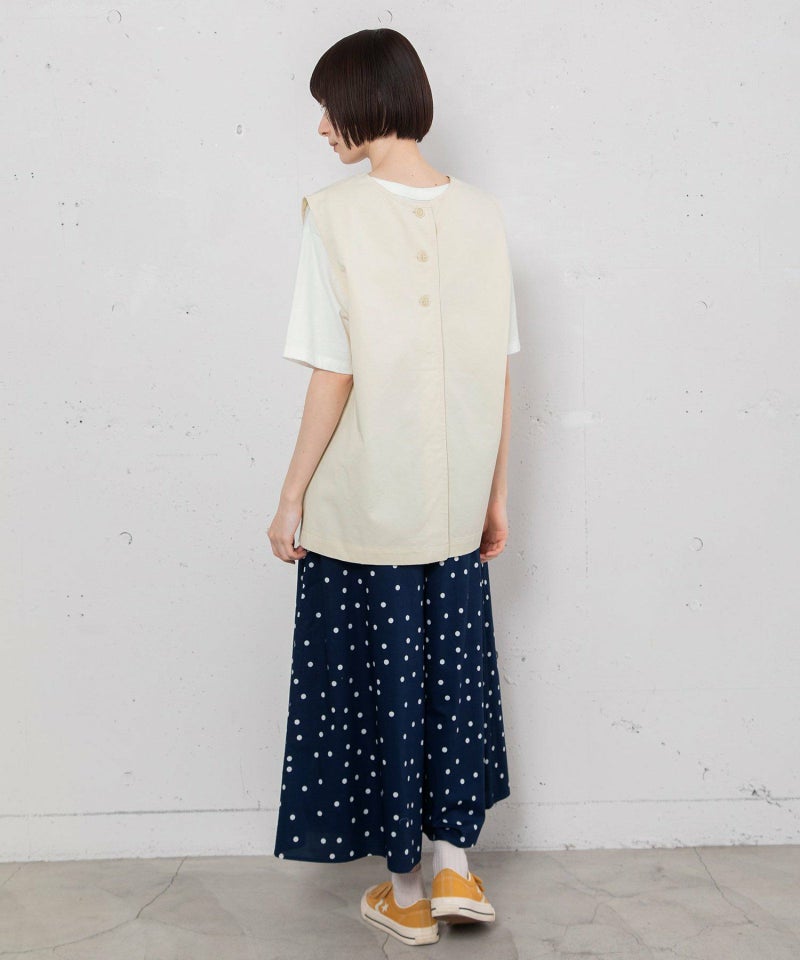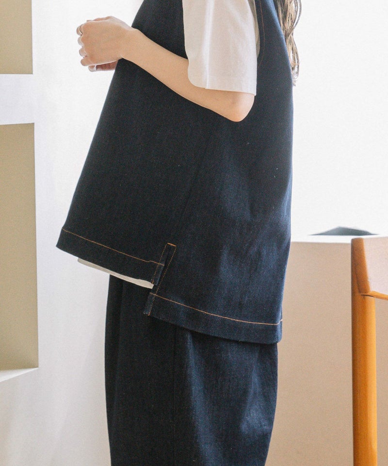 体のラインを拾いにくいゆとりあるボックスシルエットのベスト。程よい厚さのコットンツイルとデニム生地で仕立てました。ブラウスやTシャツ、冬のニットまでいろいろなインナー合わせで着られます。首元のVネックがすっきりした印象をプラス。前後差のある着丈と脇のスリットでサイドスタイルもこなれた雰囲気に。シンプルなデザインで着回し力も高く、デイリーユースにぴったり。デニム素材は配色ステッチでカジュアルに仕上げています。
