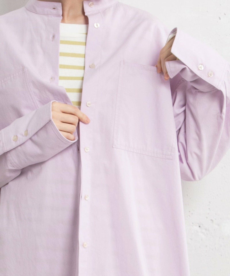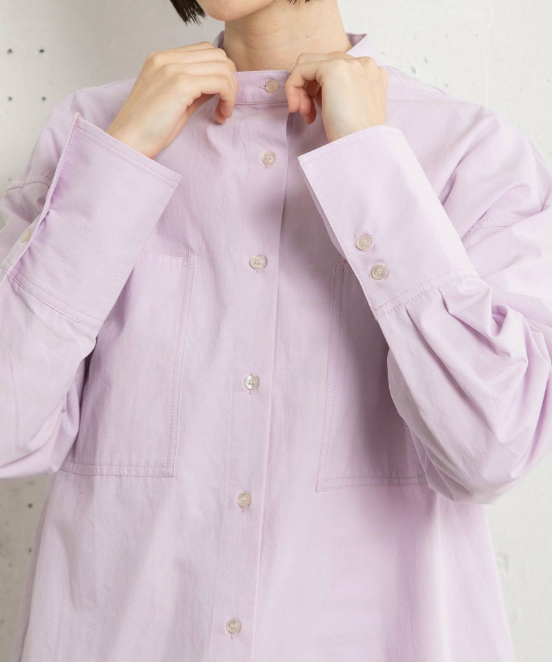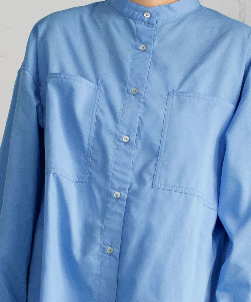 両胸のポケットとロングカフスが特徴的なシャツ。シンプルなオーバーサイズのボックスシルエットに、すっきりとしたバンドカラーでハンサムな雰囲気に仕立てました。バックスタイルは、ボックスタックが入った動きのある仕様。襟を抜いたり、羽織にしたりと、1枚で様々な着こなしを楽しめるアイテムです。