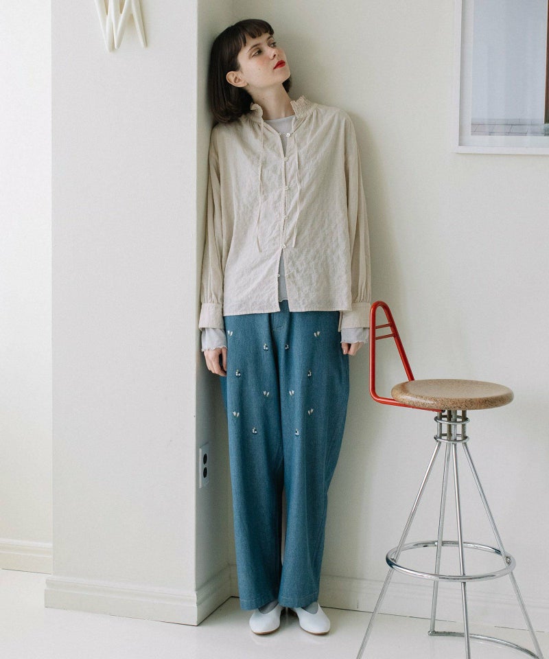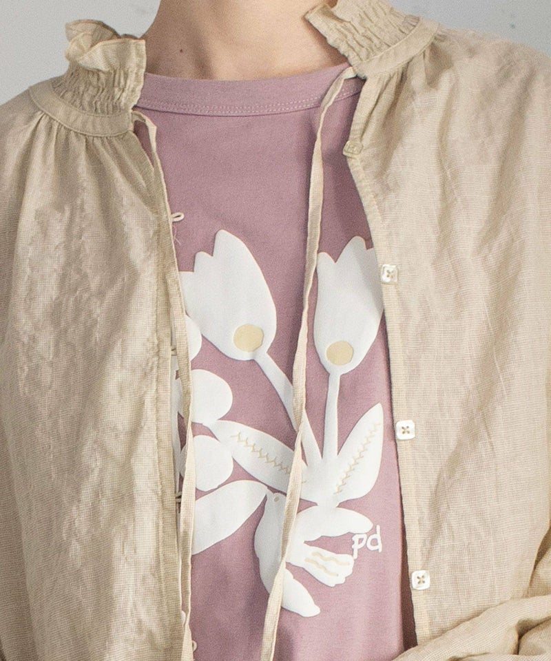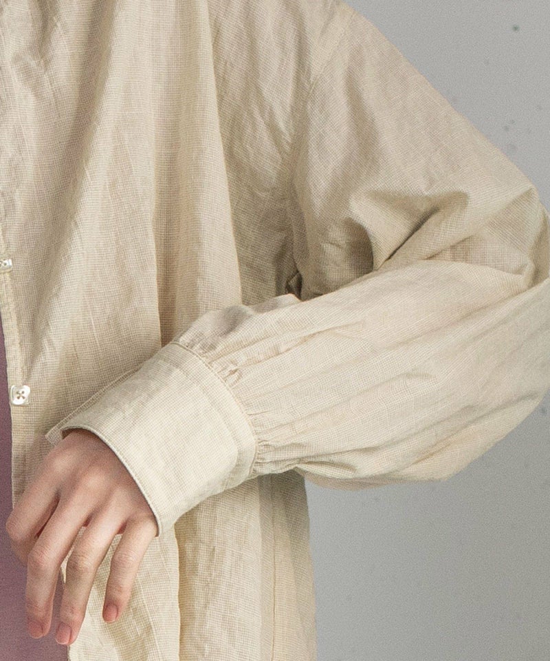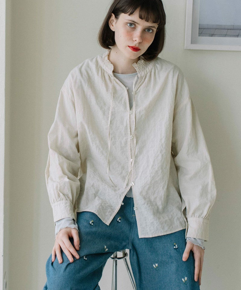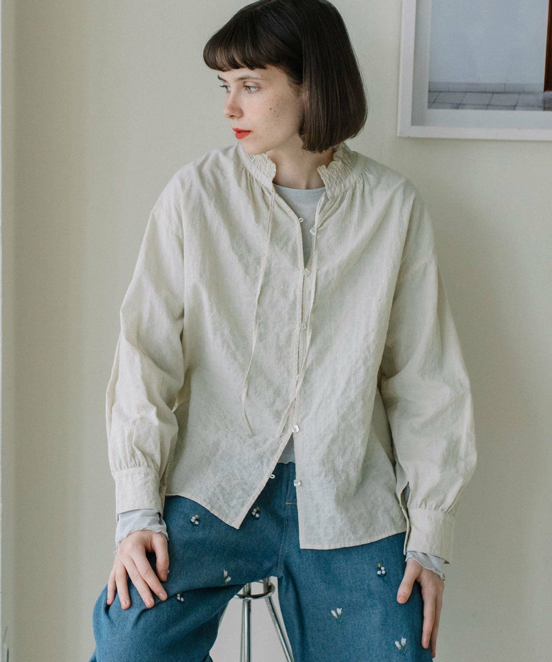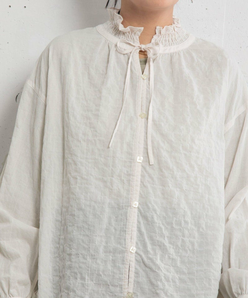 程よい甘さに仕上げた大人のブラウス。軽い肌触りでぽこぽことした素材感が可愛らしい、無地ライクな細かい千鳥柄のオリジナルテキスタイルを使用。シャーリングで作ったフリル襟がポイント。アウターやスウェットの中からのぞかせて、スタイリングのポイント使いにも◎