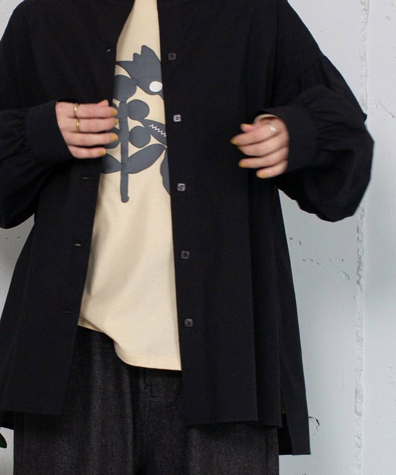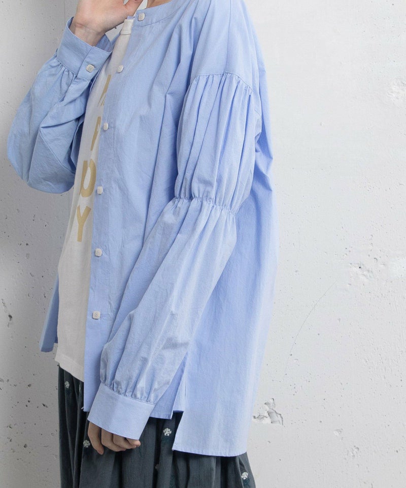 シャーリング袖のボリューム感がポイントのブラウス。ノーカラーで首回りはすっきり、袖口はカフス仕様で甘さを押さえ、ゆとりのあるボックスシルエットでバランスを取っています。こなれた雰囲気でコーディネートが仕上がる洗い晒しコットン生地を使用しています。フルオープンで羽織としても着用頂けます。