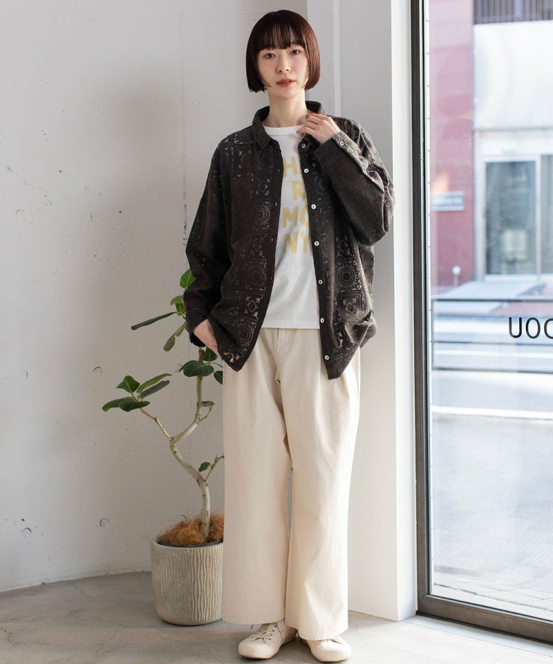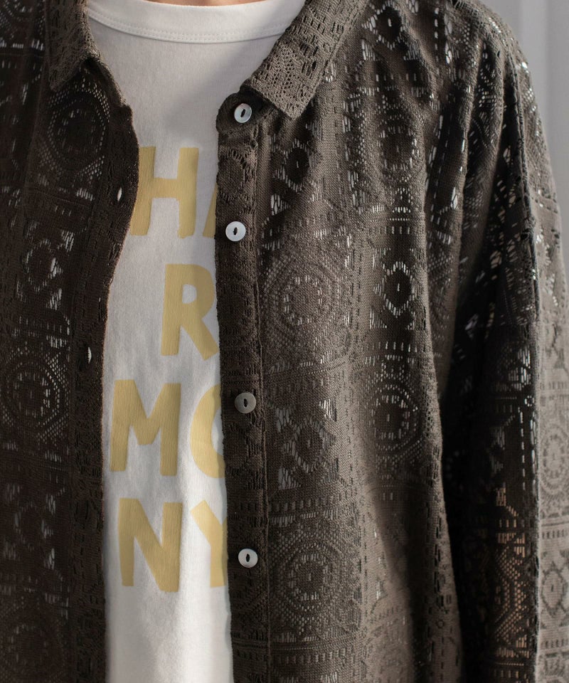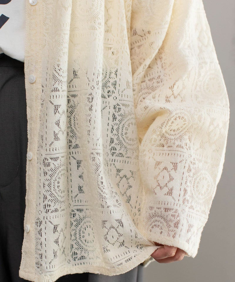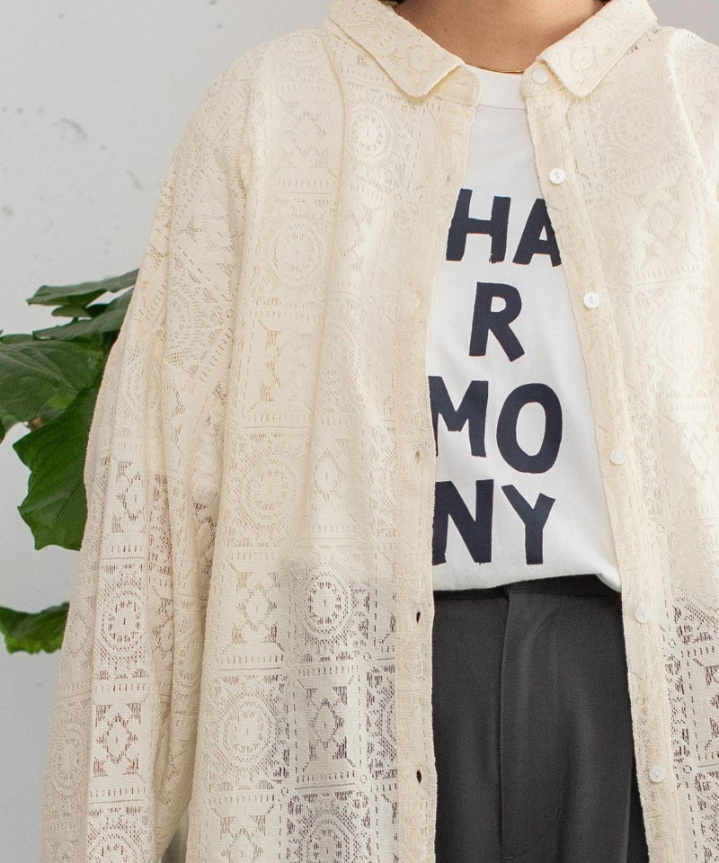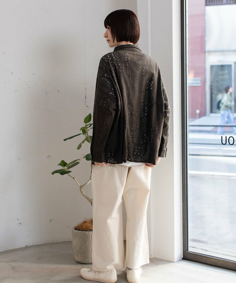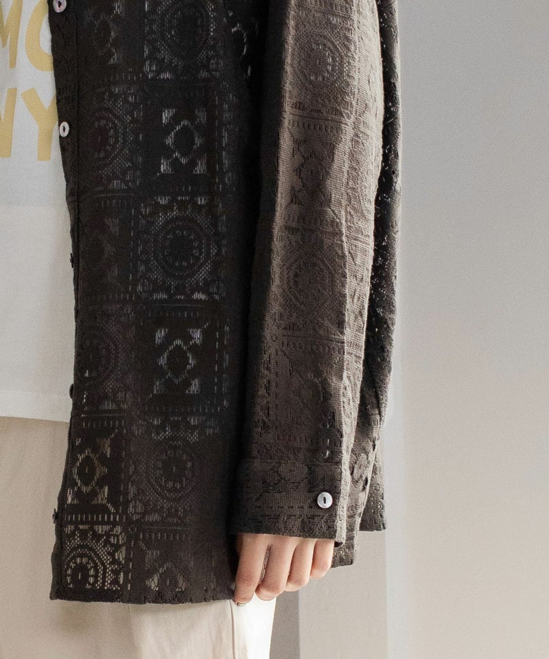 インドの繊細なクロシェレースを使用したシャツカーディガン。サッと羽織りやすいゆとりのあるサイズ感。袖まくりしやすいストレートな袖。いつものコーディネートにプラスするだけでグッとシーズンムードが高まるアイテムです。デニムやきれいめのトロ素材など、素材のコントラストをつけたスタイリングがおすすめ。