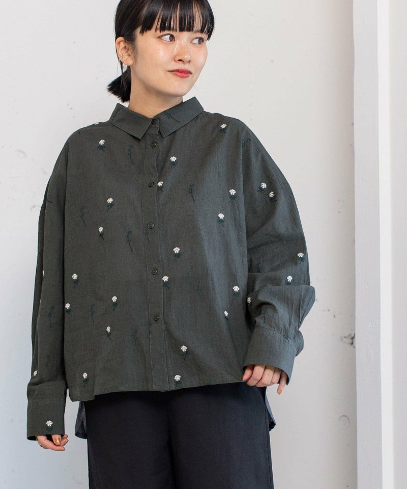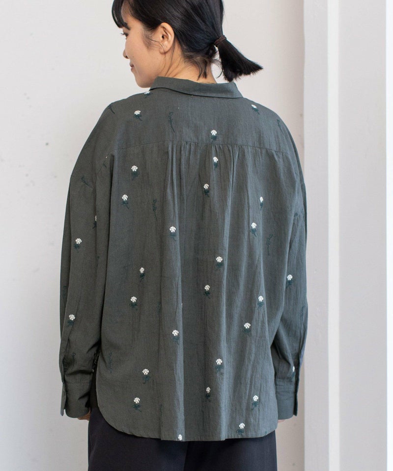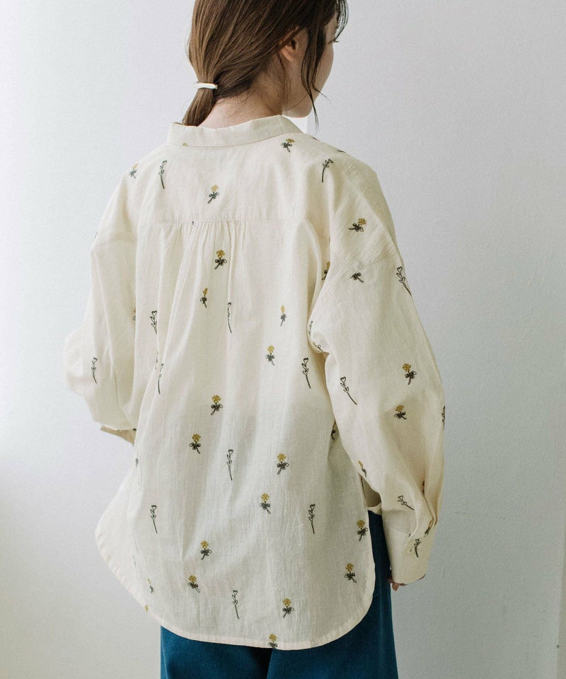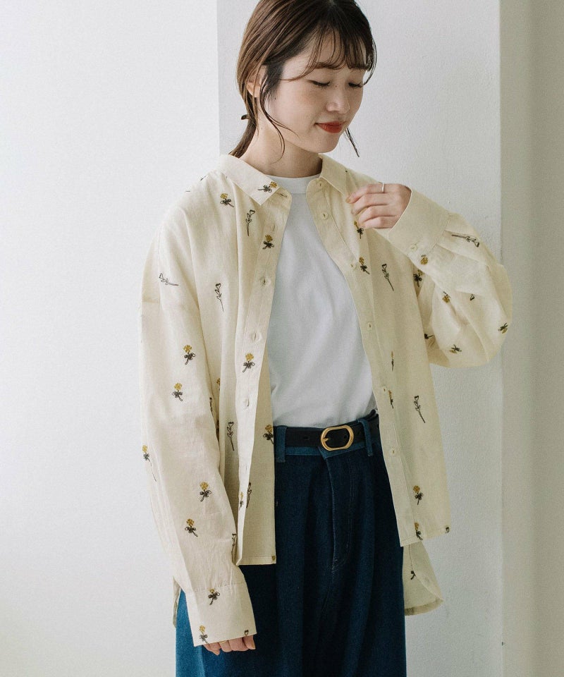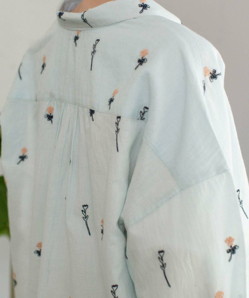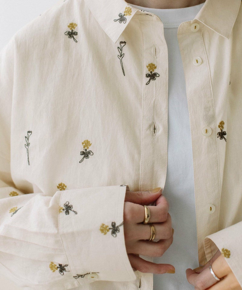 インド綿をベースにシロツメクサ(White clover)の刺繍を施した生地を使用した、心が春めくシャツ。落ち肩でゆったりと着られます。素材を生かしたシンプルなシルエットながら、刺繍を身にまとう特別感のあるアイテムです。羽織としても着られます。