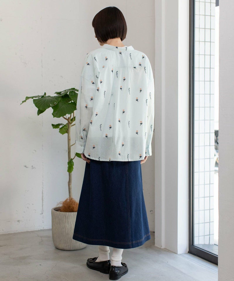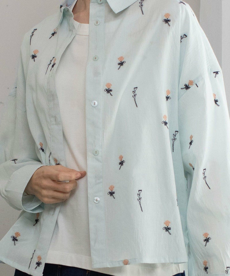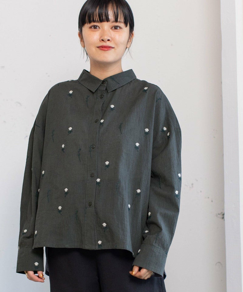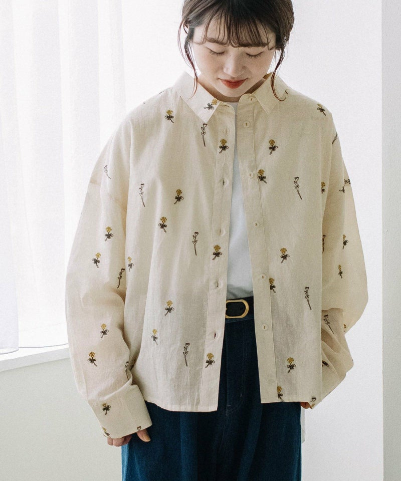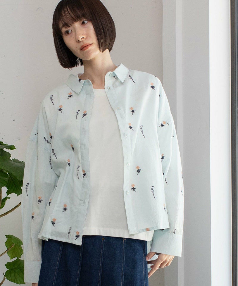 インド綿をベースにシロツメクサ(White clover)の刺繍を施した生地を使用した、心が春めくシャツ。落ち肩でゆったりと着られます。素材を生かしたシンプルなシルエットながら、刺繍を身にまとう特別感のあるアイテムです。羽織としても着られます。