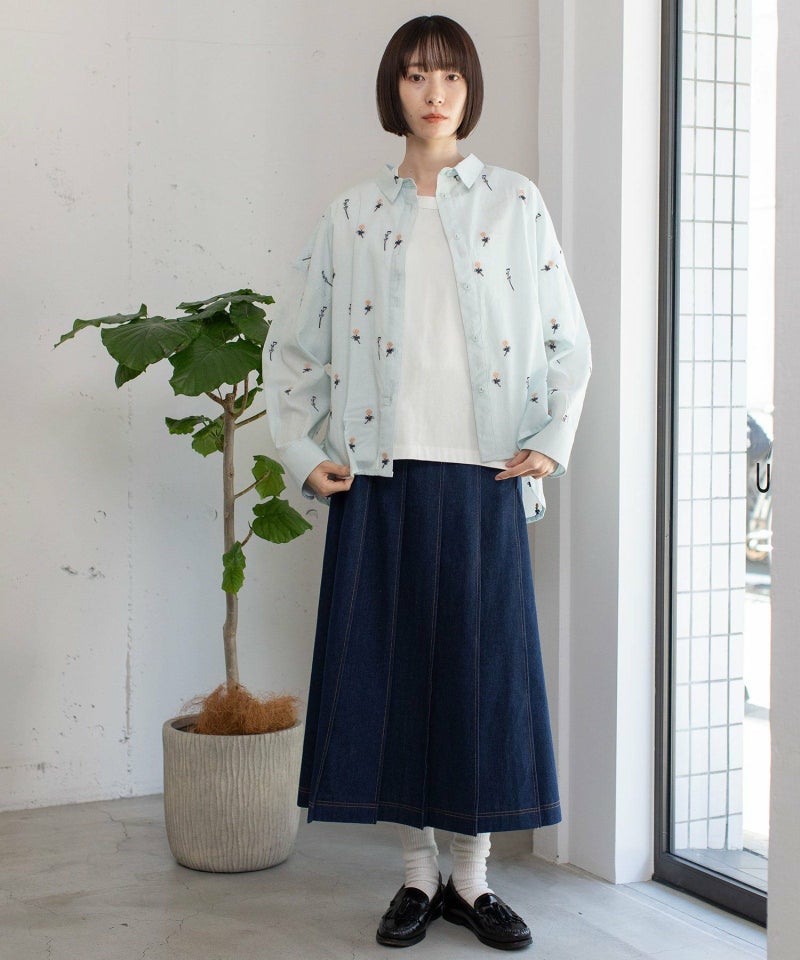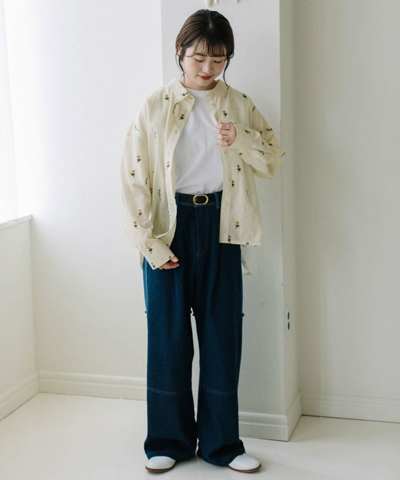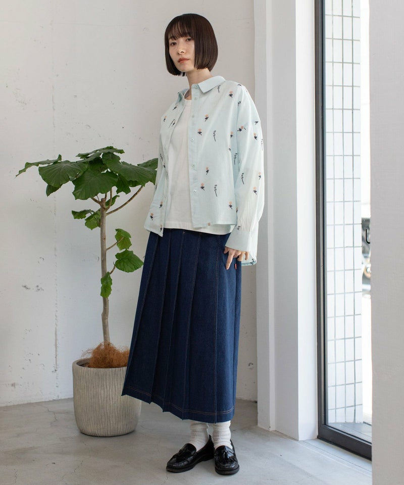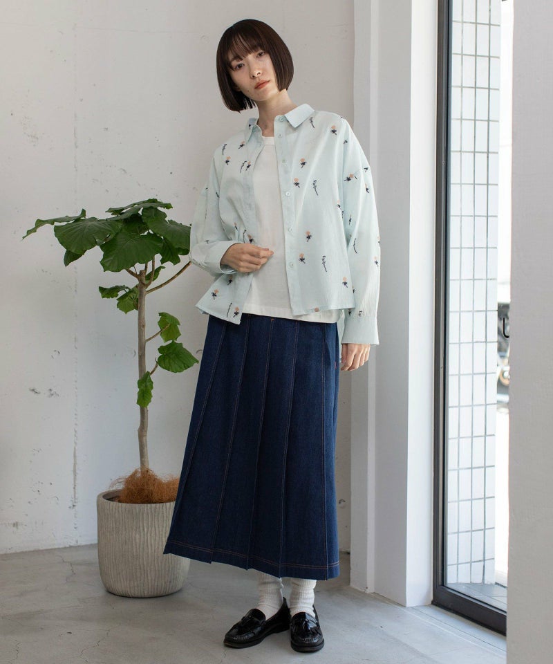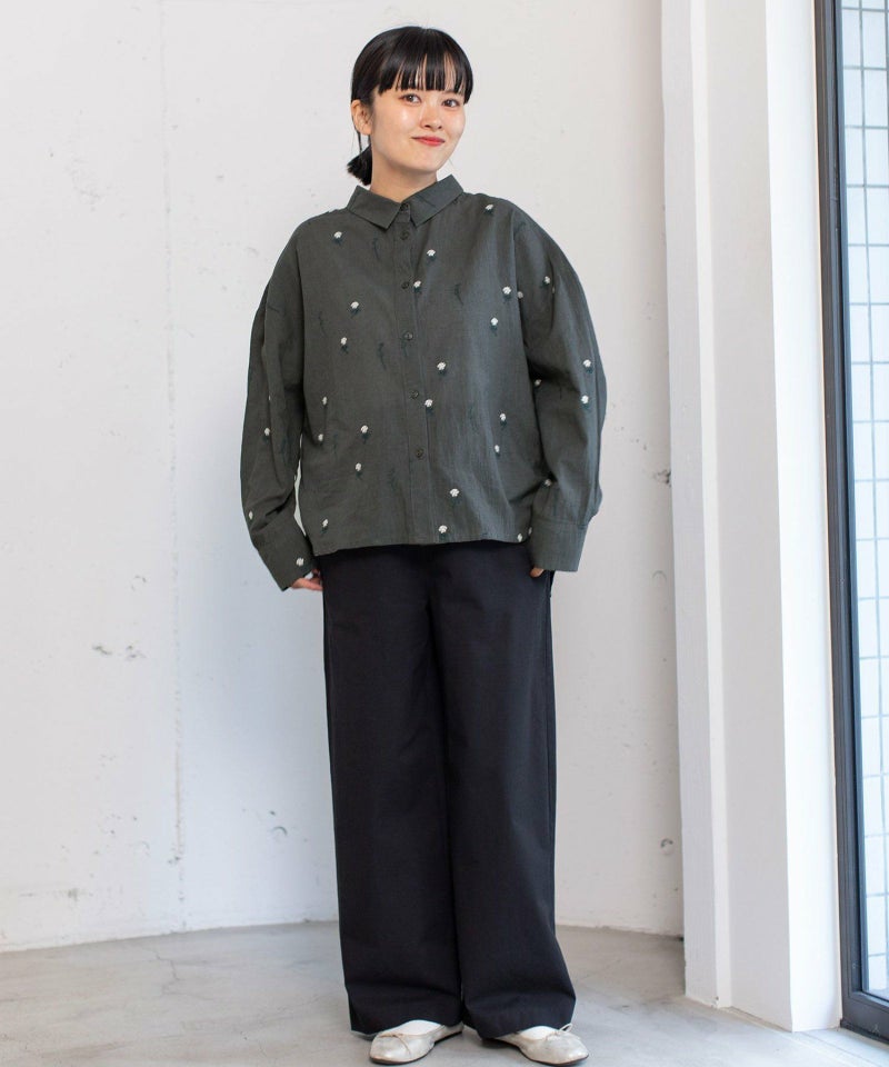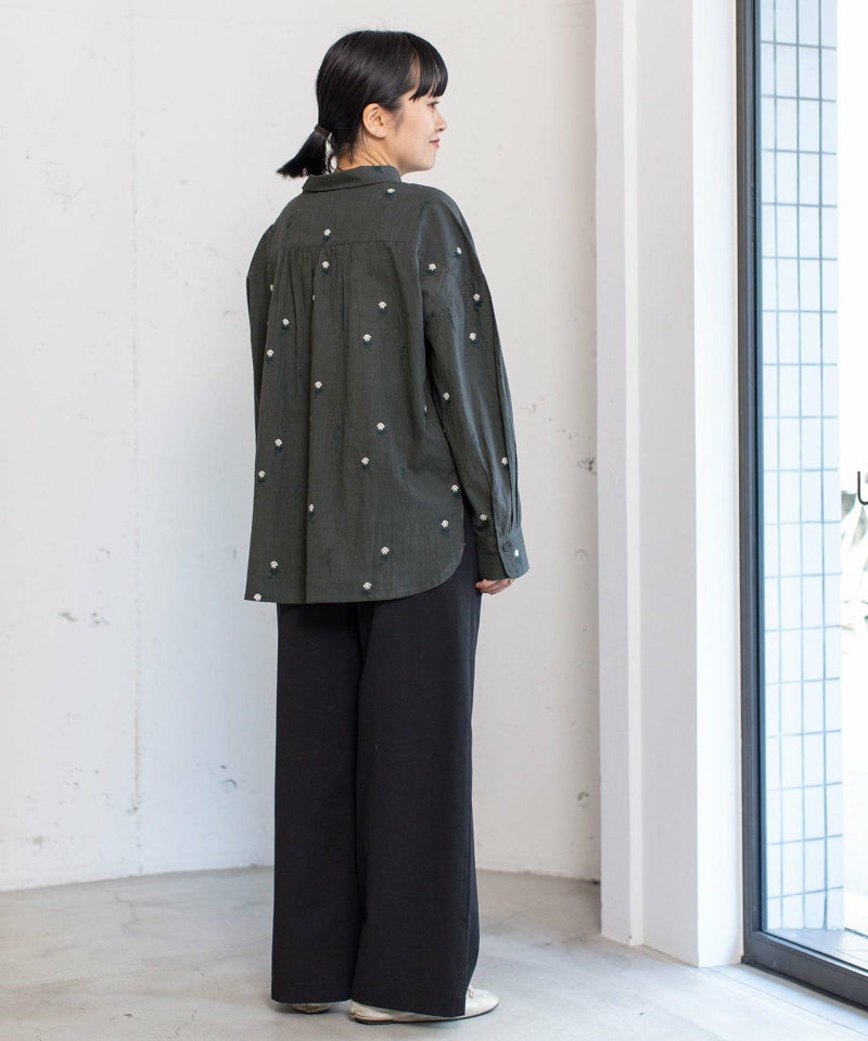 インド綿をベースにシロツメクサ(White clover)の刺繍を施した生地を使用した、心が春めくシャツ。落ち肩でゆったりと着られます。素材を生かしたシンプルなシルエットながら、刺繍を身にまとう特別感のあるアイテムです。羽織としても着られます。