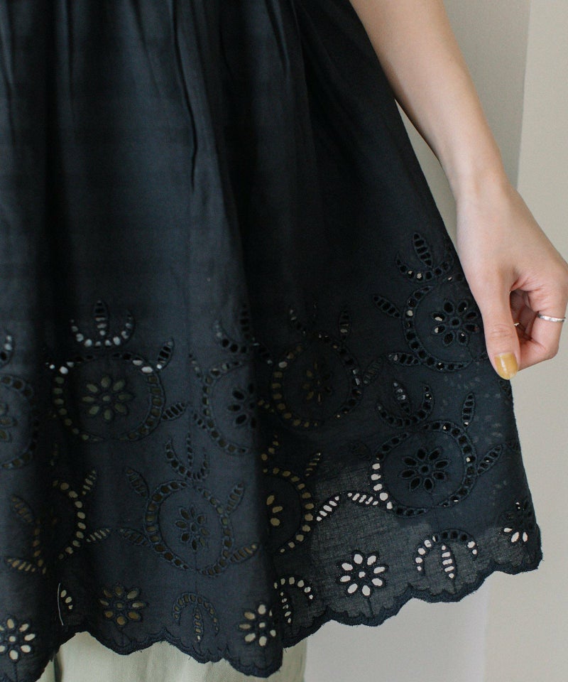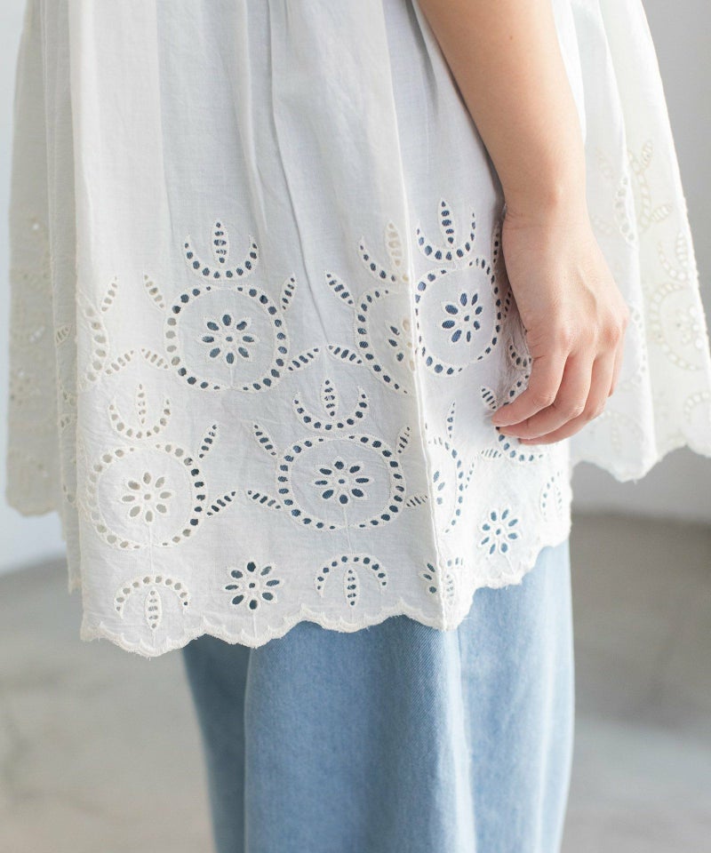 裾に印象的な柄のシフリー刺繍と、スカラップ刺繍にカットワークを施した、繊細な手仕事が光るインド製ならではの仕上がりのキャミソール。Tシャツにレイヤードするだけで、ラフな夏のスタイリングをブラッシュアップしてくれるアイテムです。肩紐で長さの調節が可能です。