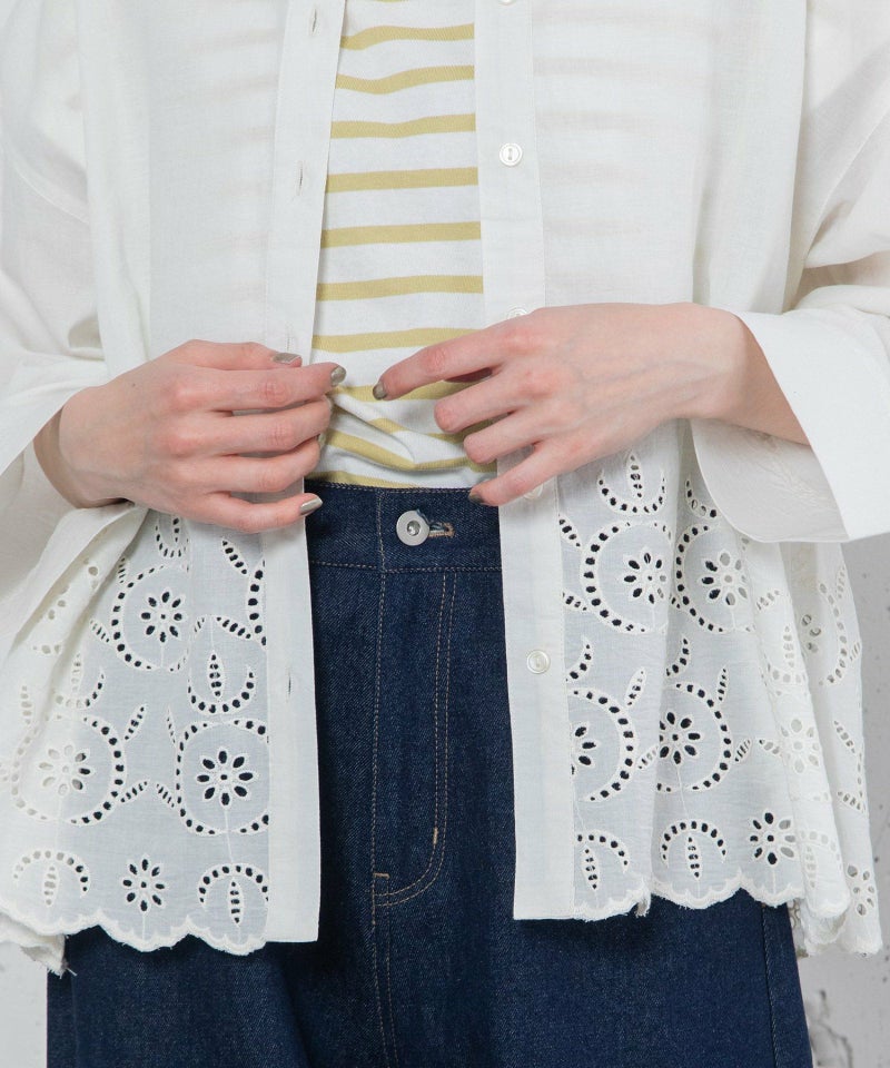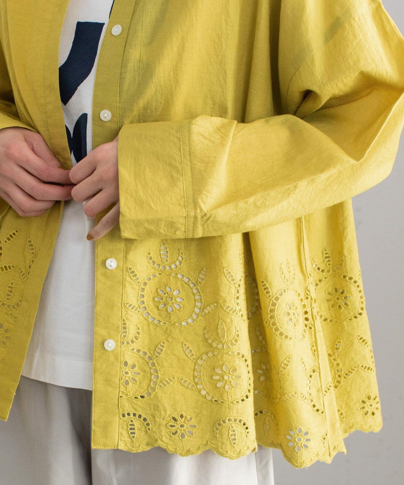 裾に印象的な柄のシフリー刺繍と、スカラップ刺繍にカットワークを施した、繊細な手仕事が光るインド製ならではの仕上がりのシャツ。ゆとりのあるボックスシルエットに、抜け感のある少し短めの丈感。袖まくりしやすいストレートな袖になっています。一枚着としてはもちろん、フルオープンで羽織りとしてもキマります。冷房や日差し対策としても活躍◎いつものコーディネートにプラスするだけでグッとシーズンムードが高まるアイテムです。