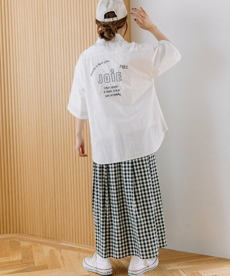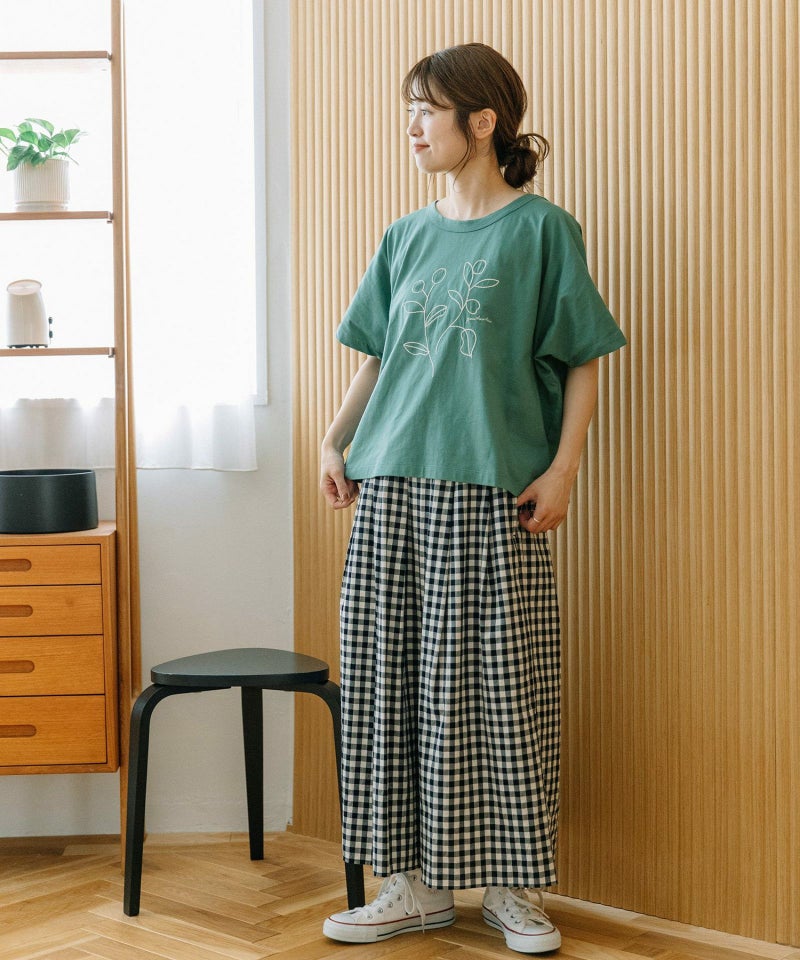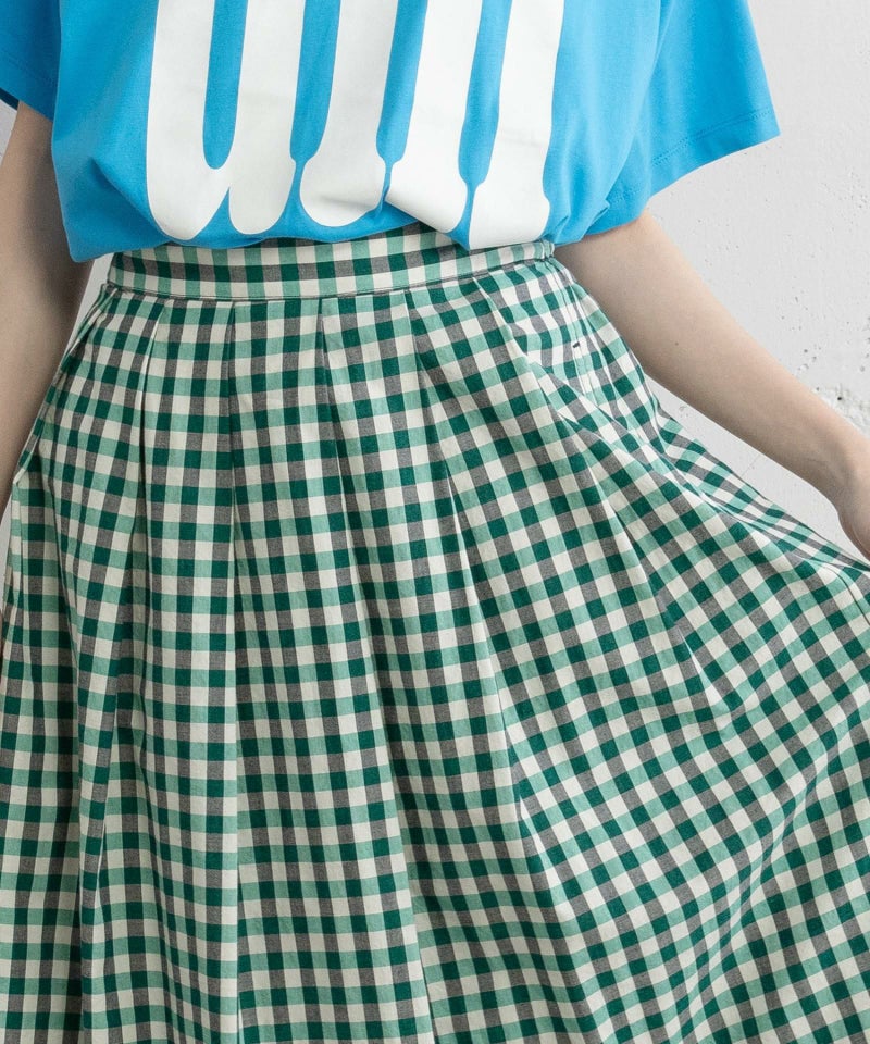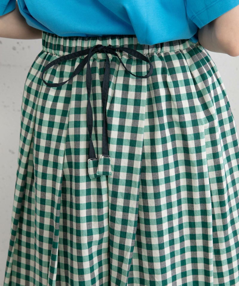 アイボリーをベースに、縦と横で異なる色を組み合わせたオリジナルのギンガムチェックテキスタイルのスカート。タックを取り裾に向かってふんわりと広がるシルエット。ウエストバッグはゴムと紐でサイズ感の調節ができます。両サイドポケット付き。シンプルなTシャツやブラウスと合わせてもコーディネートのアクセントになります。