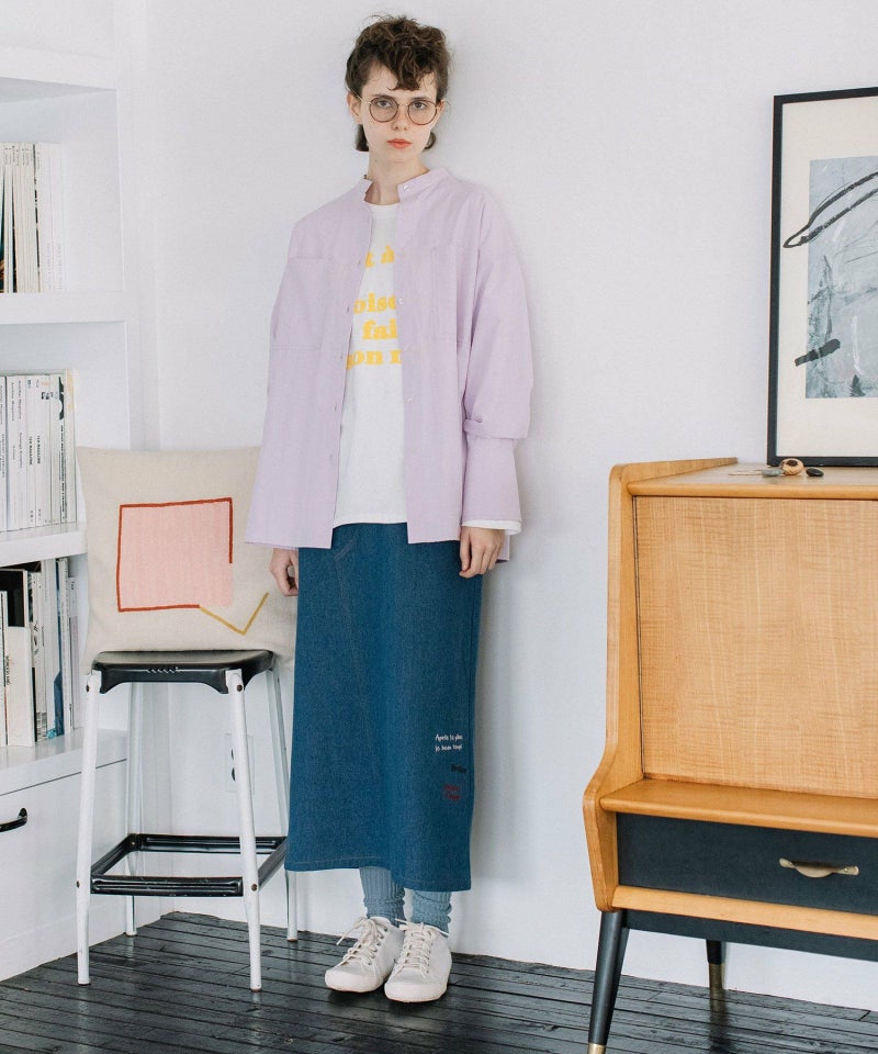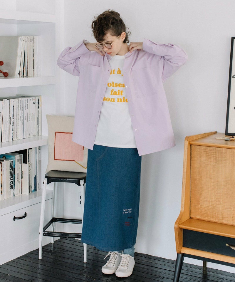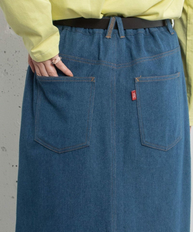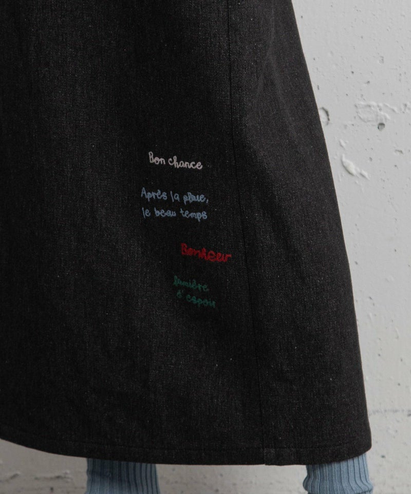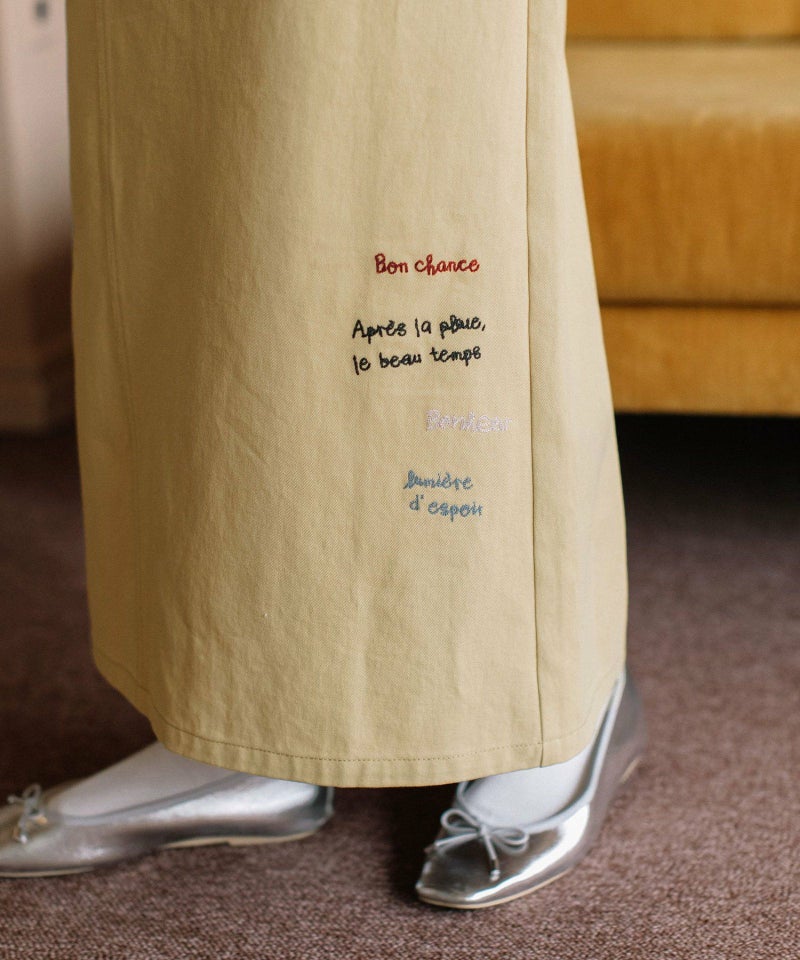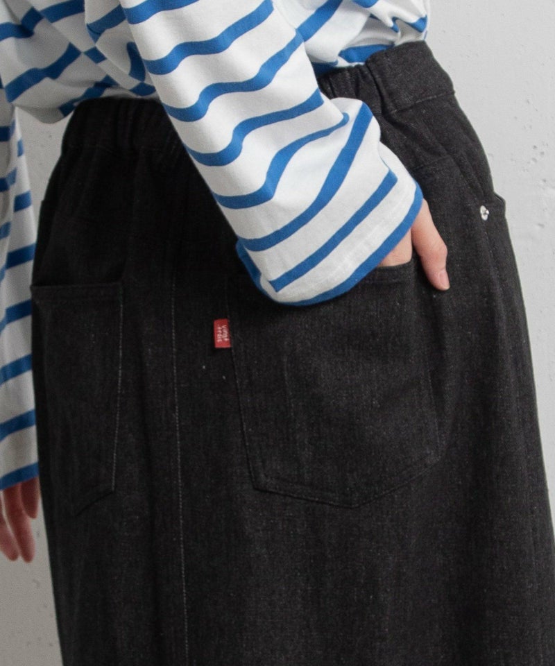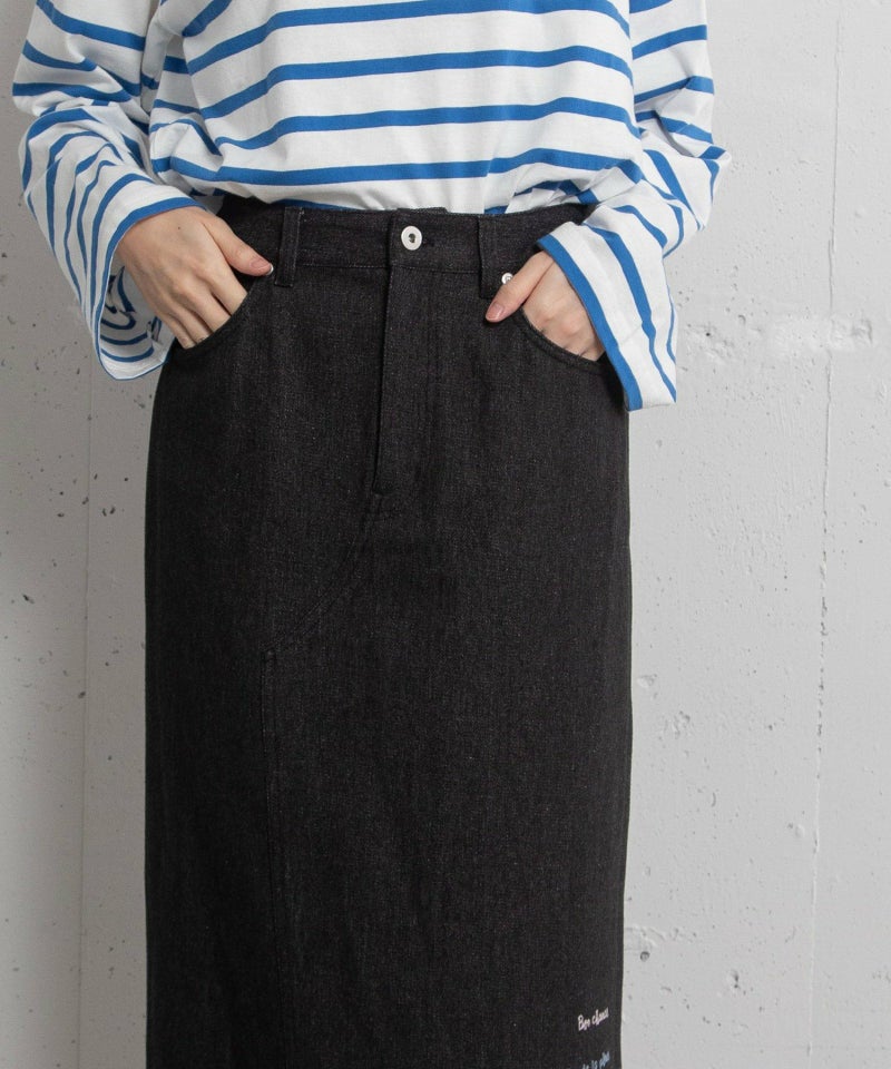 裾のメッセージ刺繍がポイントのナロースカート。大人カジュアルに着られるシンプルなリメイク風の切り替えデザイン。ラフにすっきりと履けるこだわりのシルエットで、脚をまっすぐきれいに見せてくれるスタイルアップ効果も◎オールシーズン着られる、着回しが効く万能アイテムです。ベージュはツイル、ブラック・フェードはデニム。バックウエストゴム仕様でラクな履き心地。両サイド・ヒップにポケット付き。オリジナルピスネームが付いています。
