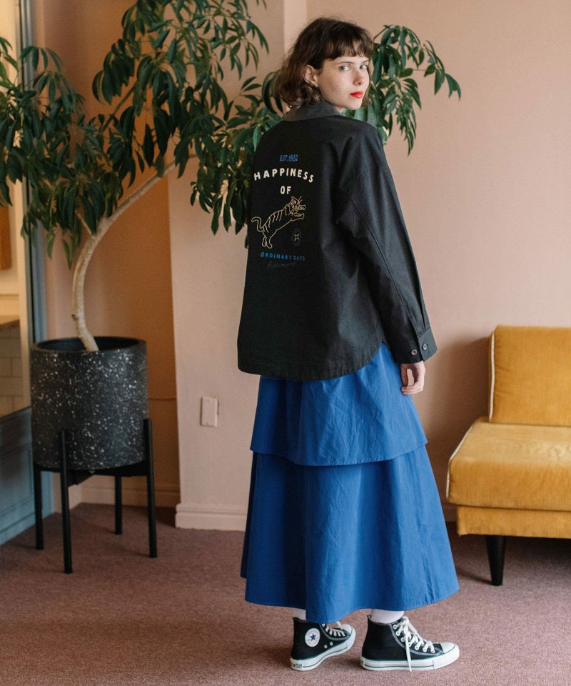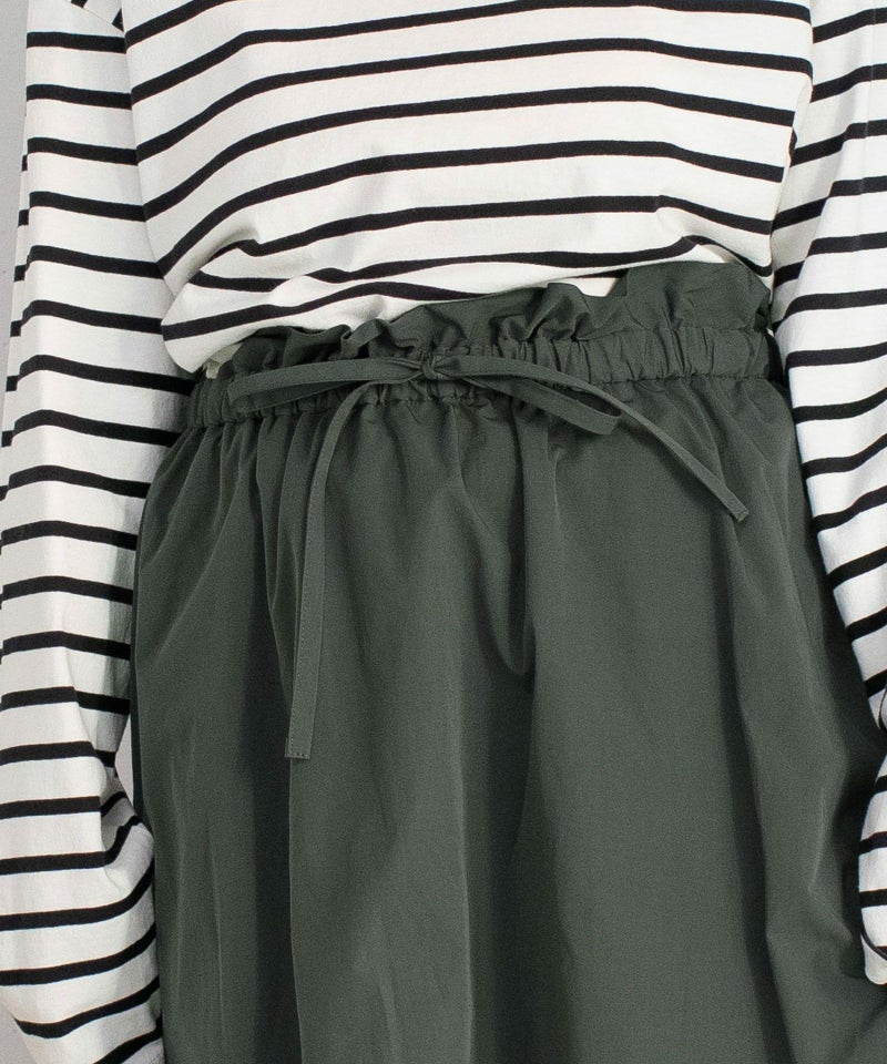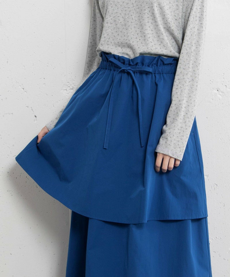 大胆な2段ティアードデザインのフレアスカート。程よく張りのあるナイロン混のコットン素材で、甘さを抑えたカジュアルな雰囲気に仕立てました。スウェットと合わせるラフなスタイリングがおすすめ。ウエストゴム仕様でラクな履き心地。両サイドポケット付き。