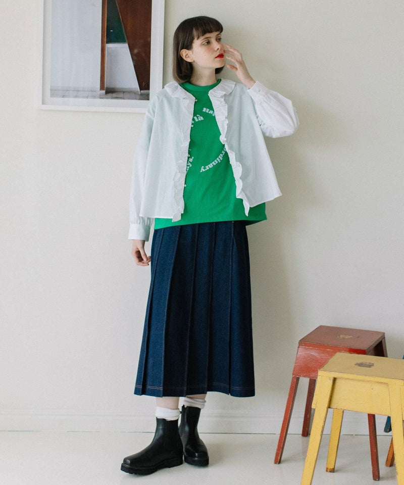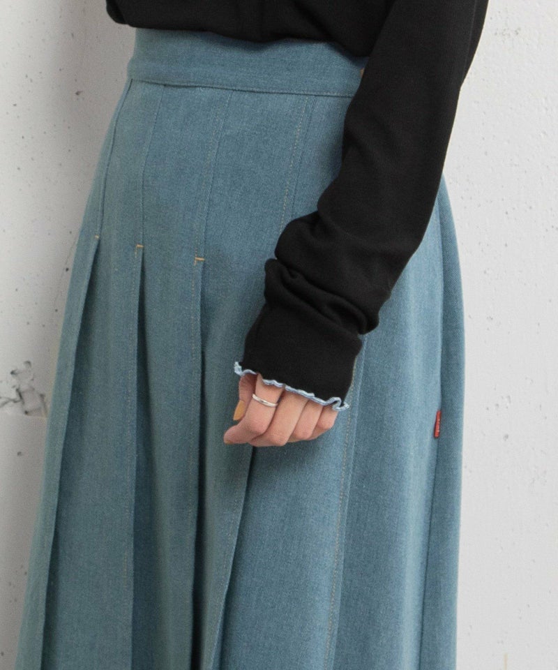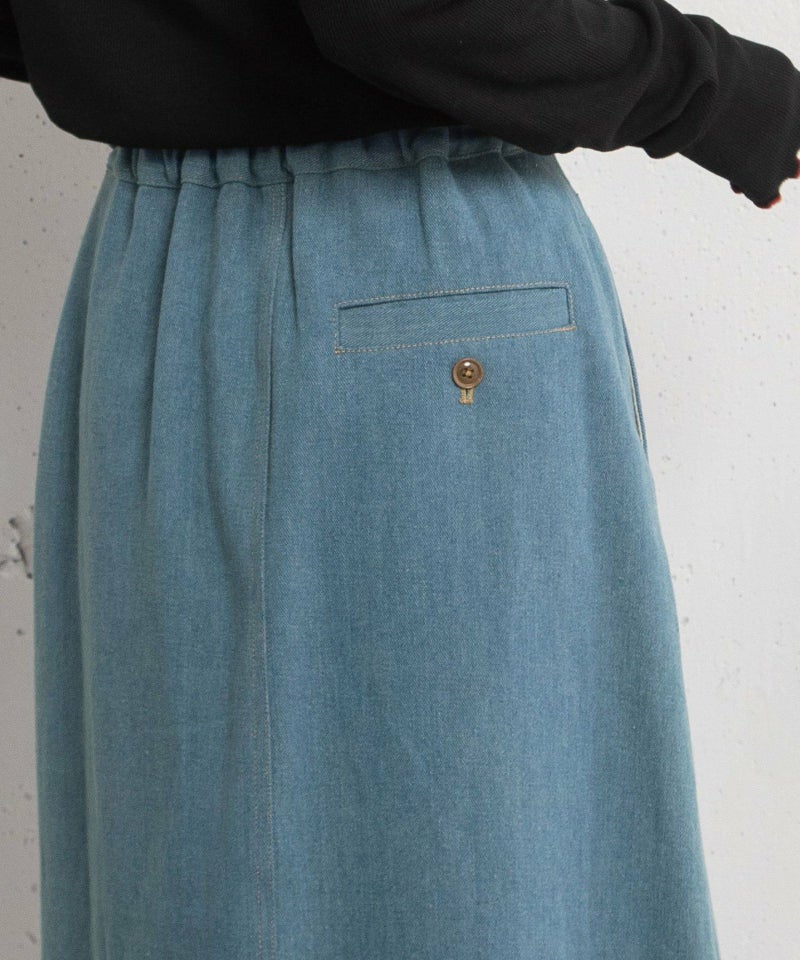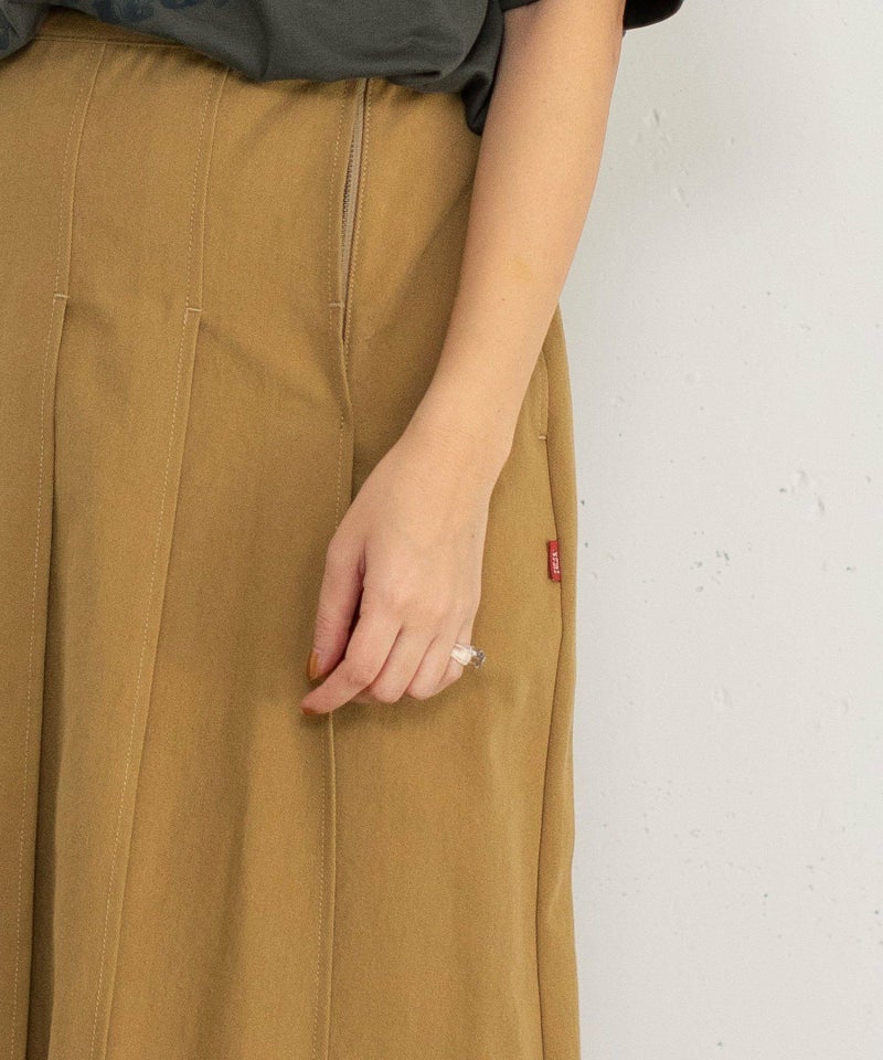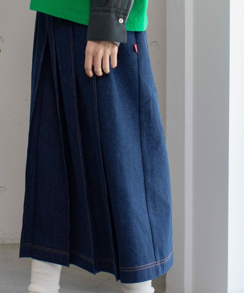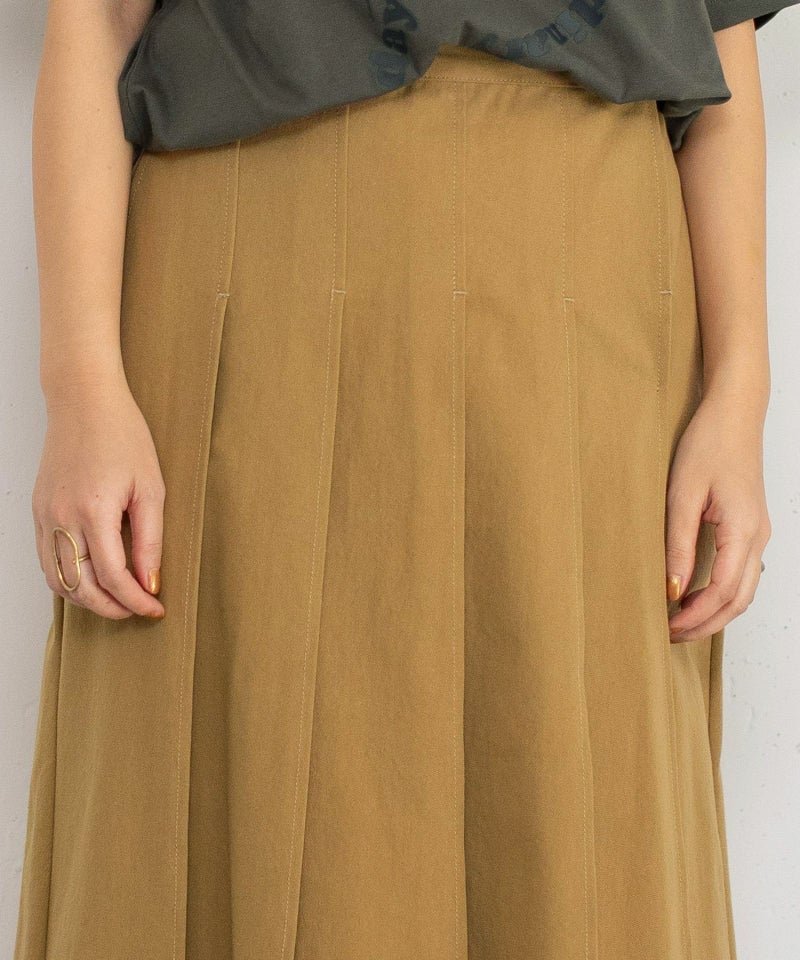 ステッチを効かせたプリーツ風デザインのスカート。オールシーズン活躍するコットン素材のアイテムです。広がりすぎない、きれいなシルエットライン。バックはゴムギャザー仕様で腰回りがすっきりと見え、体のラインを拾わずスタイルアップして見せてくれます。両サイド・右ヒップにポケット付き。サイドファスナー付き。