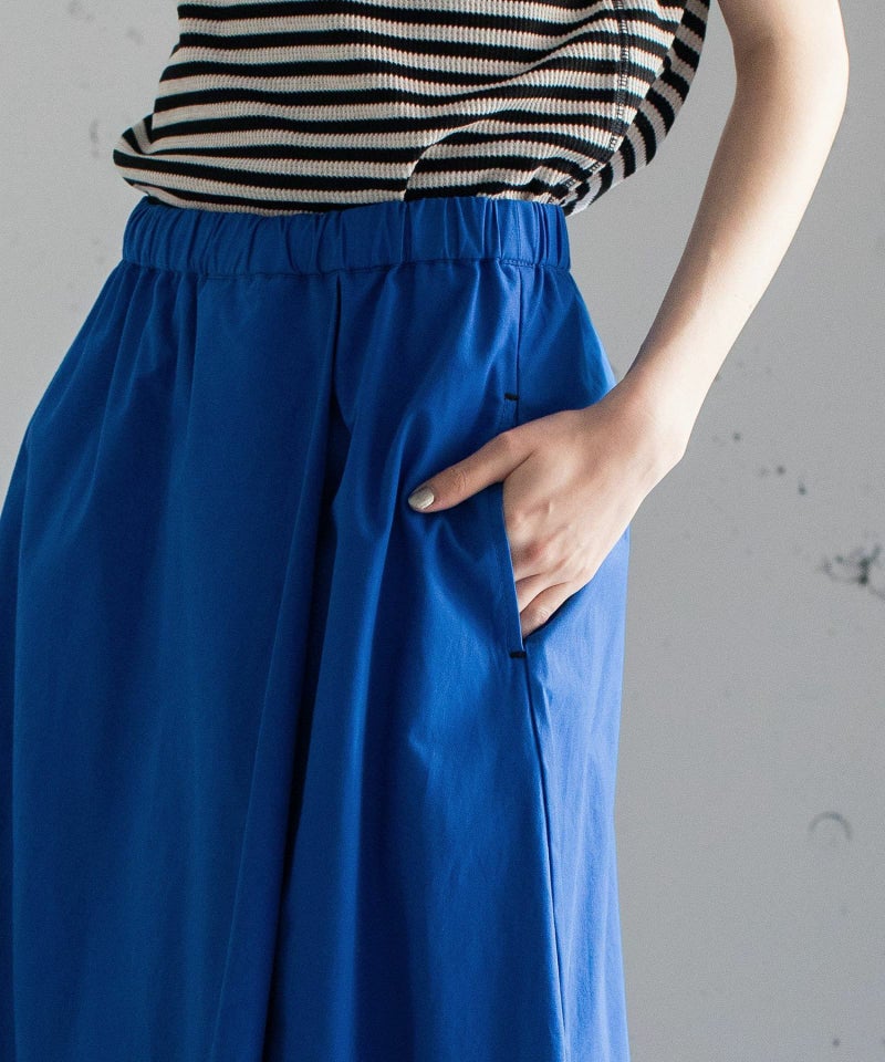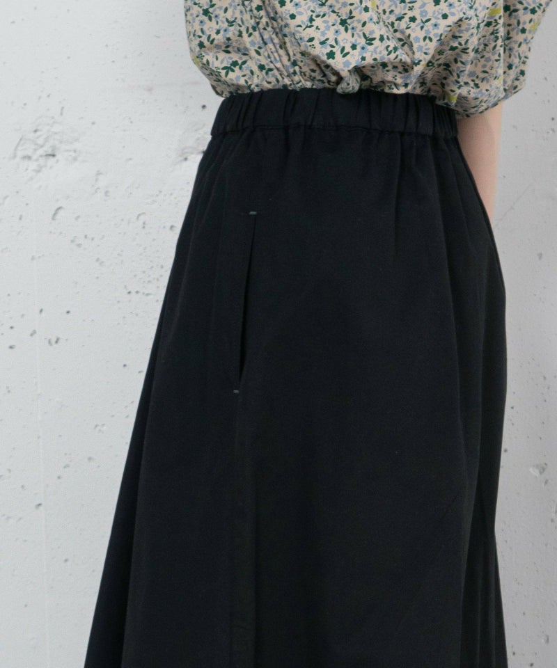 トレンド感のあるラップディテールとフィッシュテールを組み合わせたデザインスカート。裾に動きが出るデザインで、シンプルなトップスを合わせても新鮮な着こなしになります。高密度で適度なハリ感があるウェザークロスを使用しました。緻密できれいな表面感が特徴の素材です。裾のメッセージ刺繍がポイントになっています。ウエストはゴム仕様、内紐でサイズ感の調節ができます。両サイドポケット付き。