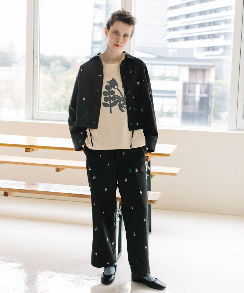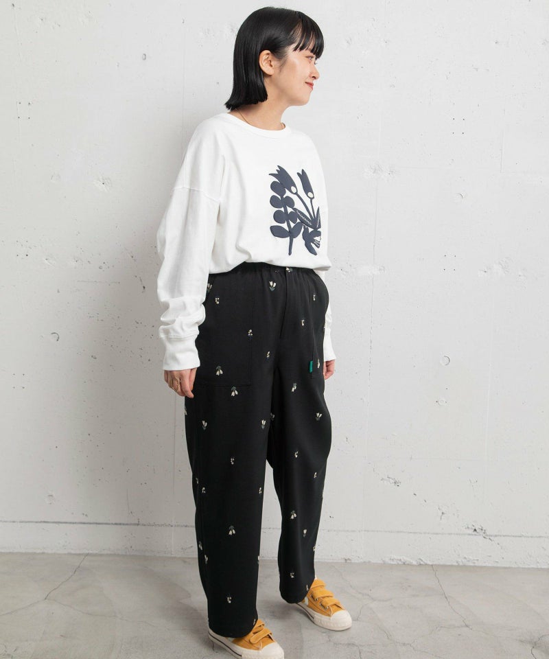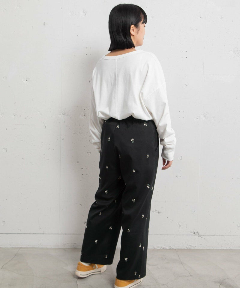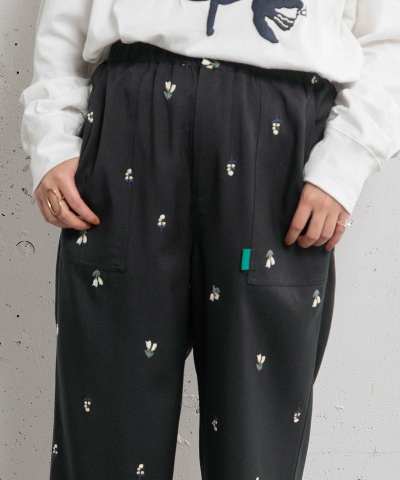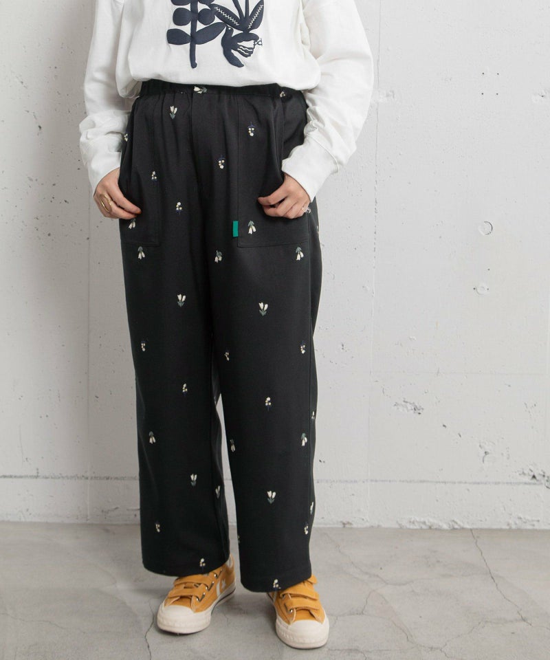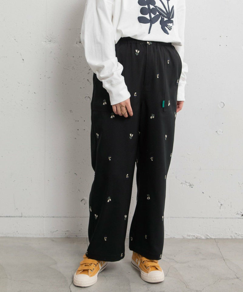 オリジナルの花モチーフを刺繍した、ストレートでややワイドなシルエットのペインターパンツ。シンプルなスタイルのアクセントになるアイテムです。ウエストはぐるりゴム、フロントのファスナーあきでヒップ周りを少しすっきりさせました。両サイドポケットあり。