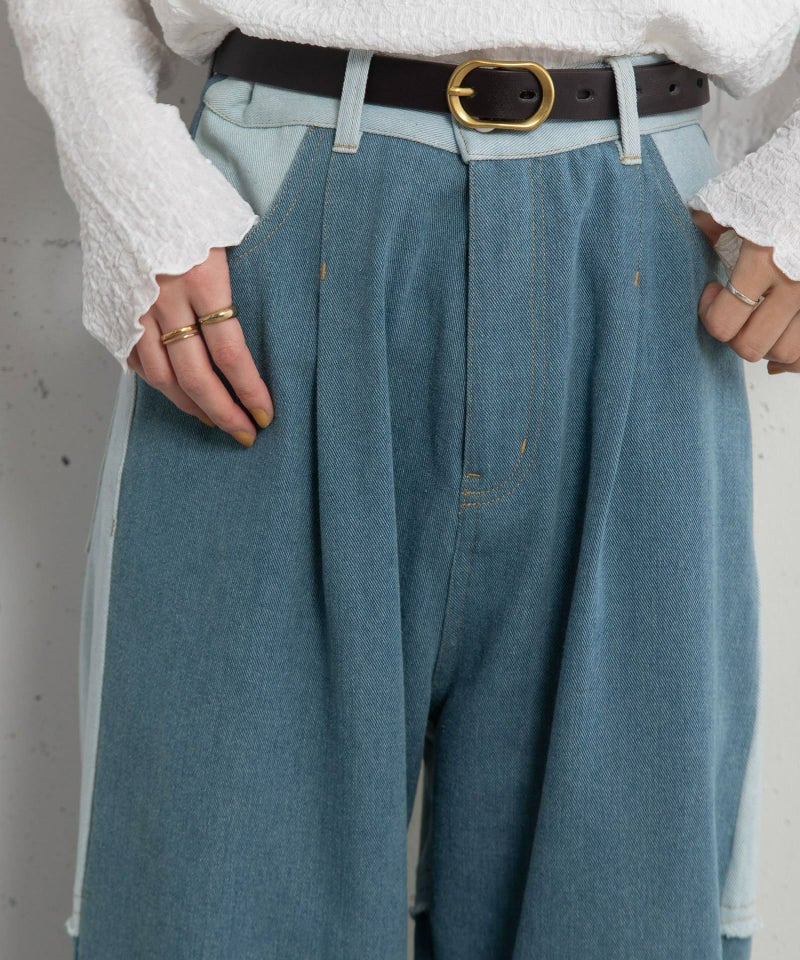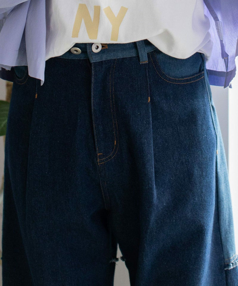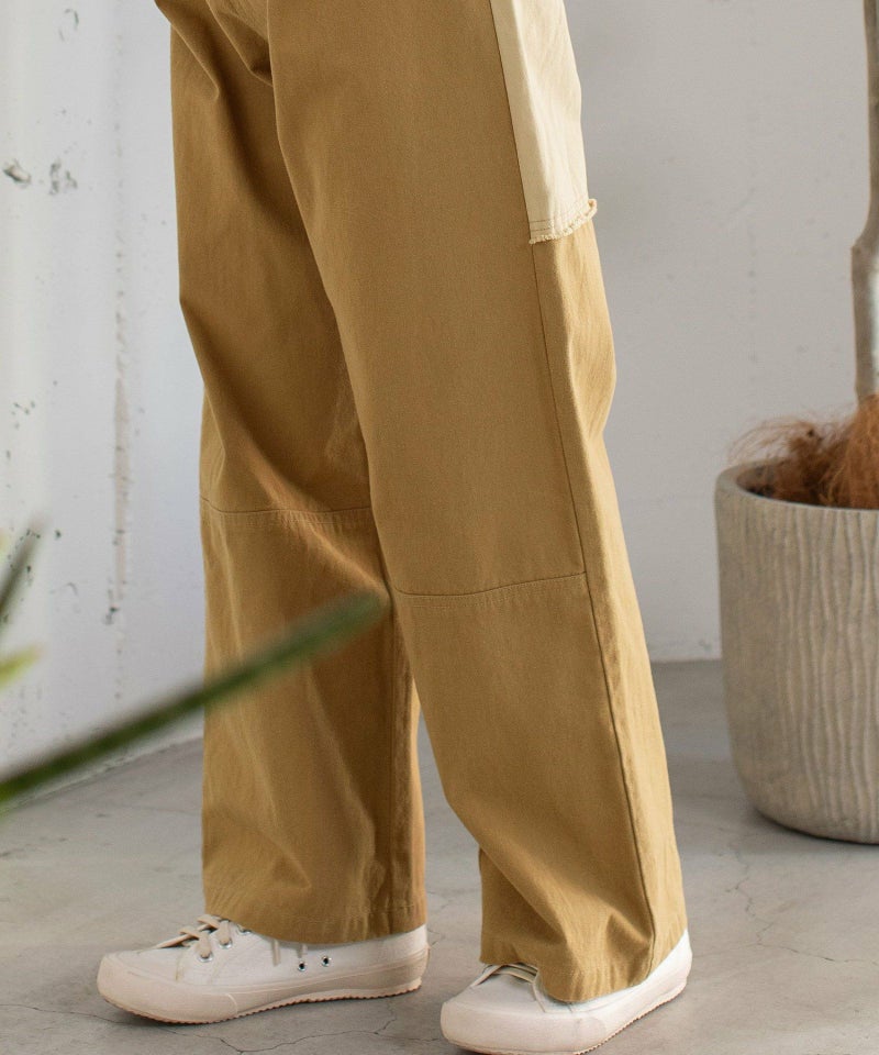 遊び心を効かせたリメイク風デザインのパンツ。オールシーズン活躍するコットン素材のアイテムです。リメイク風に接ぎを入れ、カラーを組み合わせたデザイン。ウエストはジャスト、裾に向かって程よく広がるシルエットでスタイルアップ効果も。両サイド・ヒップにポケット付き。ボタンでウエストのフィット感が調節いただけます。