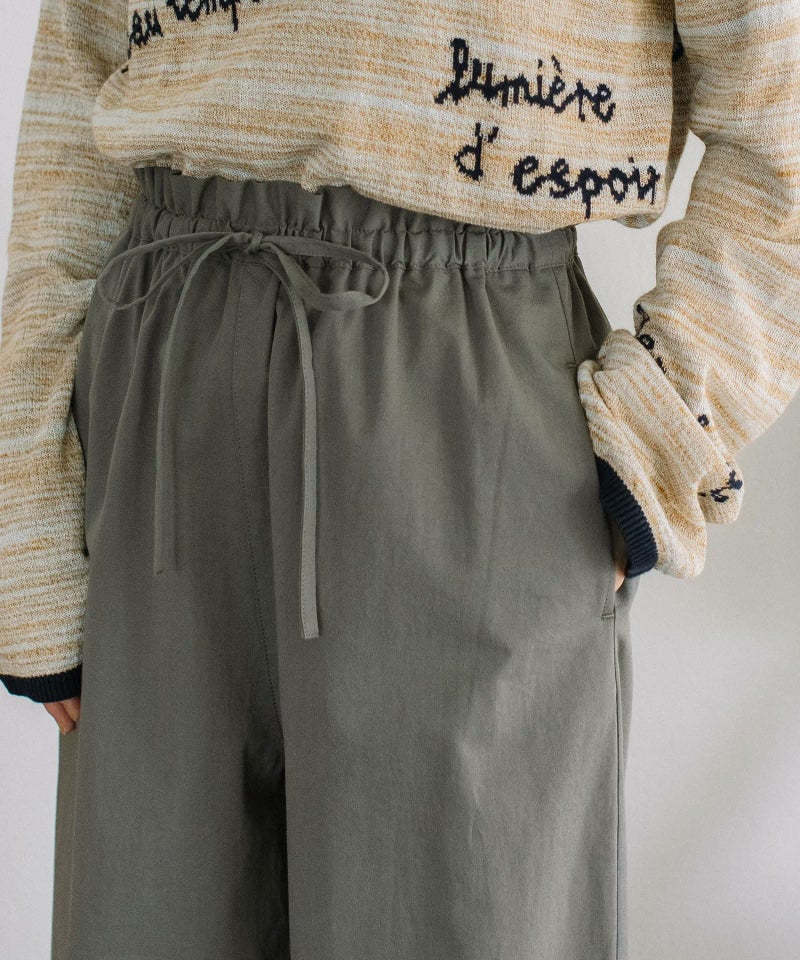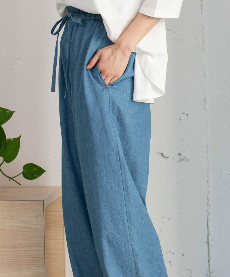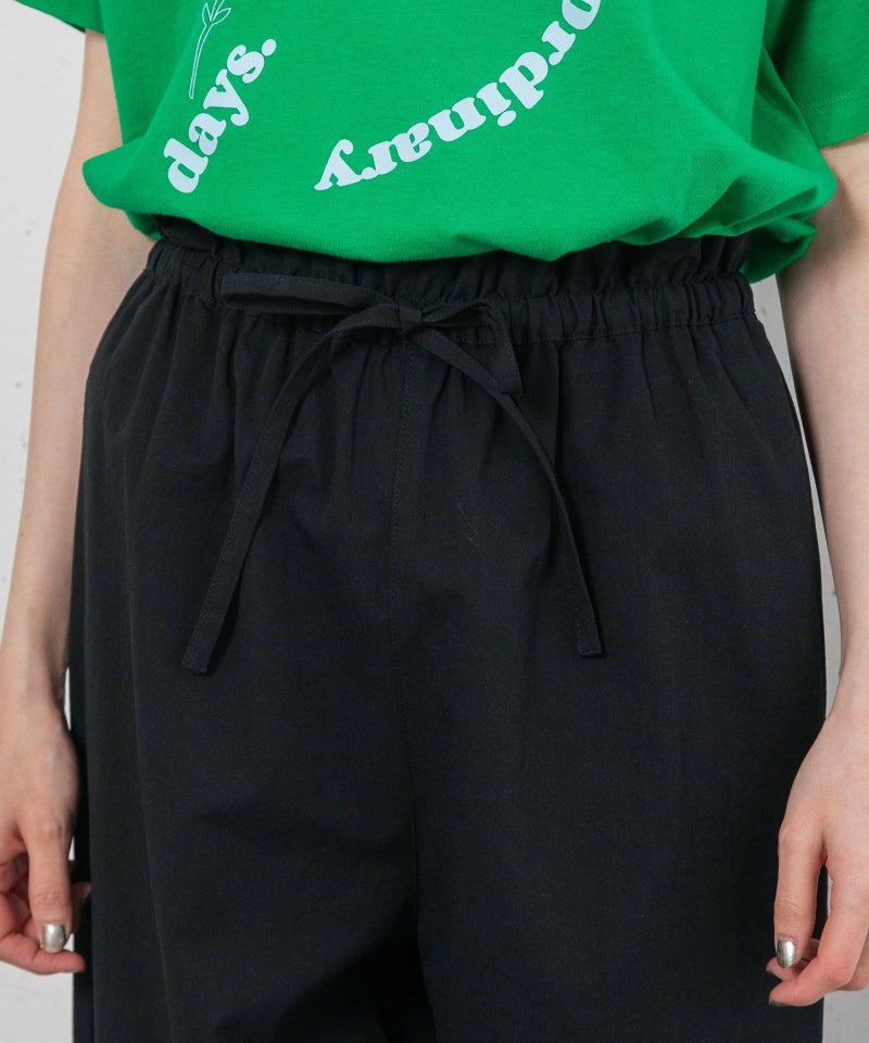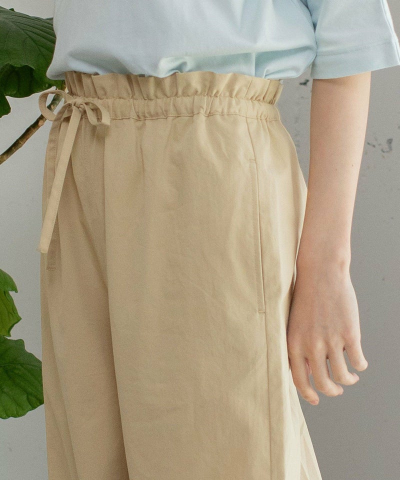 普段使いしやすい綿素材で仕立てたイージーパンツ。ワンピースの下にも合わせやすいシンプルなデザインです。ウエストのフリルがトップスインした時のアクセントに。ぐるりとゴムのウエストで楽に履いて頂けます。ひもでサイズ感の調節もできます。両サイドにポケット付き。