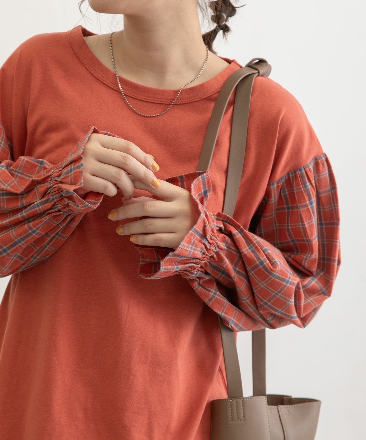 ・ボディは着心地のよい柔らかな綿天竺、袖にはチェックのシャツ素材を使用したトップス。袖口はゴム仕様でまくりやすく、こなれた雰囲気で着こなせます。