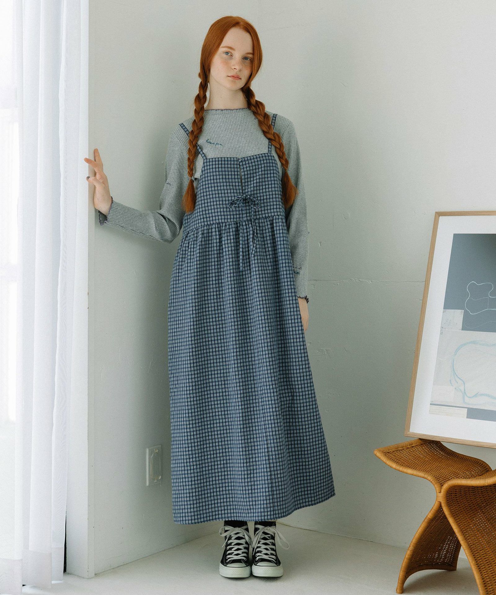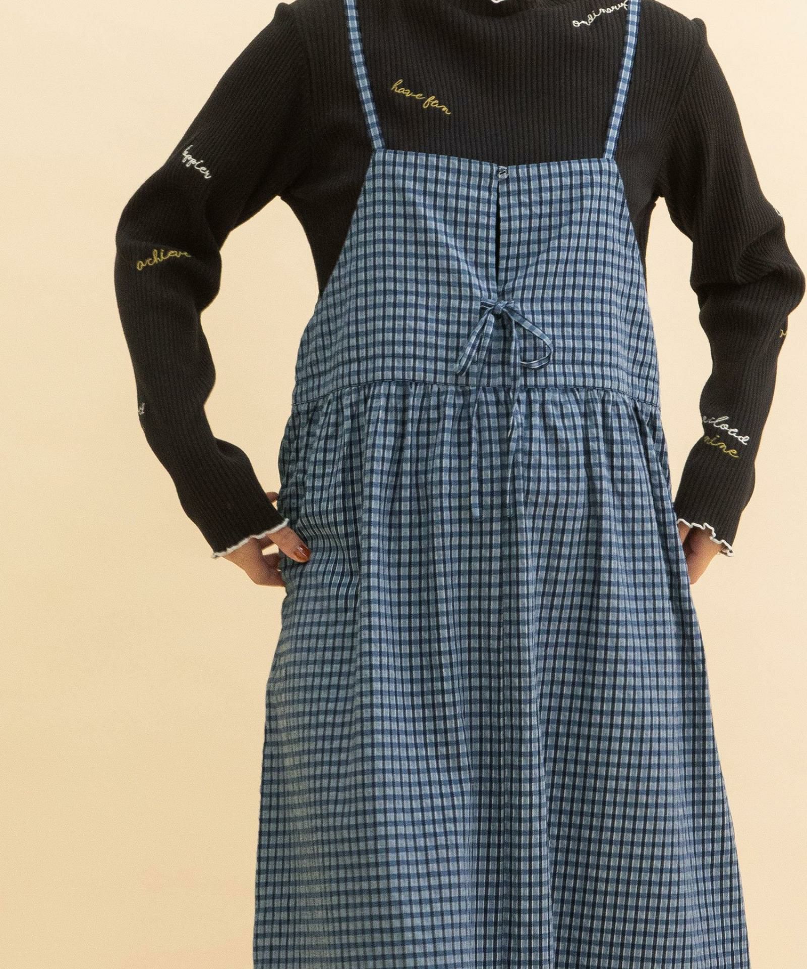 フロントリボンがアクセントのキャミワンピース。トレンド感のある肩紐細めのデザインで、フロントリボンはお好みで結んだり垂らしたりして頂けます。インナー次第で幅広く着回しができるアイテム。無地はやや張りのあるコットンナイロン素材を使用、チェックはぽこぽこした表面感の少し柔らかい素材です。アジャスターで長さの調節もできます。両サイドにポケットつき。