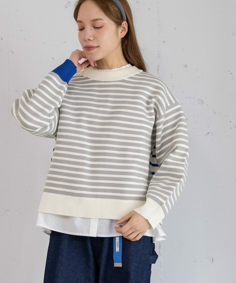 色とピッチの異なるボーダーを組み合わせた遊び心のあるカーディガン。前身頃は上側が無地のパネルボーダーにしています。カーディガンとしてはもちろん、ボタンをとめたままプルオーバーとしても着られます。前後両面で着用可能です。ポリエステル糸を使用して程よくハリを持たせ、シルエットが綺麗に出るのもポイントです。